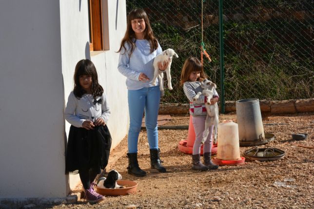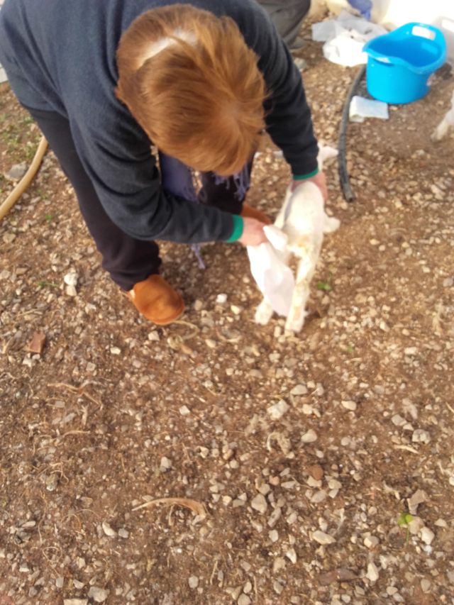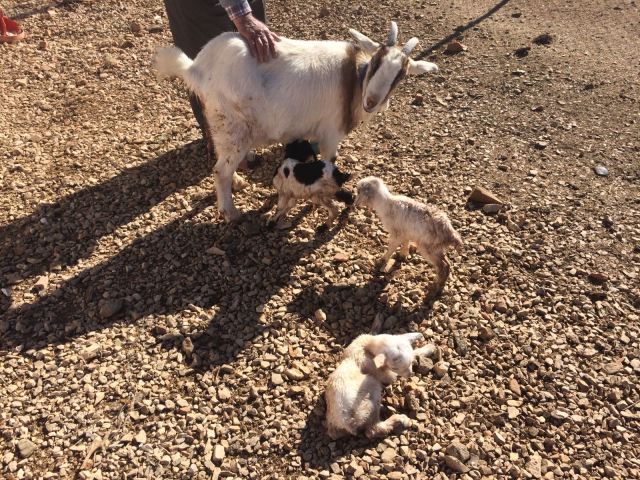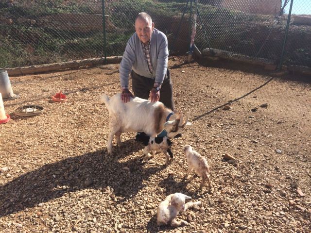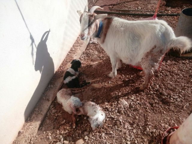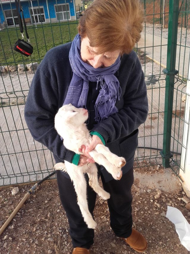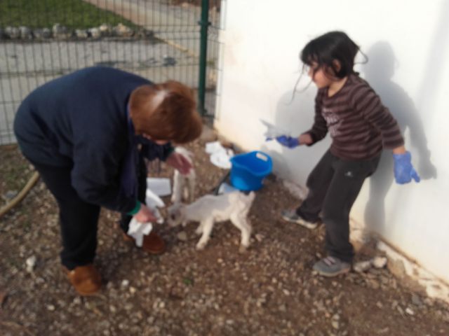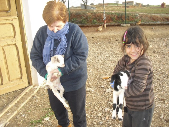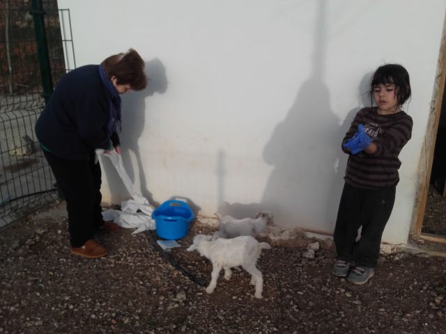 Un gran acontecimiento ha sucedido en la residencia: Lucy, la cabrica ha tenido dos cabritillos y una cabritilla….y estamos super-entretenidos!!! Santiago asistió al parto, Nayara y Lina se empeñaron al día siguiente que había que lavar el culito a los cabritillos y se pusieron manos a la obra con guantes, esponja jabonosa y papel para secar!! increíble el cuadro de las dos en tan difícil tarea. Además, vinieron a verlos también mis sobrinas y,  los abuelos disfrutaron por partida doble: niños y animales.  Todos los días un montón de abuelos acuden a verlos y a acariciar a toda la familia caprina, en la próxima publicación os pongo las fotos de los abuelos con los cabritillos que han hecho los familiares que, por supuesto también disfrutan… Una tarde que estaba dando biberón a los cabritillos aparecieron Consuelo y M@ Pilar por allí a ver cómo les daba de comer y les puse a uno de los cabritillos por la verja y les daban unos besicos…qué tierno y cuánto disfruté y me reí…