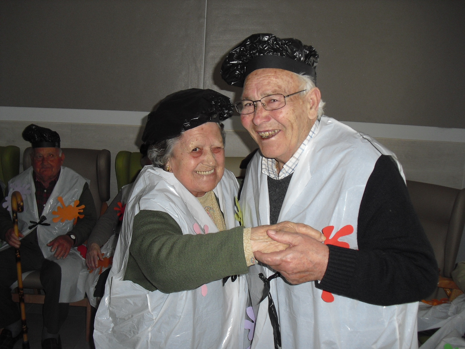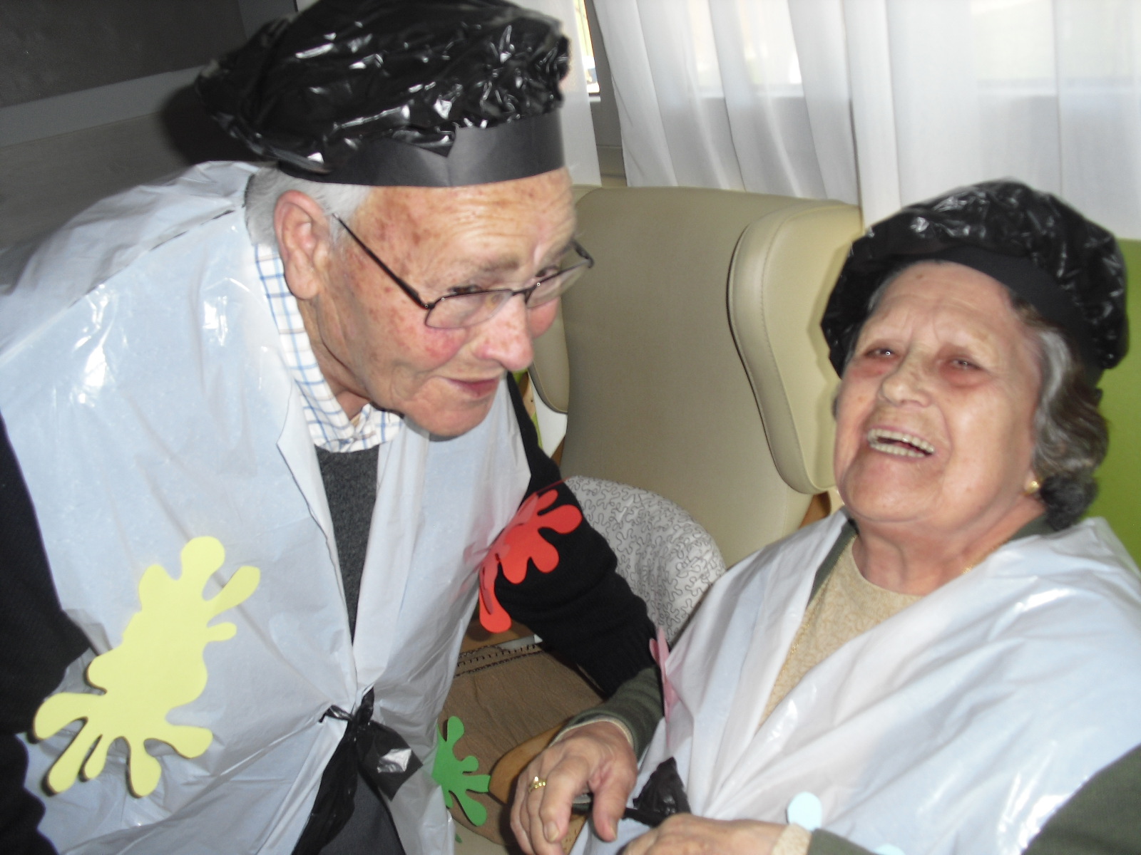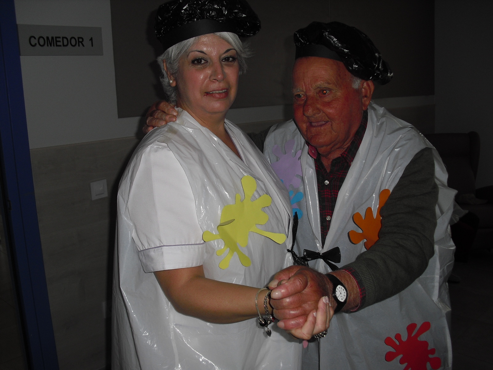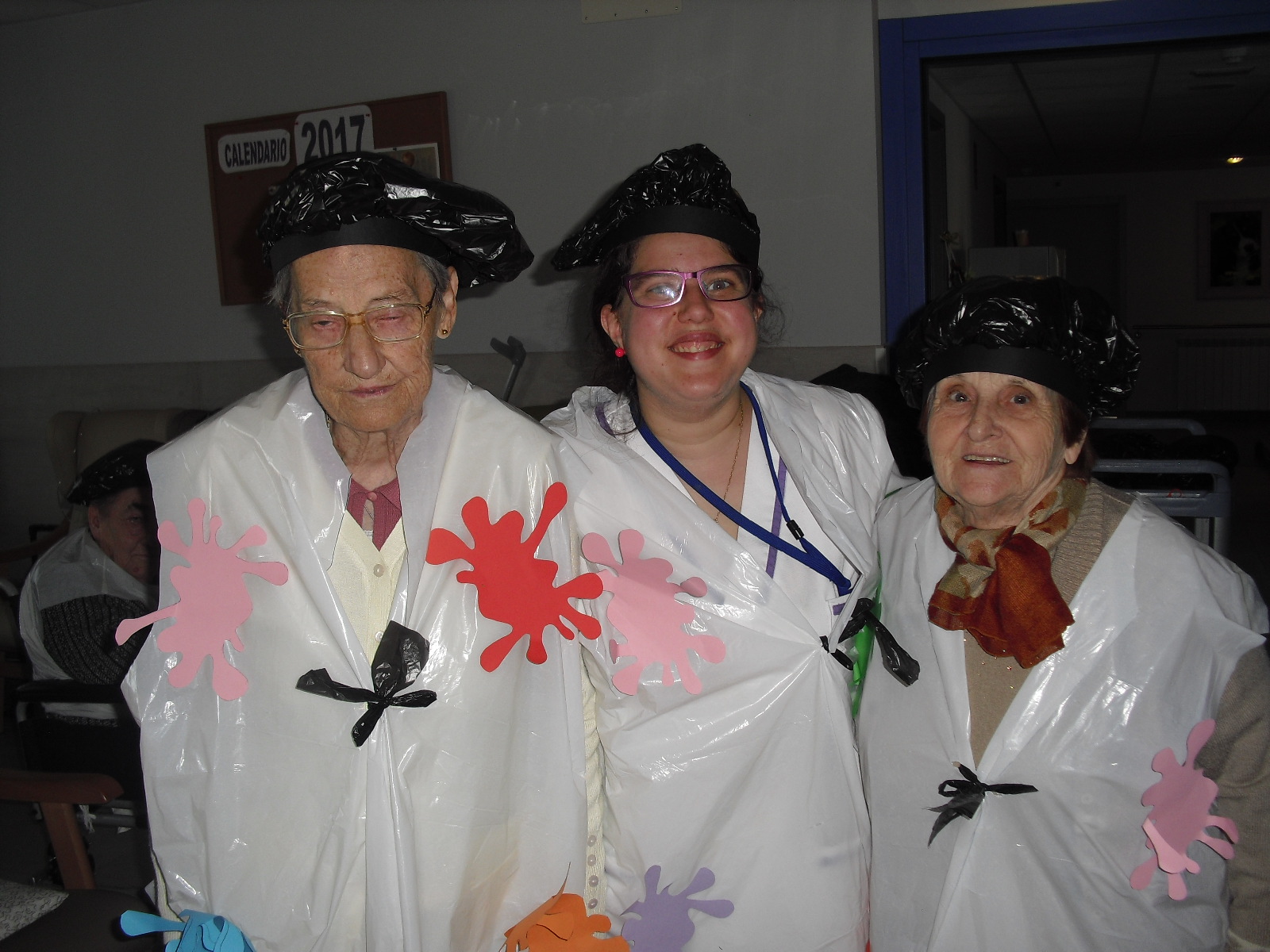 Nosotros, como vamos a marcha lenta, pues no tenemos prisa a nada, a estas edades hay que ir poquito a poquito!!! Normalmente vamos en fechas acorde con las celebraciones pero esta vez los carnavales fuimos dos semanas después pero todo nos salió divinamente. Laura trabajó codo a codo con Pilar, una de nuestras residentes que de profesión fue profesora de costura, y confeccionaron los disfraces de pintores y acabamos con una fiesta. Me tuve que poner el sombrero y el poncho de Pablo, pues me lo pidió tantas veces que le hice caso, ese es el motivo por el cual mi disfraz no pega nada de nada con el resto… es una satisfacción verles sonreír y pasar un buen rato y si para terminar les pones buena merienda te suben al altar!!!!!!!!!!