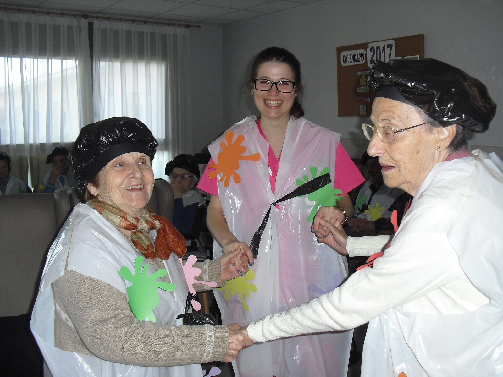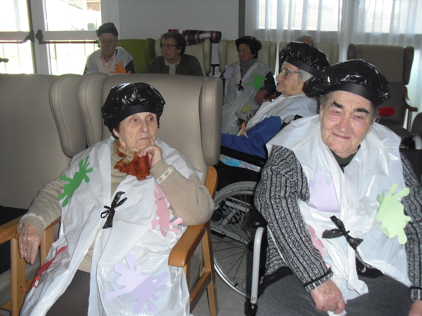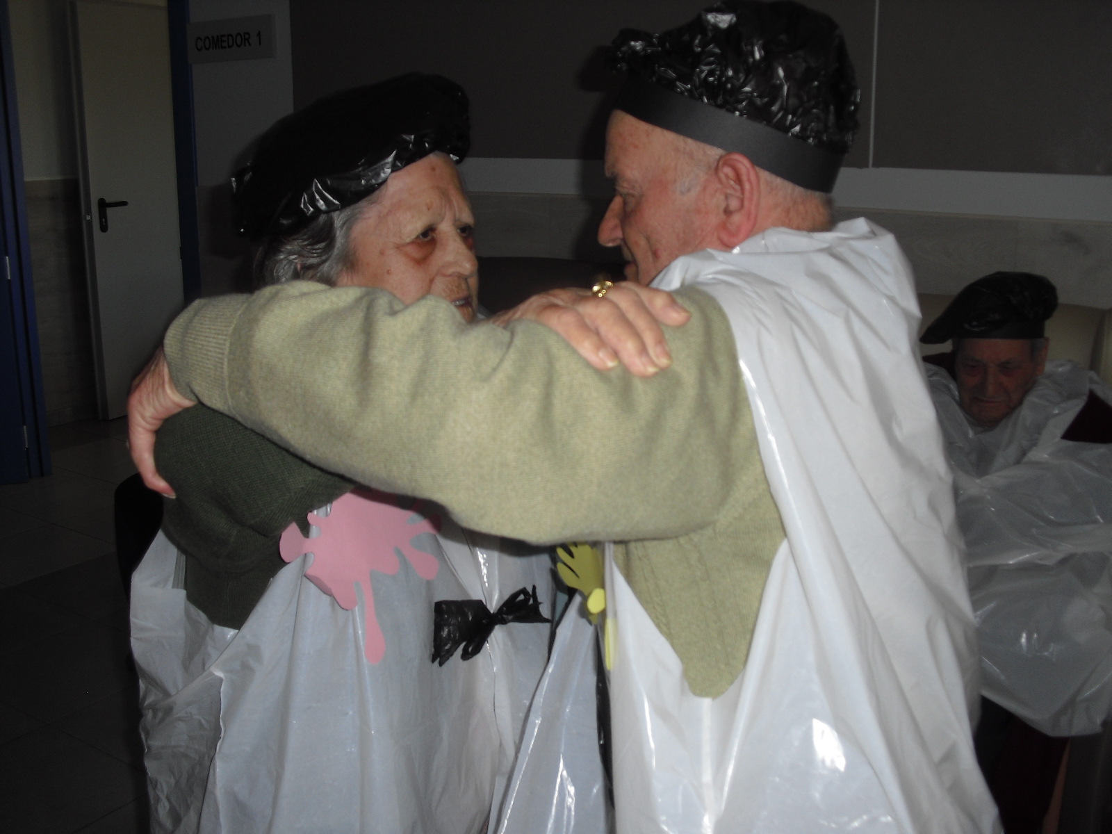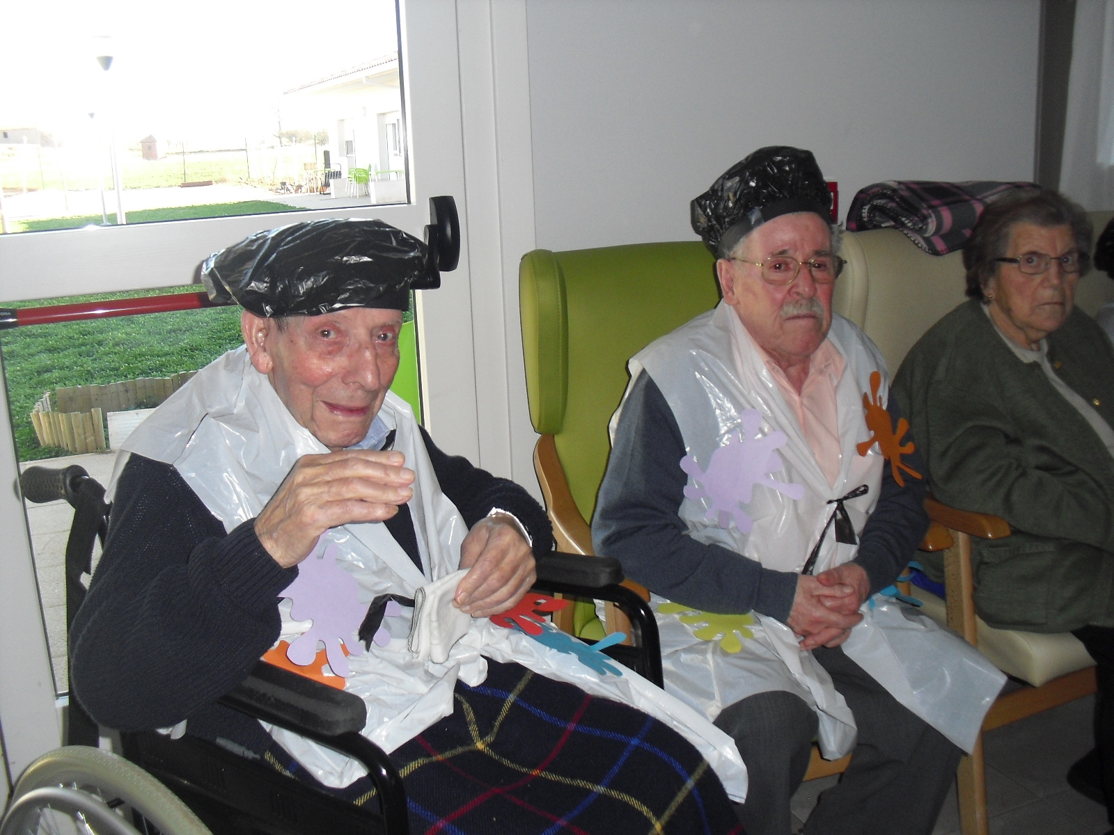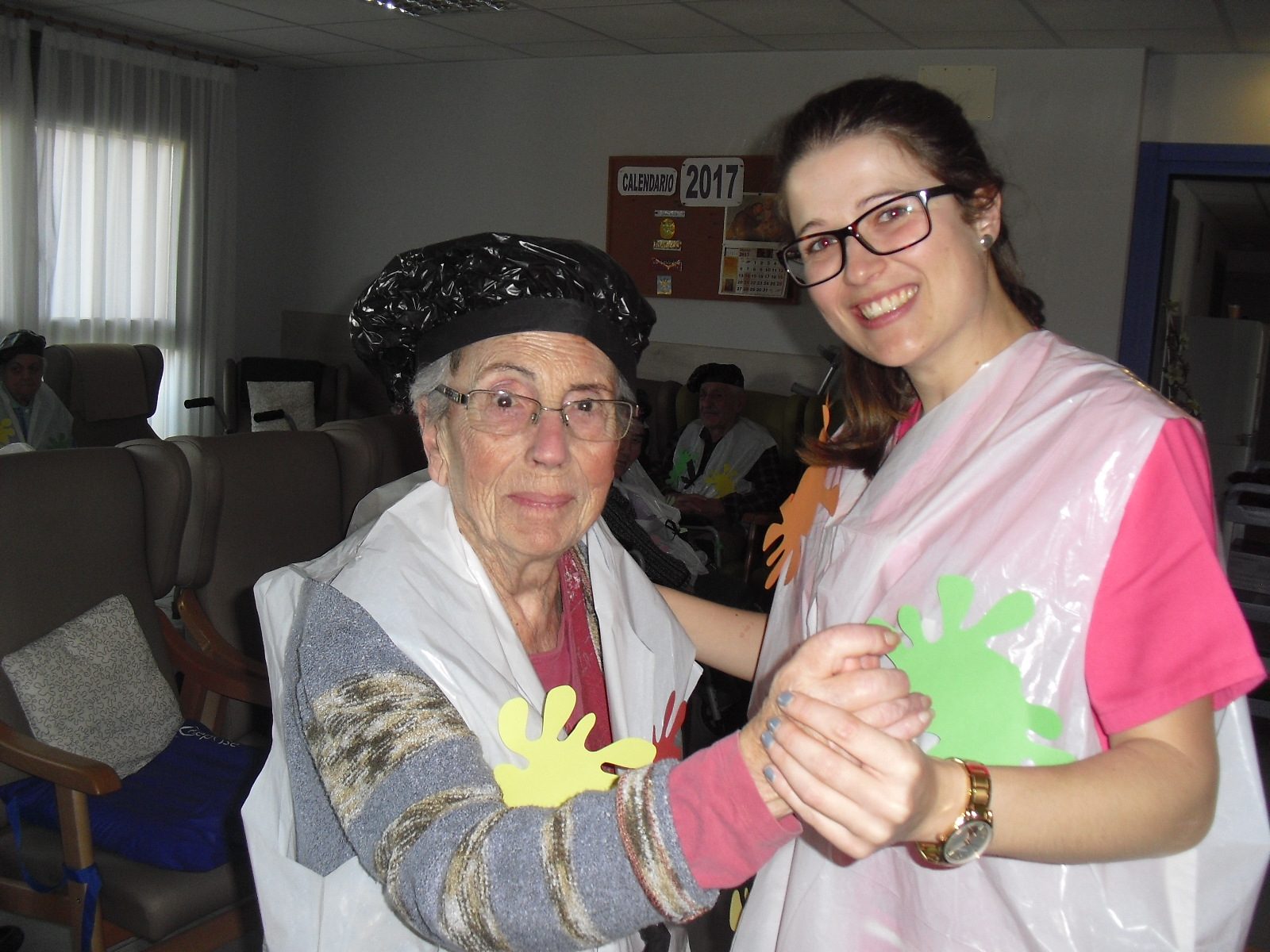 Nosotros, como vamos a marcha lenta, pues no tenemos prisa a nada, a estas edades hay que ir poquito a poquito!!! Normalmente vamos en fechas acorde con las celebraciones pero esta vez los carnavales fuimos dos semanas después pero todo nos salió divinamente. Laura trabajó codo a codo con Pilar, una de nuestras residentes que de profesión fue profesora de costura, y confeccionaron los disfraces de pintores y acabamos con una fiesta. Me tuve que poner el sombrero y el poncho de Pablo, pues me lo pidió tantas veces que le hice caso, ese es el motivo por el cual mi disfraz no pega nada de nada con el resto… es una satisfacción verles sonreír y pasar un buen rato y si para terminar les pones buena merienda te suben al altar!!!!!!!!!!
