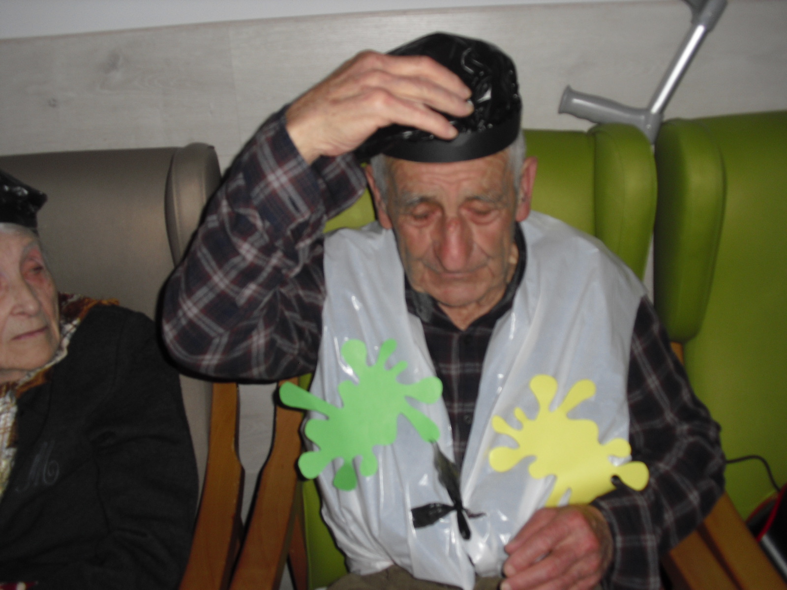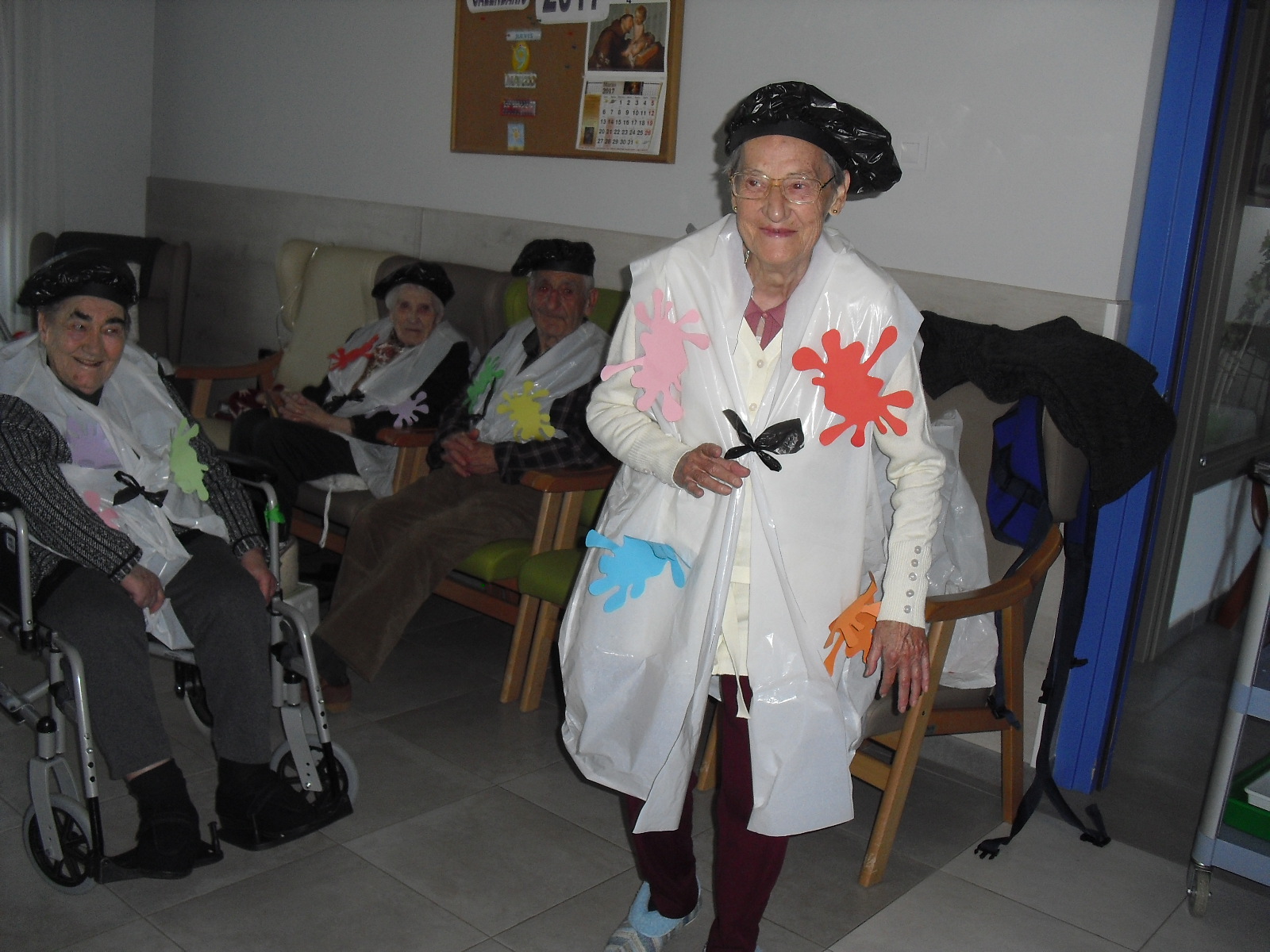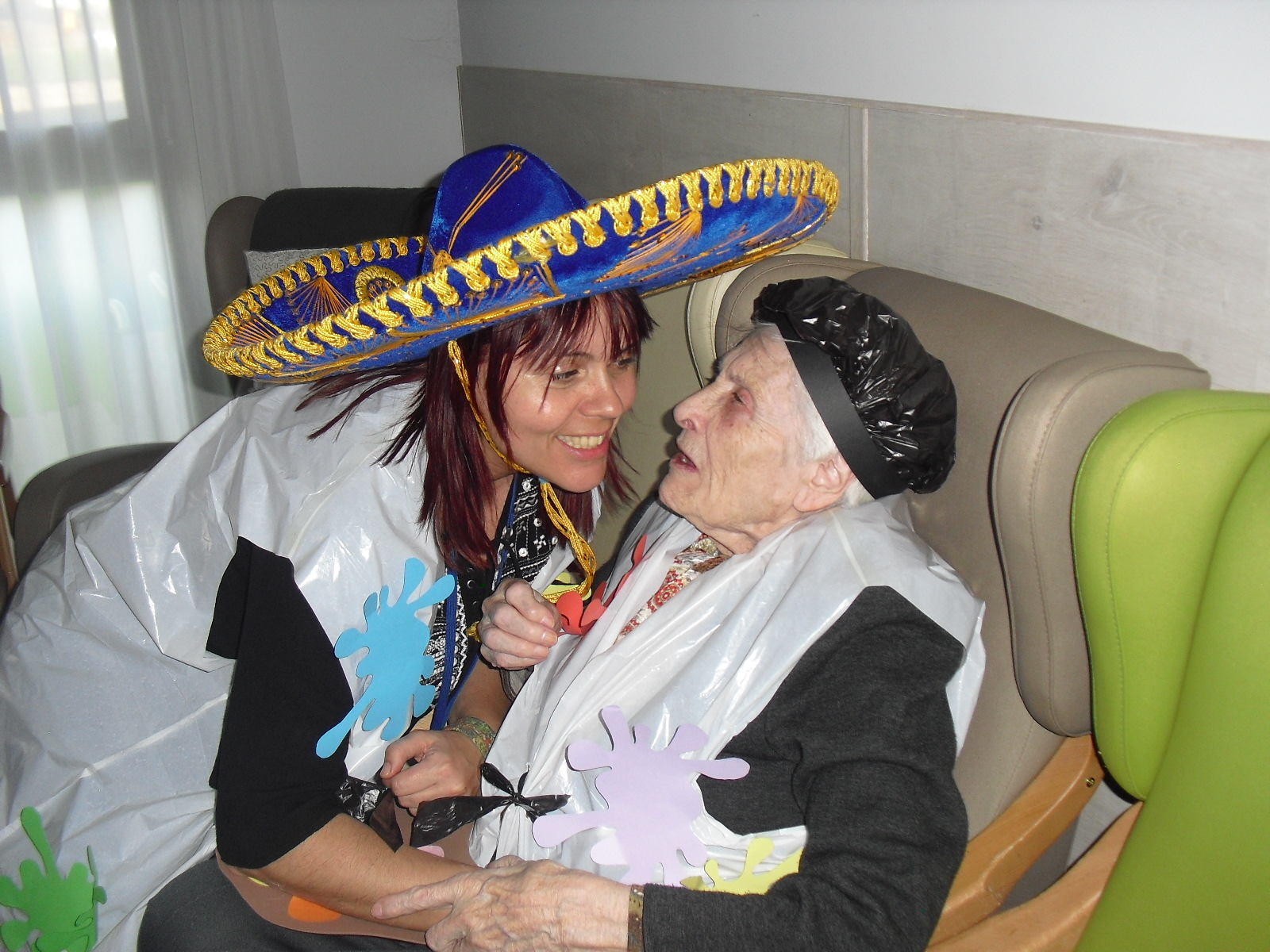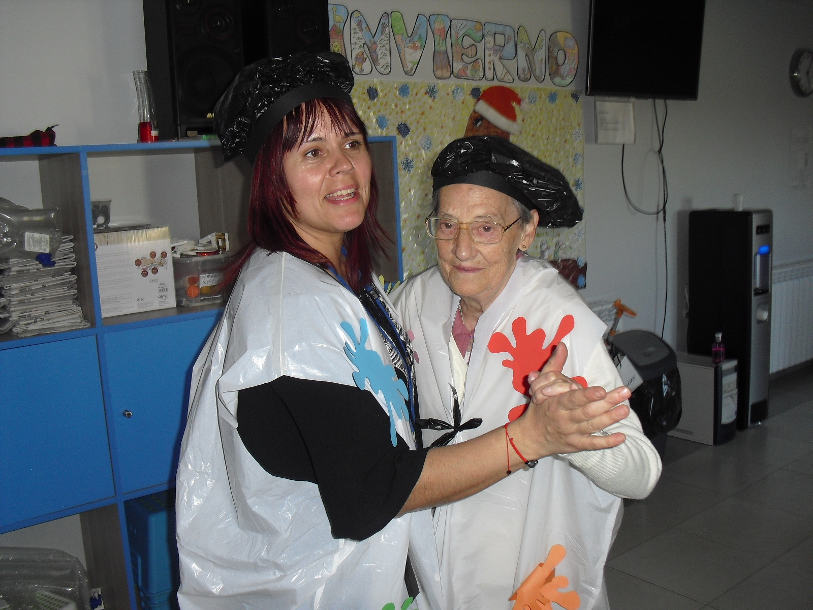 Nosotros, como vamos a marcha lenta, pues no tenemos prisa a nada, a estas edades hay que ir poquito a poquito!!! Normalmente vamos en fechas acorde con las celebraciones pero esta vez los carnavales fuimos dos semanas después pero todo nos salió divinamente. Laura trabajó codo a codo con Pilar, una de nuestras residentes que de profesión fue profesora de costura, y confeccionaron los disfraces de pintores y acabamos con una fiesta. Me tuve que poner el sombrero y el poncho de Pablo, pues me lo pidió tantas veces que le hice caso, ese es el motivo por el cual mi disfraz no pega nada de nada con el resto… es una satisfacción verles sonreír y pasar un buen rato y si para terminar les pones buena merienda te suben al altar!!!!!!!!!!