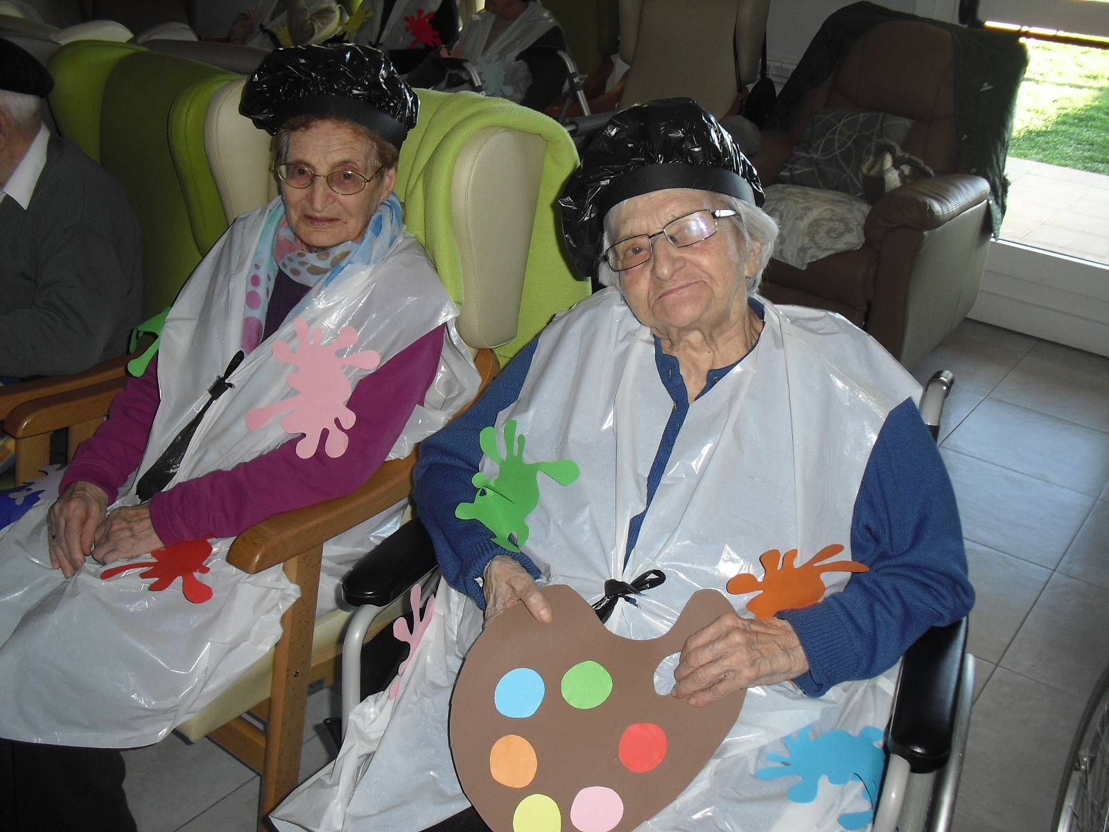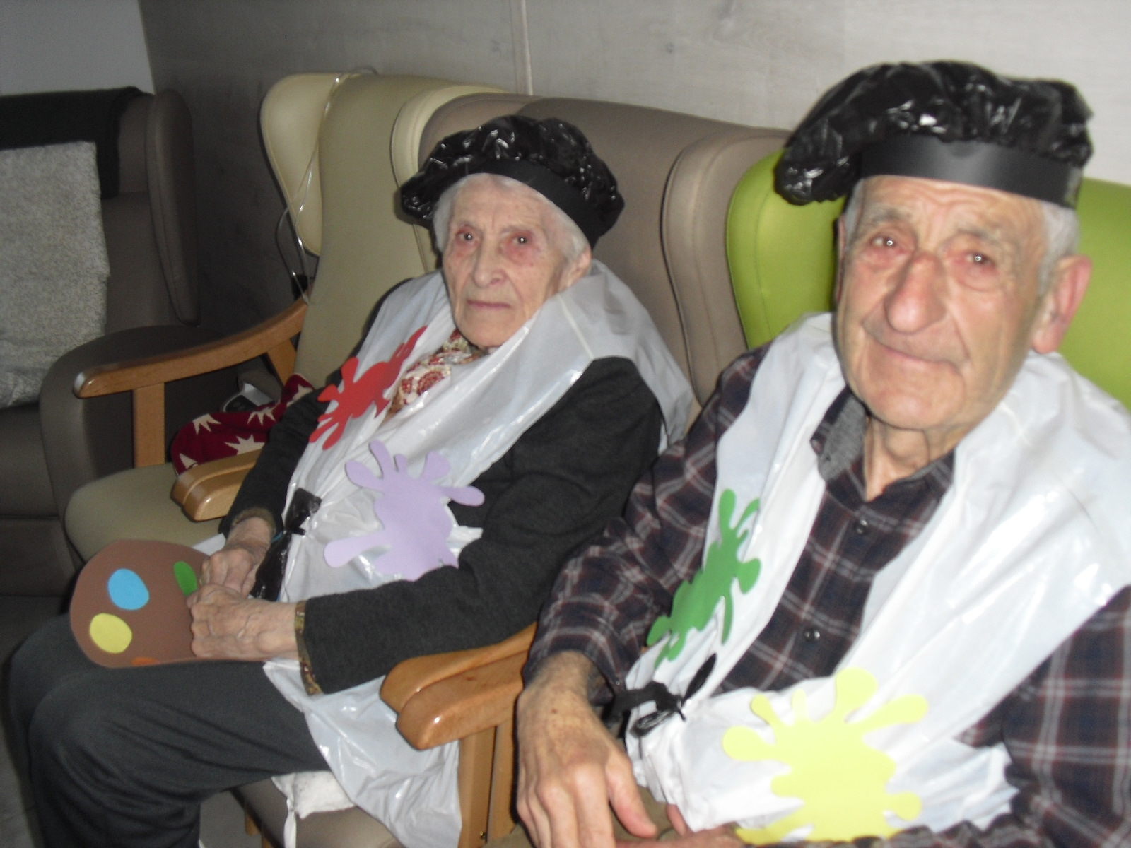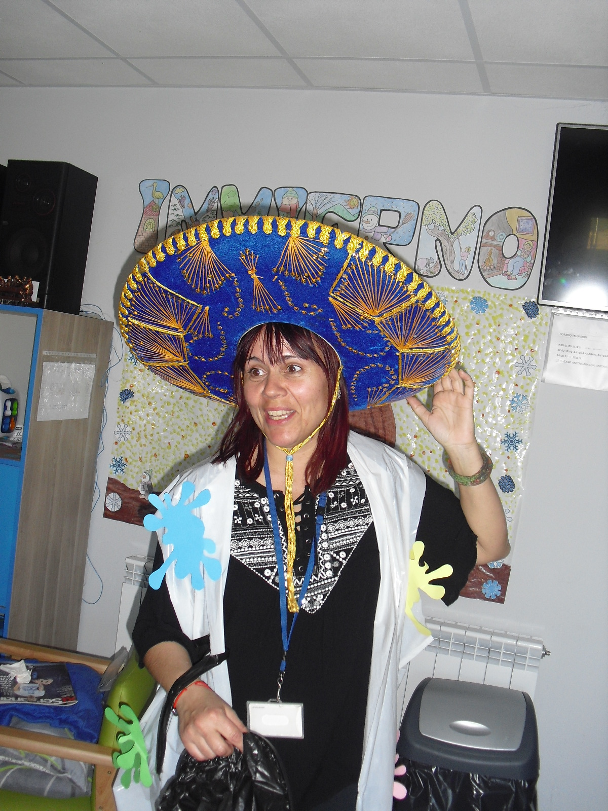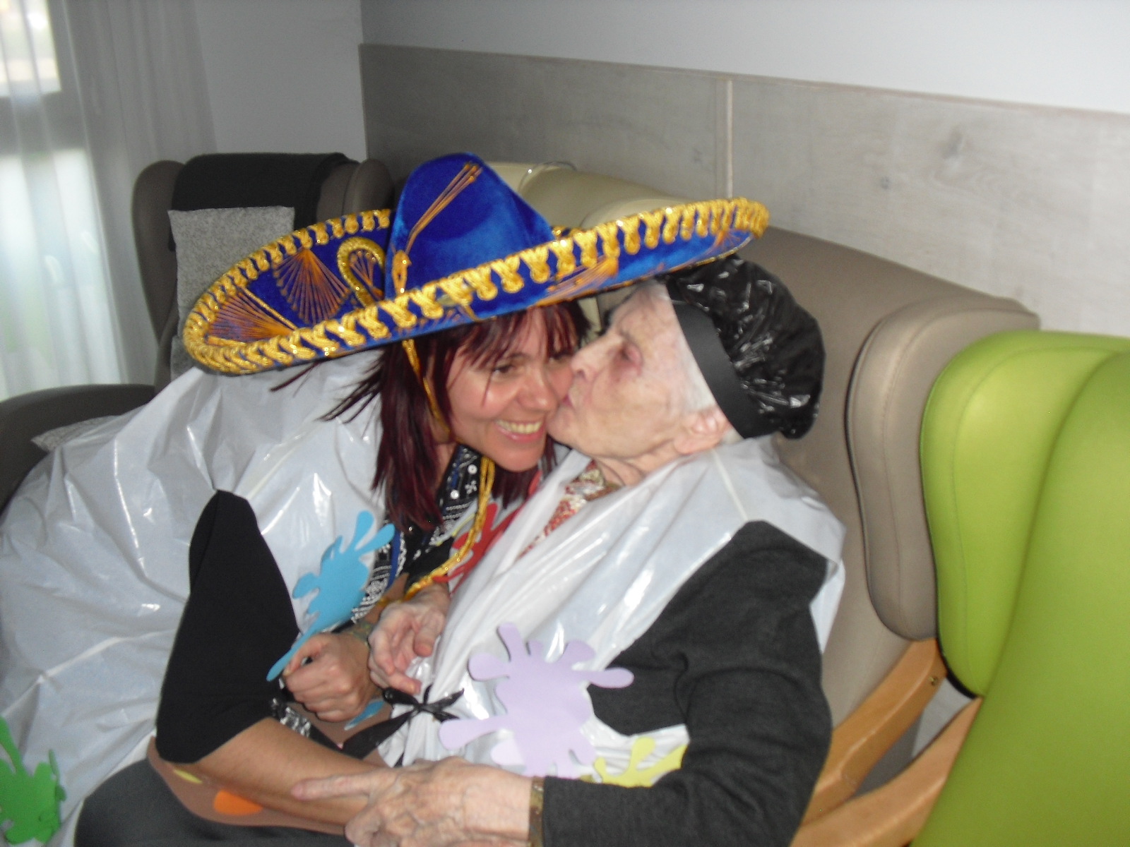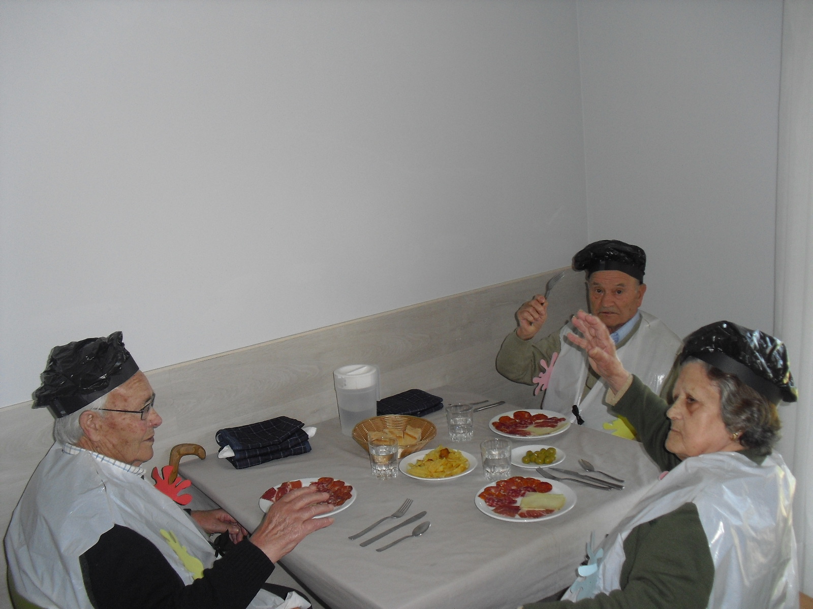 Nosotros, como vamos a marcha lenta, pues no tenemos prisa a nada, a estas edades hay que ir poquito a poquito!!! Normalmente vamos en fechas acorde con las celebraciones pero esta vez los carnavales fuimos dos semanas después pero todo nos salió divinamente. Laura trabajó codo a codo con Pilar, una de nuestras residentes que de profesión fue profesora de costura, y confeccionaron los disfraces de pintores y acabamos con una fiesta. Me tuve que poner el sombrero y el poncho de Pablo, pues me lo pidió tantas veces que le hice caso, ese es el motivo por el cual mi disfraz no pega nada de nada con el resto… es una satisfacción verles sonreír y pasar un buen rato y si para terminar les pones buena merienda te suben al altar!!!!!!!!!!