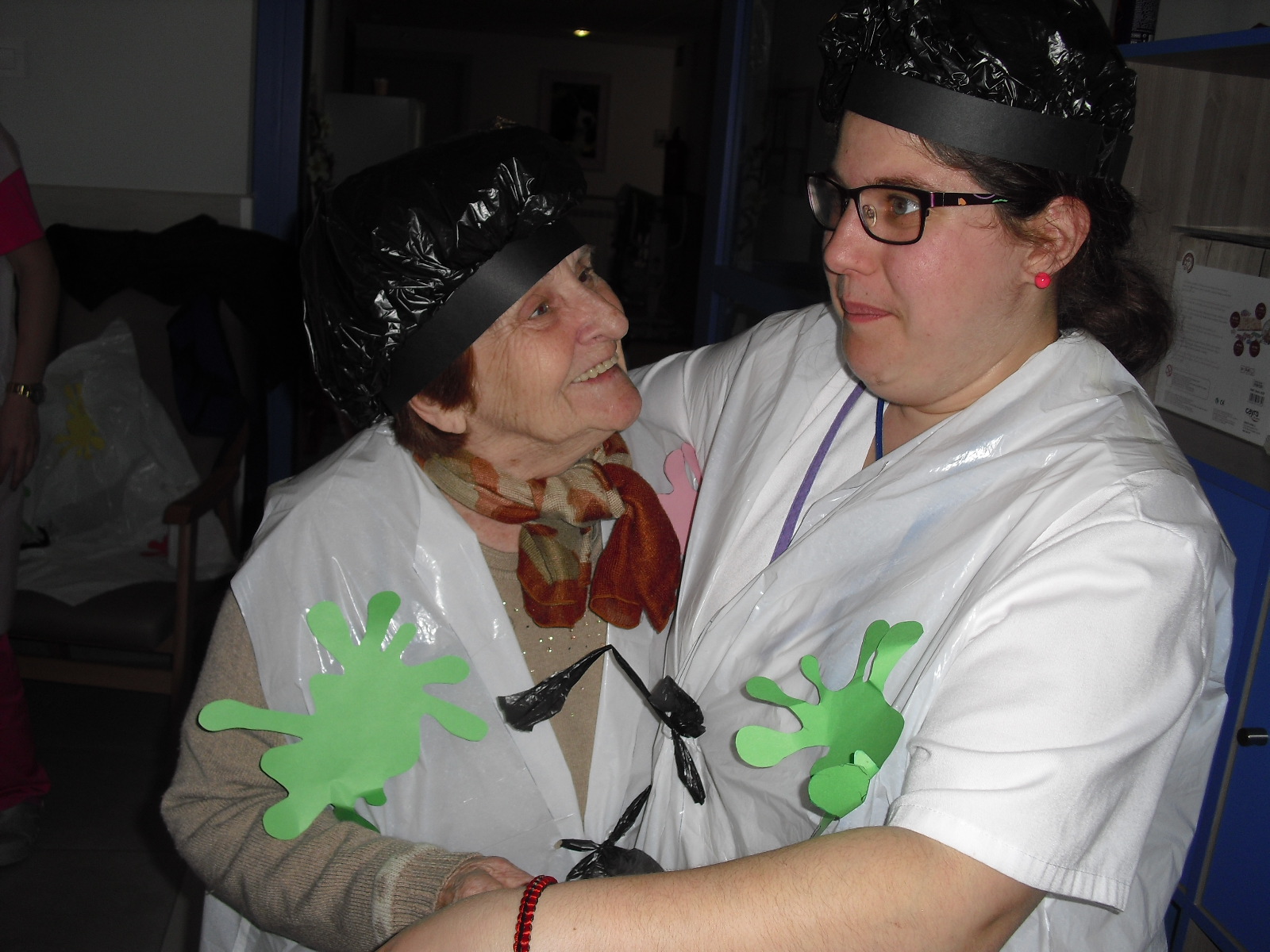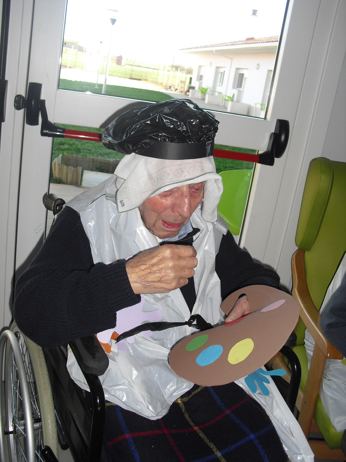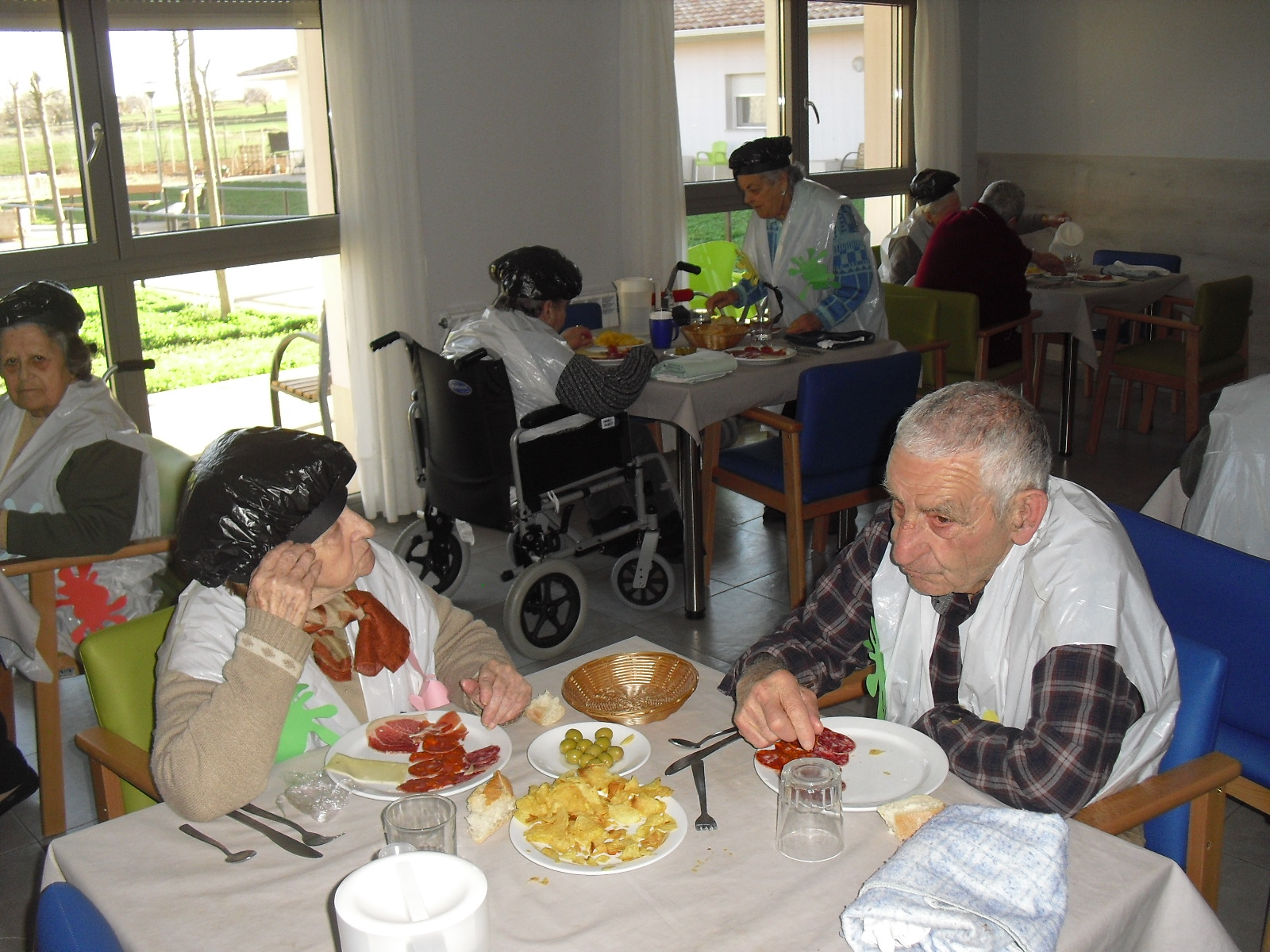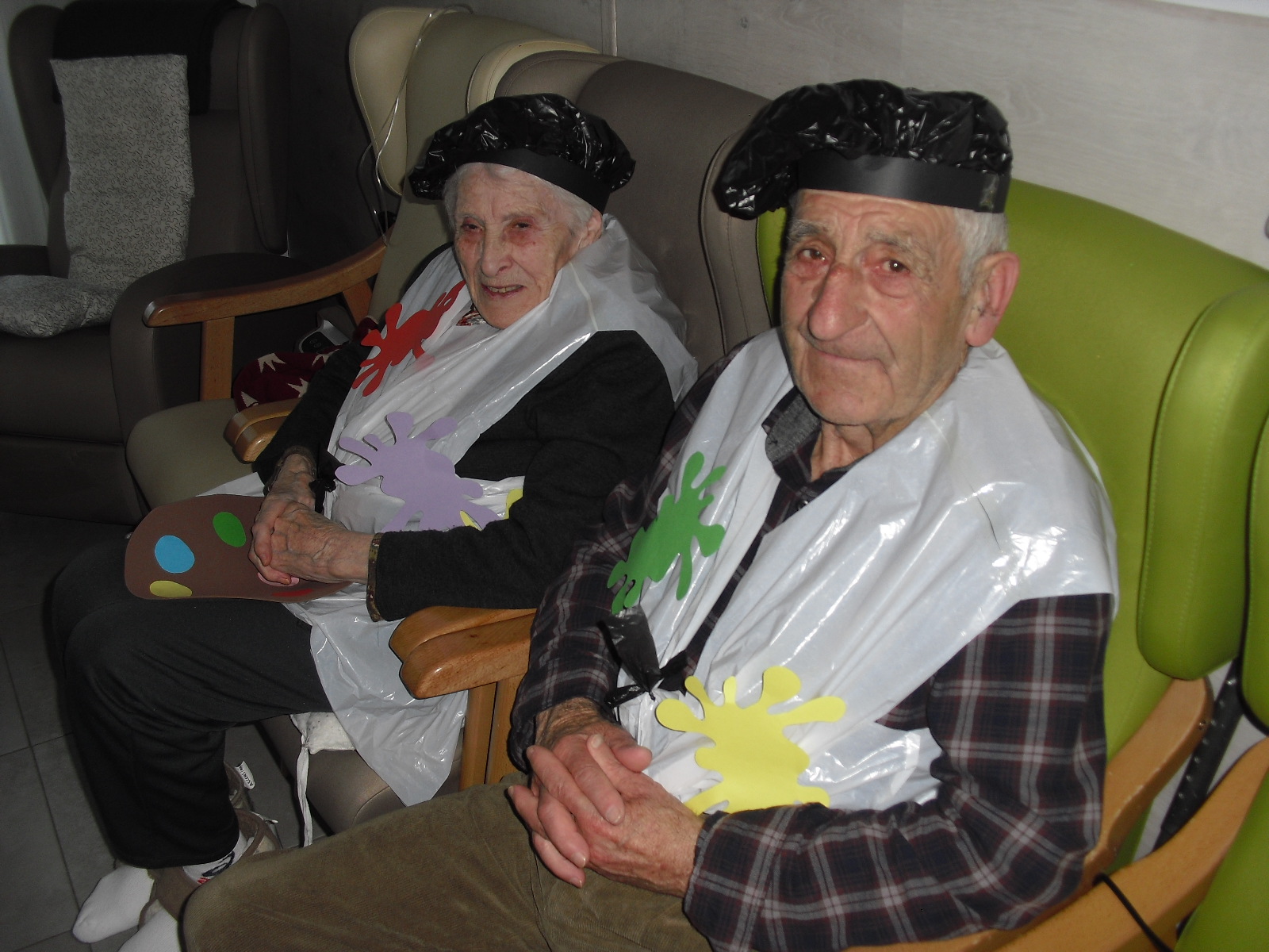 Nosotros, como vamos a marcha lenta, pues no tenemos prisa a nada, a estas edades hay que ir poquito a poquito!!! Normalmente vamos en fechas acorde con las celebraciones pero esta vez los carnavales fuimos dos semanas después pero todo nos salió divinamente. Laura trabajó codo a codo con Pilar, una de nuestras residentes que de profesión fue profesora de costura, y confeccionaron los disfraces de pintores y acabamos con una fiesta. Me tuve que poner el sombrero y el poncho de Pablo, pues me lo pidió tantas veces que le hice caso, ese es el motivo por el cual mi disfraz no pega nada de nada con el resto… es una satisfacción verles sonreír y pasar un buen rato y si para terminar les pones buena merienda te suben al altar!!!!!!!!!!