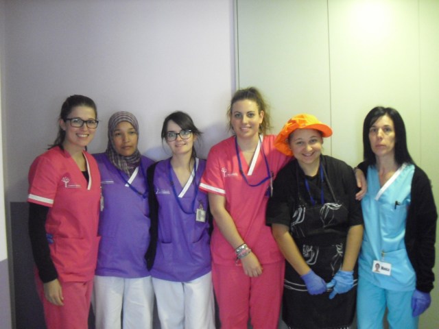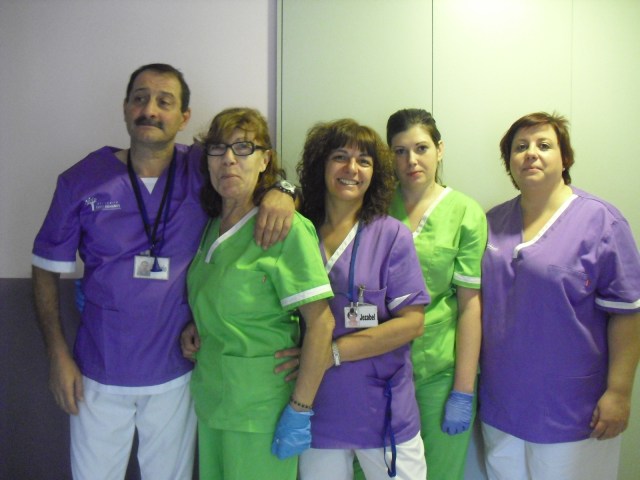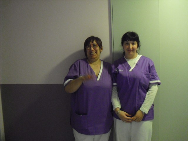 Para este nuevo año que va a empezar hemos cambiado el color de los uniformes de las gerocultoras y auxiliares de ayuda a domicilio al morado, el verde lima para la limpieza, azul para servicio de enfermería y  el rosa para fisio y terapia. Este logotipo lo diseñó Monica, le proporcioné un dibujo que me gustaba y le expliqué cómo quería que fuese la empresa… y ella lo creó. El color morado es el color de la empresa y de nuestro logotipo, por eso lo he pintado en la fachada de las casas de los trabajadores porque la empresa está creciendo y poco a poco vamos consiguiendo todas las metas. Y me he subido tan arriba a pintarlo porque mi empresa es un esfuerzo continuo, día a día lucho por ella y verlo tan alto me lo recuerda y me llena de energía!!!!!!! He hecho unas fotos a las chicas y a Antonio con esos uniformes nuevos, faltan Pilar, Mariola, Inma y Mª Carmen. Nos han gustado mucho a todos y todas, sobre todo a los abuelos que les han dicho que les favorecen mucho. Este año 2018 que empezaremos en mes y medio está lleno de ilusión y de proyectos y poco a poco voy creando el equipo de trabajo que buscaba. Todavía falta pero cada vez estamos más cerca de conseguirlo. Espero os gusten !!!!!