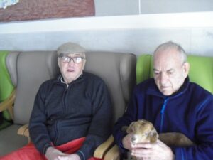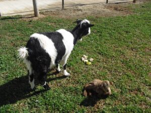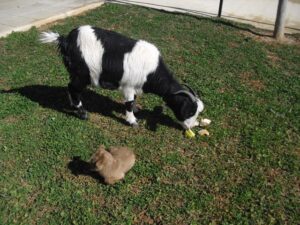 Este año nuestra cabra Esther ha tenido una cabritilla: Felicidad, pero nació muy débil y no podía ponerse de pie para mamar, así que la metimos al despacho a cuidados intensivos, al lado del radiador para darle calor y darle leche de su madre con jeringuilla. Todas le dimos alguna jeringuilla y algunos de los abuelos la observaban desde la puerta acristalada del despacho…como esos bebés que están en incubadora y se observan desde el cristal deseando que se pongan bien. Al final de la tarde Felicidad ya se ponía de pie y se la devolvimos a su madre pues la quería y es con quién mejor está. A los pocos días nos trajeron una cabrica huérfana pues su madre la repudió y venía desnutrida…los abuelos al ver que Esther tenía otra cabritilla del mismo color creyeron que la había parido también…un poco de lío se armó pero los tuvo entretenidos. Al final Tady, la nueva cabritilla, como Esther no la quería al no ser suya y, además no tenía leche suficiente para las dos pues la tengo en casa y Nayara la ha adoptado y le da los biberones. Cuando empiece a subirse por el sofá tendré que bajarla la jardín!!!!!!!!!!!!!! La sigue como si fuese su madre!!! Las fotos en las que sale con la madre es Felicidad y la que sale con los abuelos y en el cubo es Tady. Me faltaron de poner dos fotos del desfile que preparó Nayara a Victorino, le hizo ella sola el disfraz con bolsas de basura y hasta le hizo zapatos…nos reímos un montón, creo que iba disfrazado de Agatha Ruiz de la Prada.