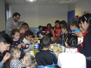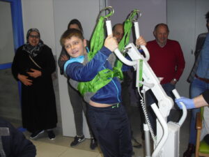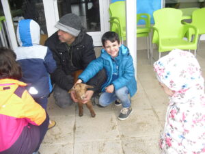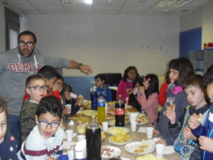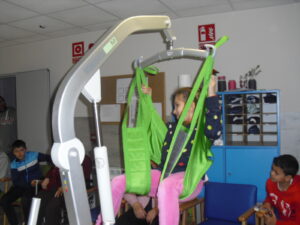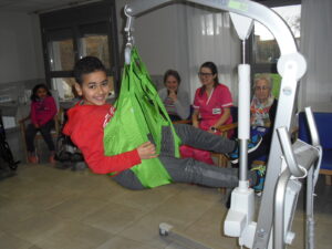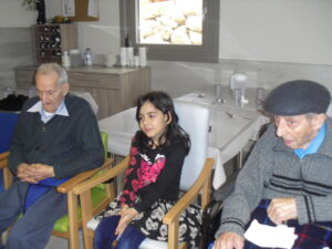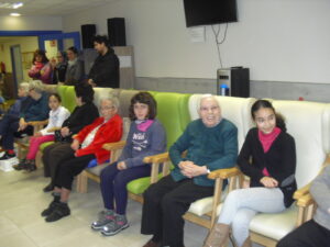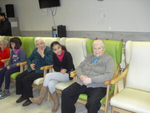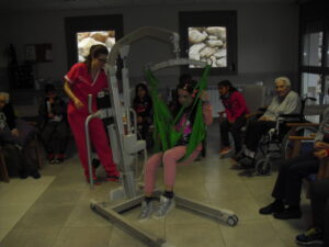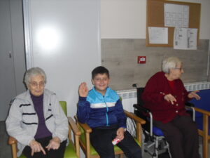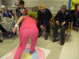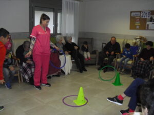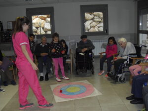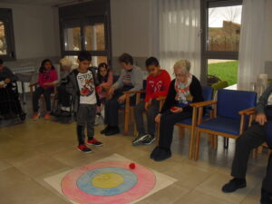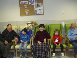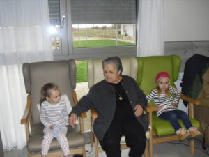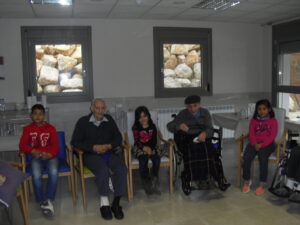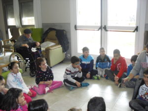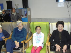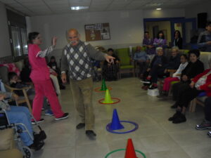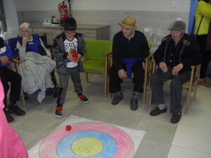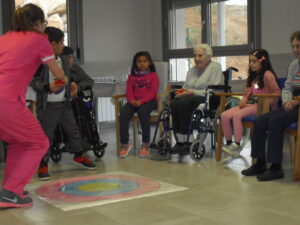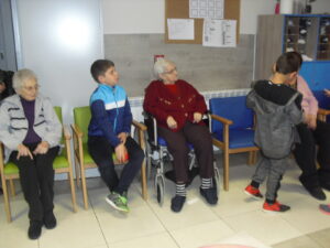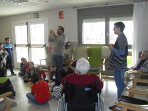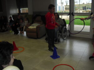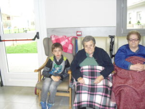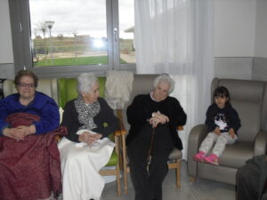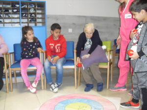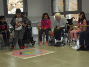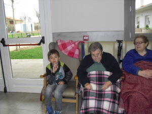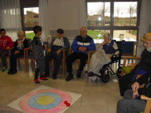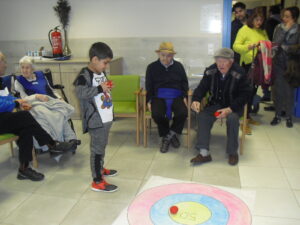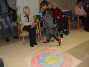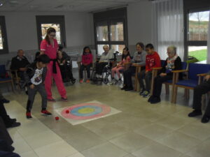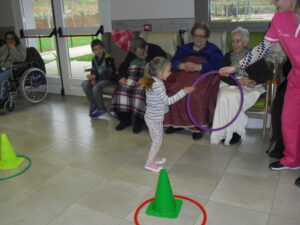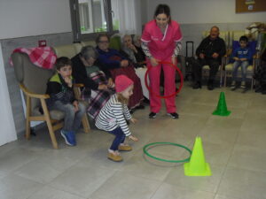 Una mañana superespecial!!!!! Damos las gracias al Colegio y a sus profesores por elegir la Residencia Campo Romanos como un lugar de excursión para traer a todo el alumnado. Agradecer a los padres y los niños por venir a dar un soplo de aire fresco a nuestra residencia, los abuelos sonrieron, los miraban embelesados, cautivados por tanta energía y juventud, algunos querían tocarlos como si fuesen grandes personalidades….una mañana intensa pues era extraño ver corriendo a tanto niño por los pasillos…acostumbradas a ver abuelitos que caminan, los que pueden, como caracoles!!! todo tiene su encanto… Bea y Laura prepararon dos grupos diferentes, sentaron a cada niño entre un abuelo. En una sala Bea jugaba con los conos y en la otra Laura con la diana. Por último tuvieron unas clases prácticas con las grúas de los abuelos para que viesen que nosotros aquí también nos lo pasamos muy bien!!!! Para finalizar y aunque, no se puede pagar de ninguna manera esa mañana que nos regalaron, les obsequiamos con un almuerzo!!!!!!!