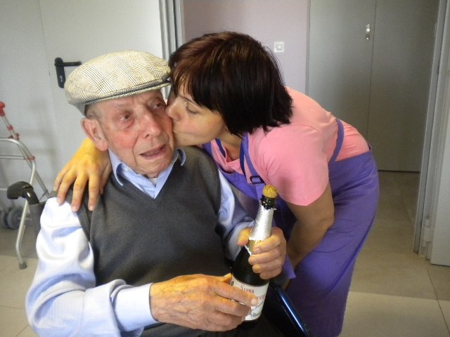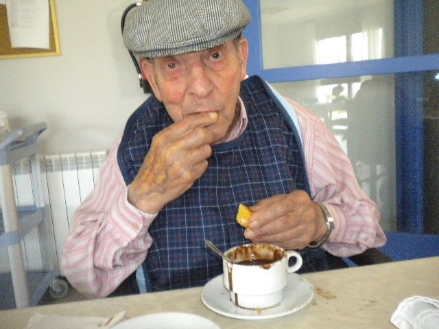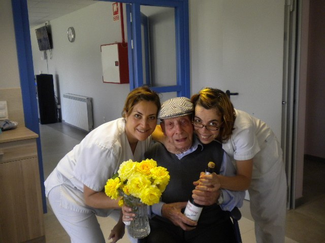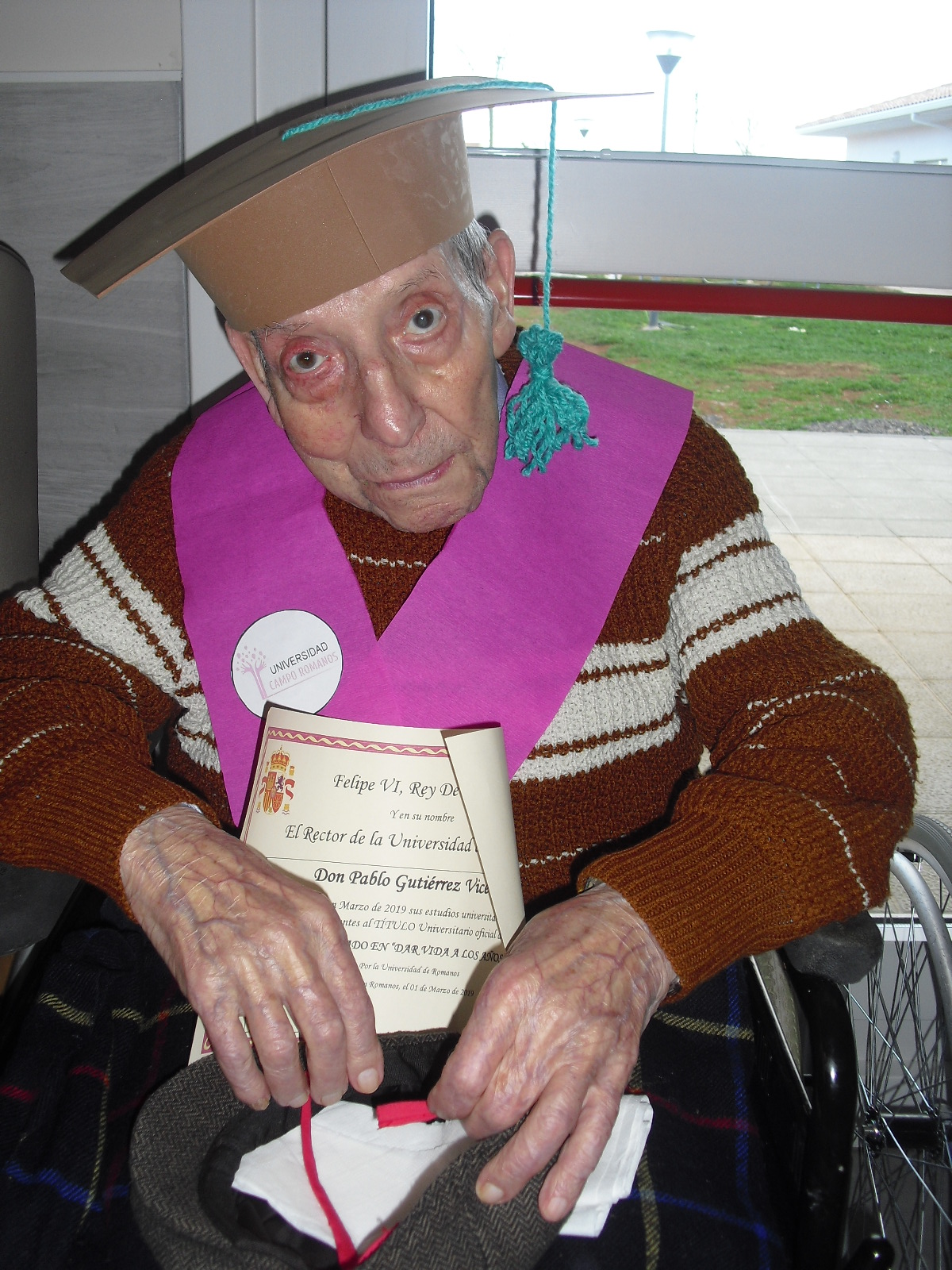 Publico hoy para despedir a Pablo, muy especial para nosotras ya que estaba conmigo desde 2015. No he conocido una persona que se agarrase tanto a la vida como él. Tenía un gran carácter que lo hacía único: genio y figura hasta la sepultura!!!. Llevaba un tiempo en pulso con la muerte y no le dió la real gana de darle ni un sólo segundo de los que tenía que vivir...Luchó hasta el último instante, muchos de nosotros al ver la cara de la muerte tan presente creo que cederíamos antes que él  y nos entregaríamos a ella...pero Pablo no!! Nunca daba su brazo a torcer y creo que llegó a aborrecer a la muerte de tanto esperarlo..., muy detallista, observador, muy devoto, alegre, perseverante, cabezota, en ocasiones déspota y condescendiente, generoso (regaló a la residencia el belén y los adornos de Navidad que todos los años ponemos), con una sonrisa de pícaro que sabía disfrutar de los buenos momentos como las excursiones, fiestas de disfraces (tenía un poncho y un sombrero mexicano que me puse en alguna ocasión en las fiestas porque me lo pedía y le hacía ilusión) y  las buenas comidas (la sidra El Gaitero le encantaba). Cuántas charlas tuve con él cuando se negaba a que le pusieran la grúa perjudicando la salud de las chicas, cuando no quería que alguna gerocultora le atendiese pues tenía sus preferidas....pero al final siempre me decía: lo que tú digas!!! y cedía porque me quería mucho y yo le daba unos besos enormes porque entraba en razón!!! Su hermano Blas, hasta que falleció,  era el que venía a verle con mucha frecuencia y le traía chocolate, pan y tortas de Daroca. Cuando se quedó solo yo le traía chocolate, bombones y bollos con chocolate y en mi despacho se los daba por las tardes sin que nadie se enterase...nos entraba la risa a los dos cuando venían a buscarle para cenar pues sabíamos que no tendría mucha hambre. Siempre tomabas el café con nosotros si me quedaba a comer en la residencia, a mi hija la adorabas y eres parte de mi familia!!! Pablo ha sido un placer tenerte conmigo y he cumplido las dos promesas que te hice!!! puedes descansar en paz...pero no me abandones nunca, de vez en cuando baja desde arriba y siéntate a mi lado en el despacho!!!