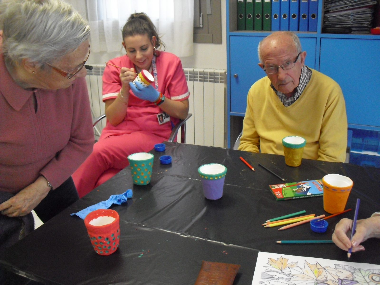 La concentración de nuestros abuelos es máxima en los talleres que están elaborando. Respecto al taller de arcilla han empezado a pintar esos vasos que han modelado de distintos colores y da gusto verles trabajar con tanto entusiasmo. Nuestra sala de terapia se usa al 100% con los talleres y las actividades, hay que dar un gran aplauso a Laura y Bea, porque se están esforzando mucho en pesar en esos talleres, en montarlos, ayudar a los abuelos a elaborarlos...estoy muy orgullosa de ellas. Aunque me imagino que para ellas, como para mí, la mayor satisfacción es verles a ellos disfrutando. Tenía pendiente hace mucho poner la foto de la hija de Claudio, Asun, probando la grúa de transferencia. Pienso que es importante que los familiares puedan probar las grúas y comprobar qué sienten sus familiares al utilizar estas herramientas que nos facilitan el trabajo, impiden hacerles daño en muchas ocasiones a la hora de movilizarlos y se pueden utilizar para rehabilitación. En la foto sale la grúa de transferencia, sólo para transferir al paciente de un sitio a otro, pero las bipedestadoras si que sirven para rehabilitación pues fortalecen la musculatura cada vez que se levanta al paciente.