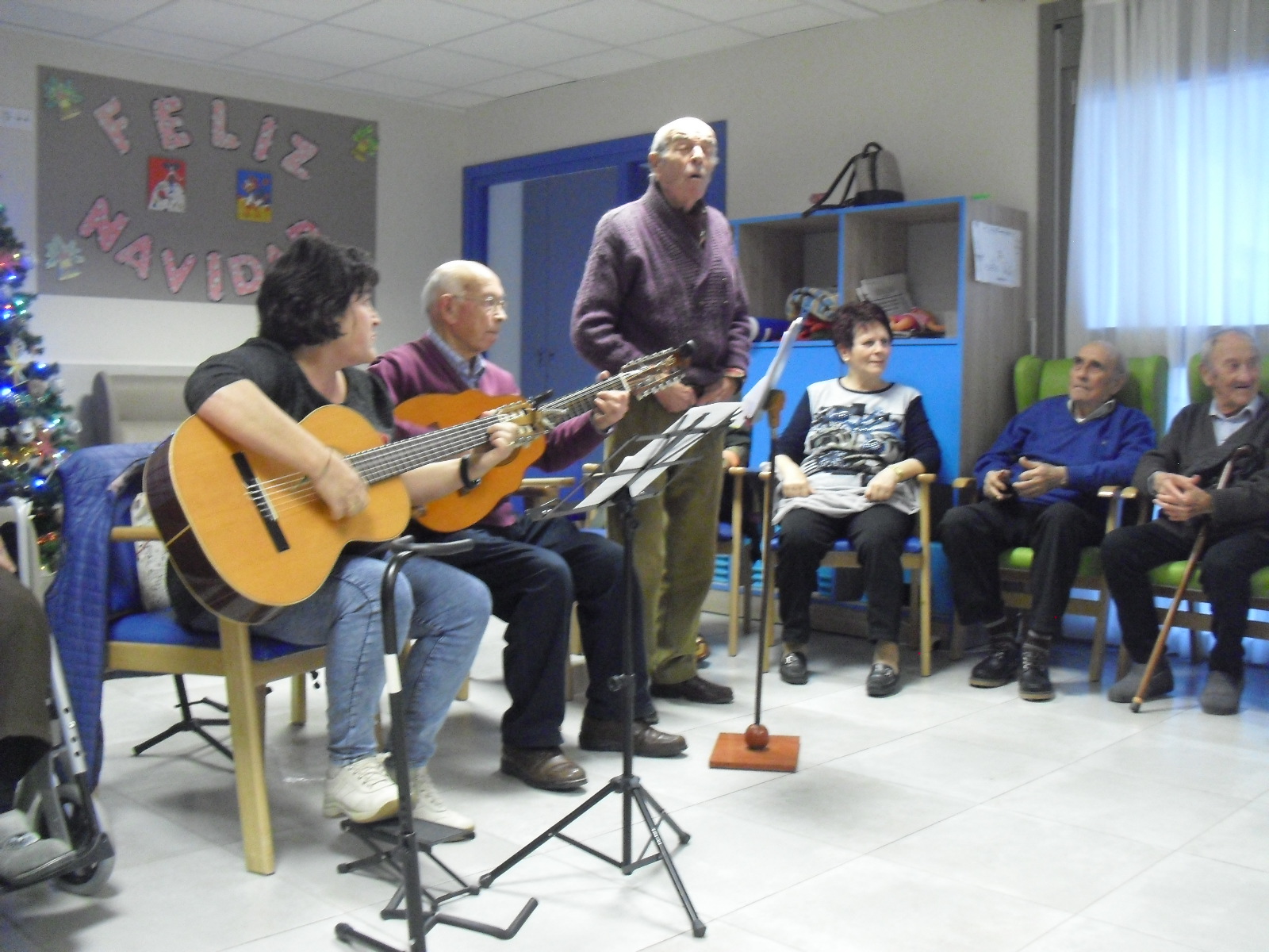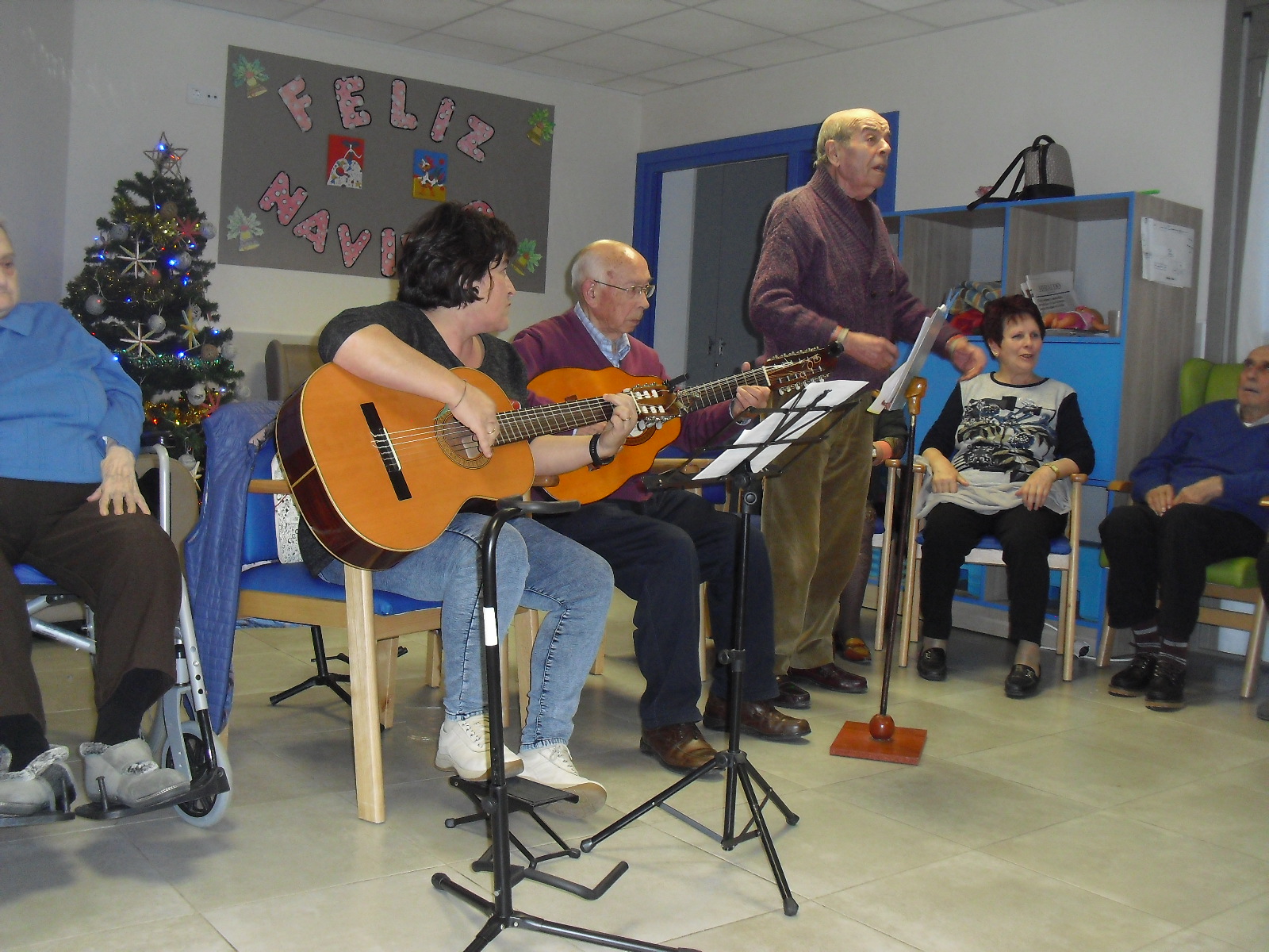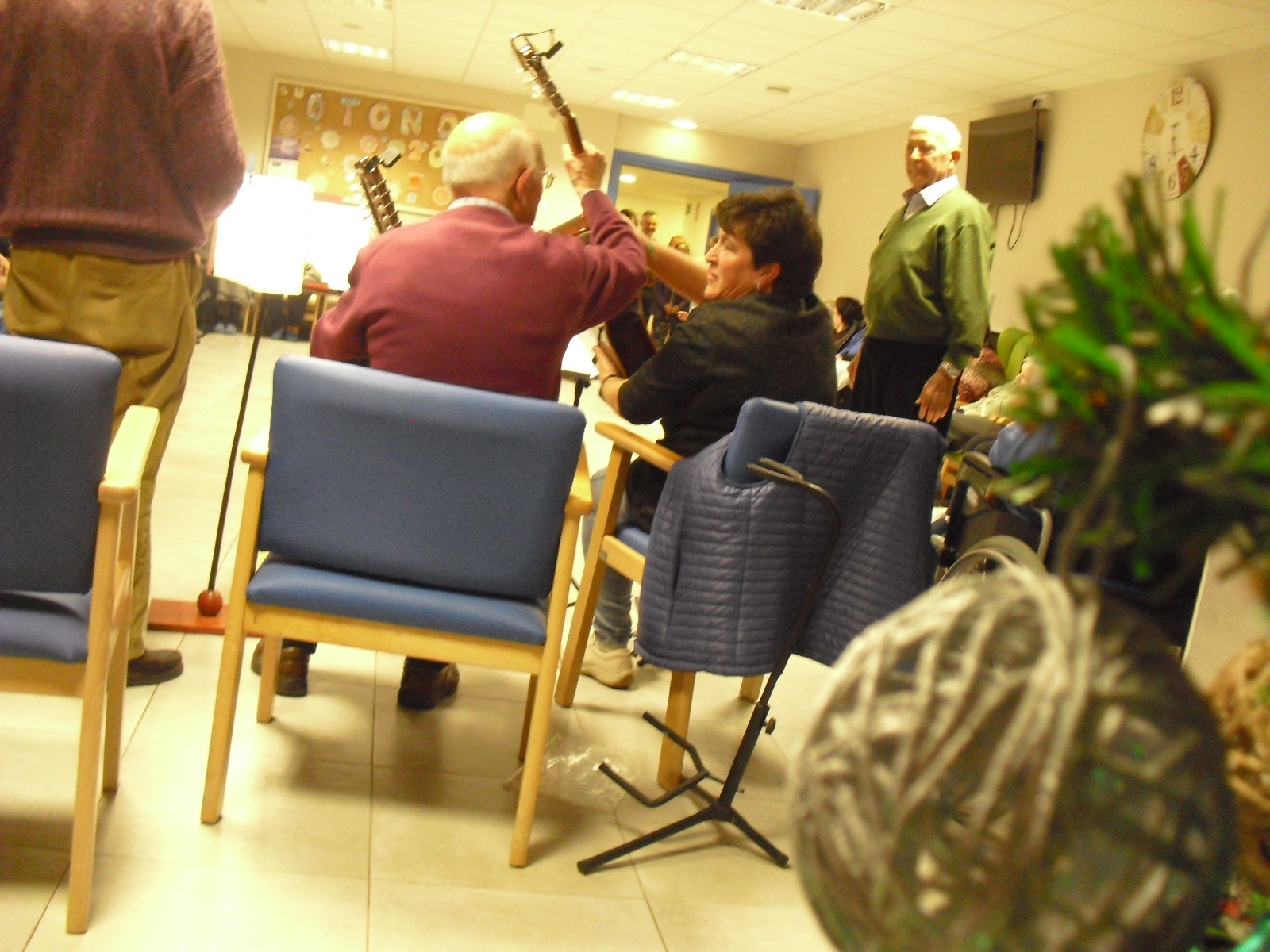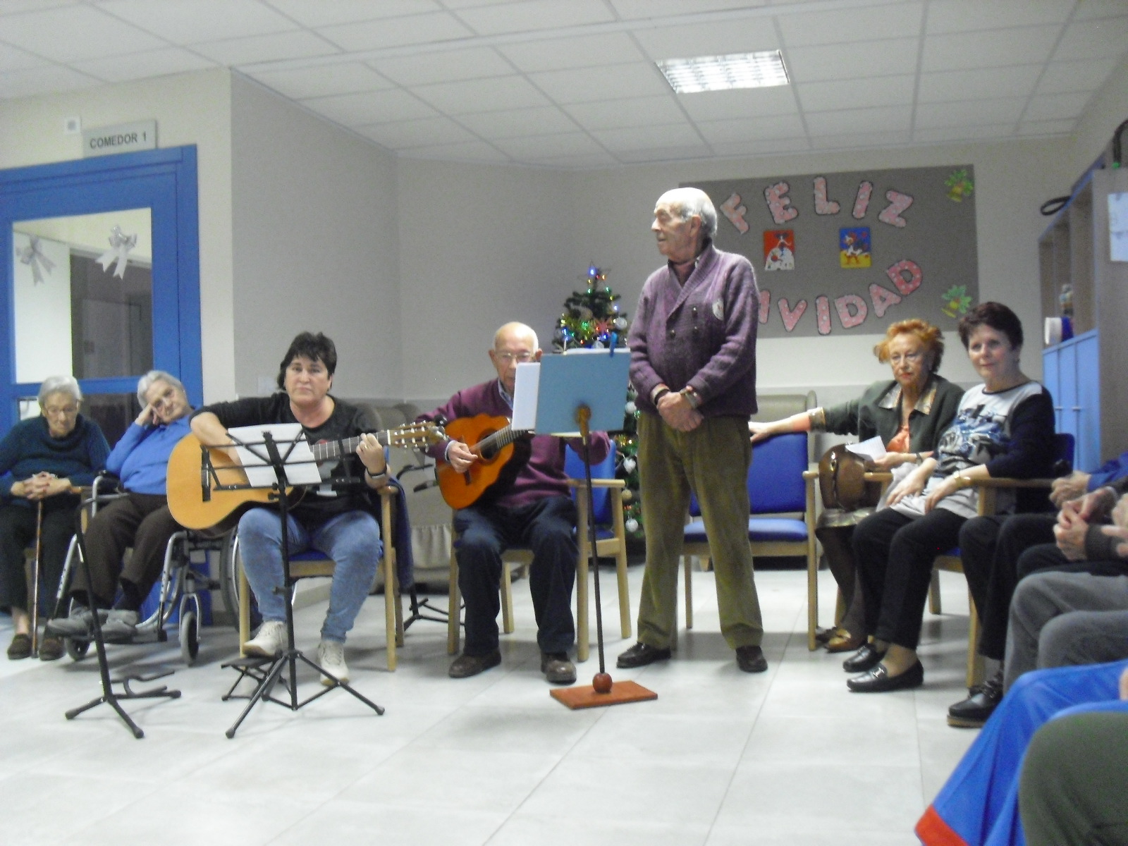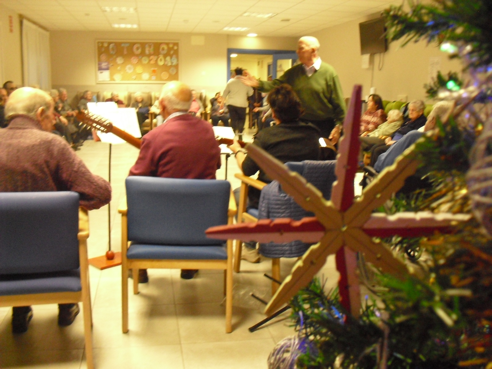 Lo primero disculparme por la tardanza a la hora de publicar, pero Movistar para poder hacer esta publicación me ha tenido dos horas y media!!!!!!!!!!!!!!Este año han hecho unas estrellas con  las pinzas de madera, las que estaban pintando en uno de los talleres y les han quedado preciosas. Además el árbol de Navidad queda muy elegante , os invitamos a que hagáis estas estrellas tan originales. Gracias a Charo, una de mis trabajadoras, quiso regalar a todos los abuelos una velada que les hizo superfelices, ya que trajo a los Amigos de Mainar a deleitar con su actuación a todos. Los componentes son José Gómez, tocó el laúd, Mª Carmen al mando de la guitarra y la voz de Victorino Felipe. Ellos tocaron piezas de baile de los años 50-60: pasodobles, boleros, tangos, jotas y algunos villancicos. Disfrutaron muchísimo e incluso bailaron. Gracias Charo y gracias a los Amigos de Mainar por su generosidad hacia nuestros mayores.