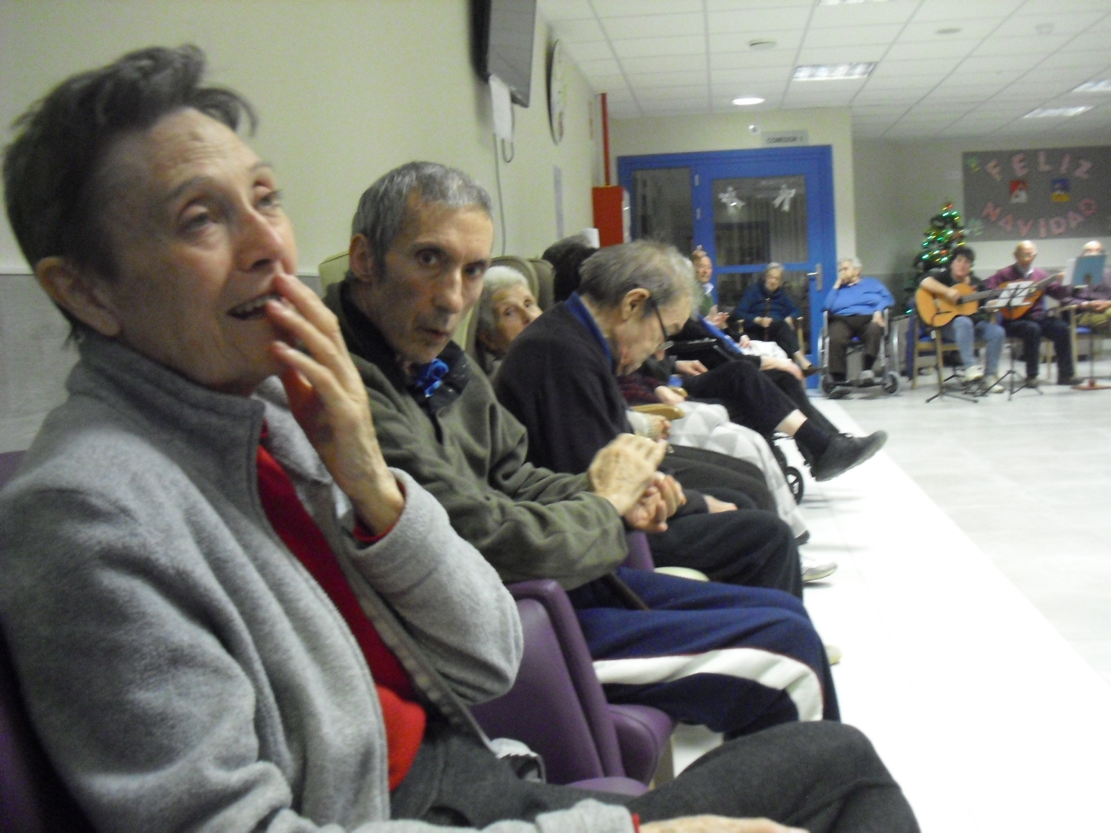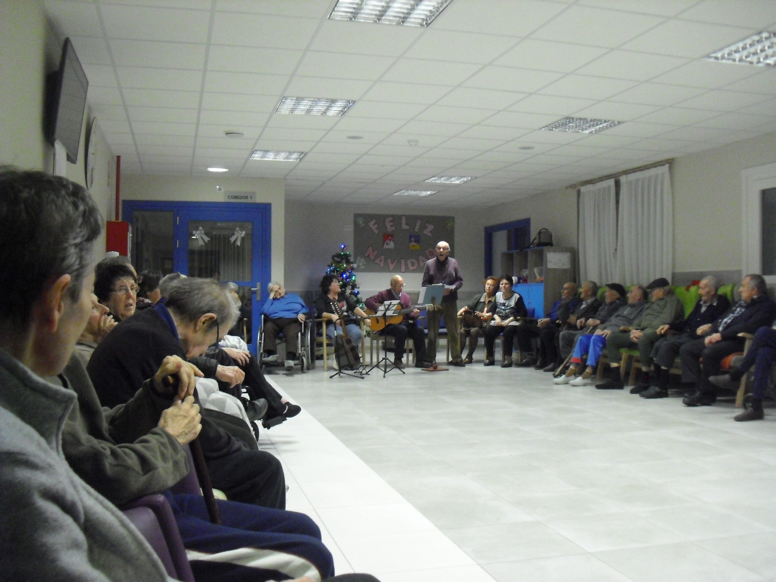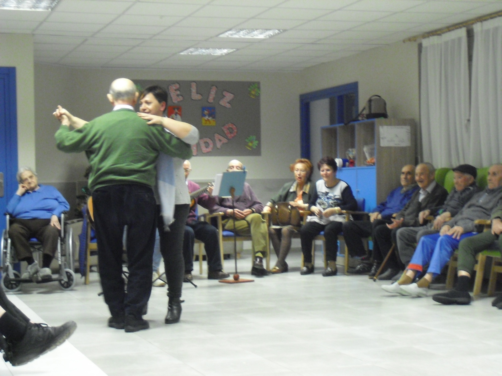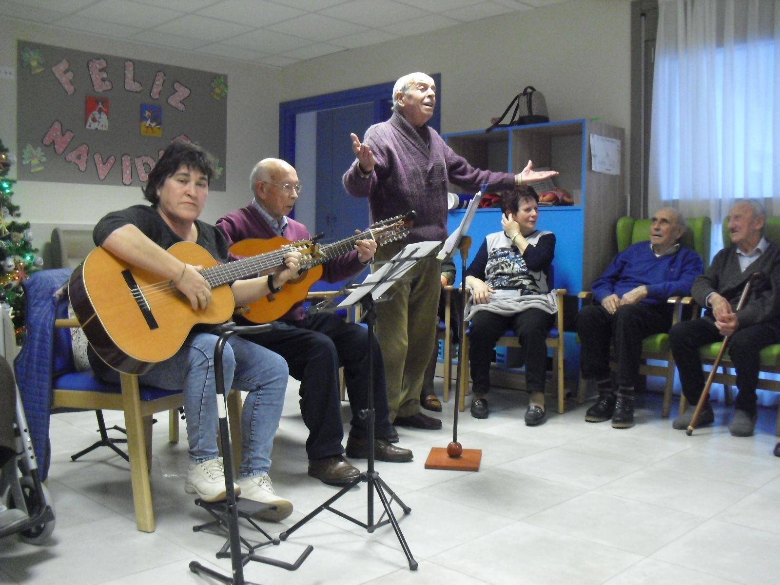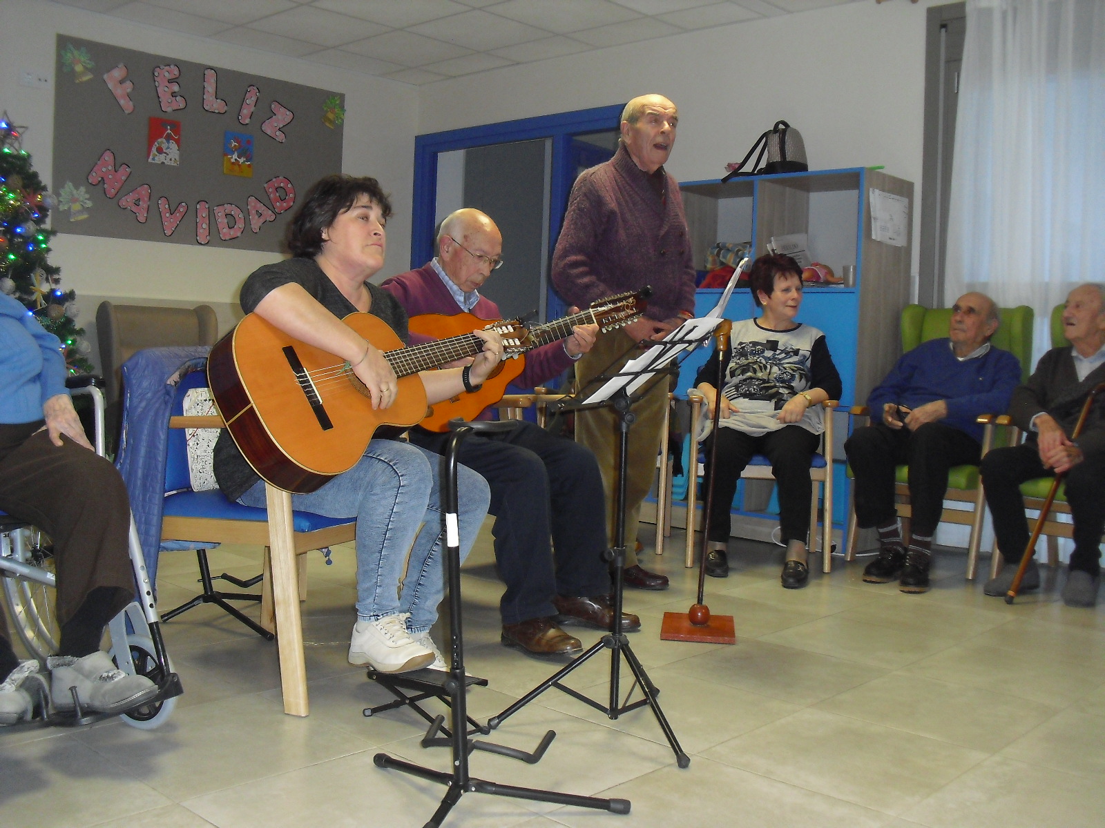 Lo primero disculparme por la tardanza a la hora de publicar, pero Movistar para poder hacer esta publicación me ha tenido dos horas y media!!!!!!!!!!!!!!Este año han hecho unas estrellas con  las pinzas de madera, las que estaban pintando en uno de los talleres y les han quedado preciosas. Además el árbol de Navidad queda muy elegante , os invitamos a que hagáis estas estrellas tan originales. Gracias a Charo, una de mis trabajadoras, quiso regalar a todos los abuelos una velada que les hizo superfelices, ya que trajo a los Amigos de Mainar a deleitar con su actuación a todos. Los componentes son José Gómez, tocó el laúd, Mª Carmen al mando de la guitarra y la voz de Victorino Felipe. Ellos tocaron piezas de baile de los años 50-60: pasodobles, boleros, tangos, jotas y algunos villancicos. Disfrutaron muchísimo e incluso bailaron. Gracias Charo y gracias a los Amigos de Mainar por su generosidad hacia nuestros mayores.