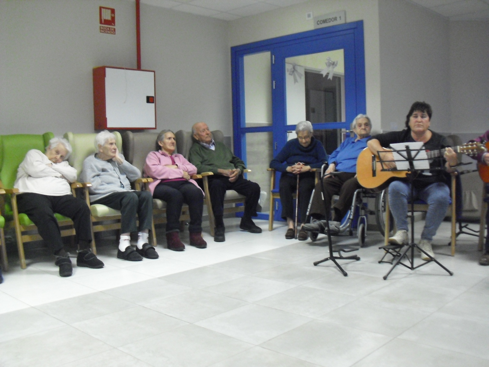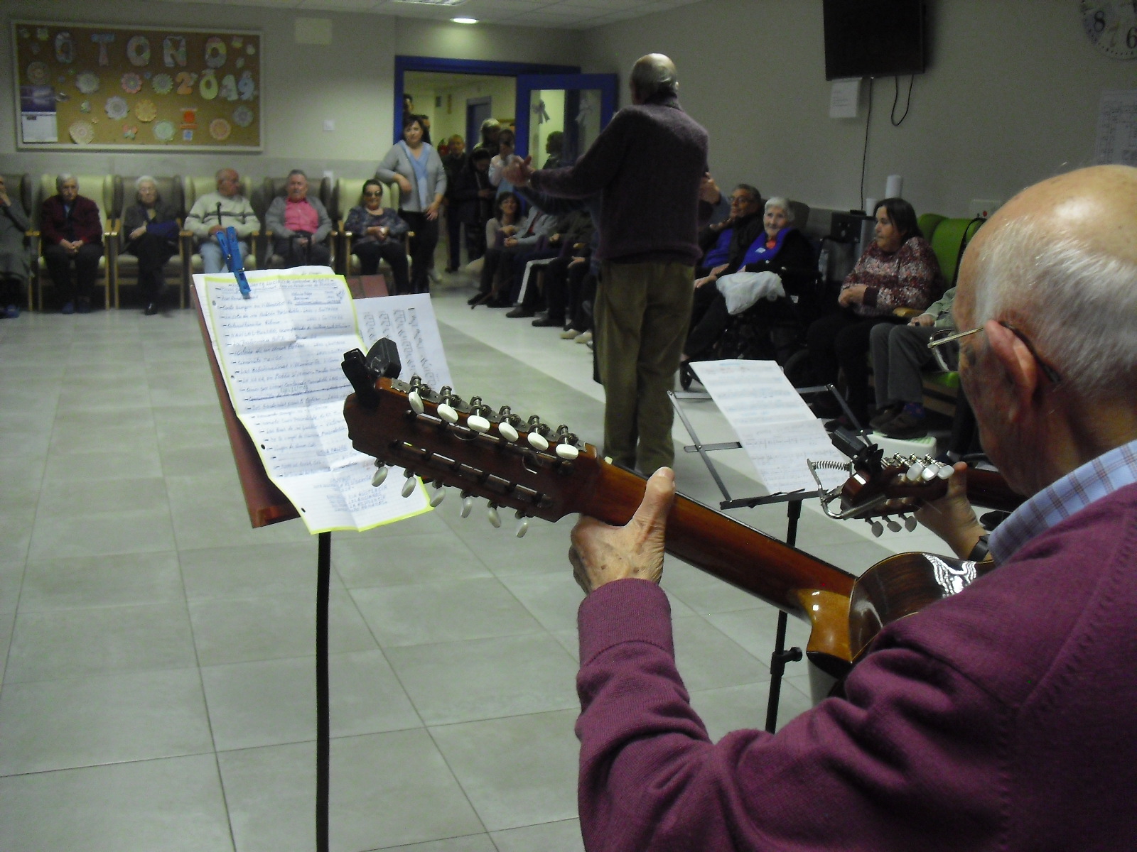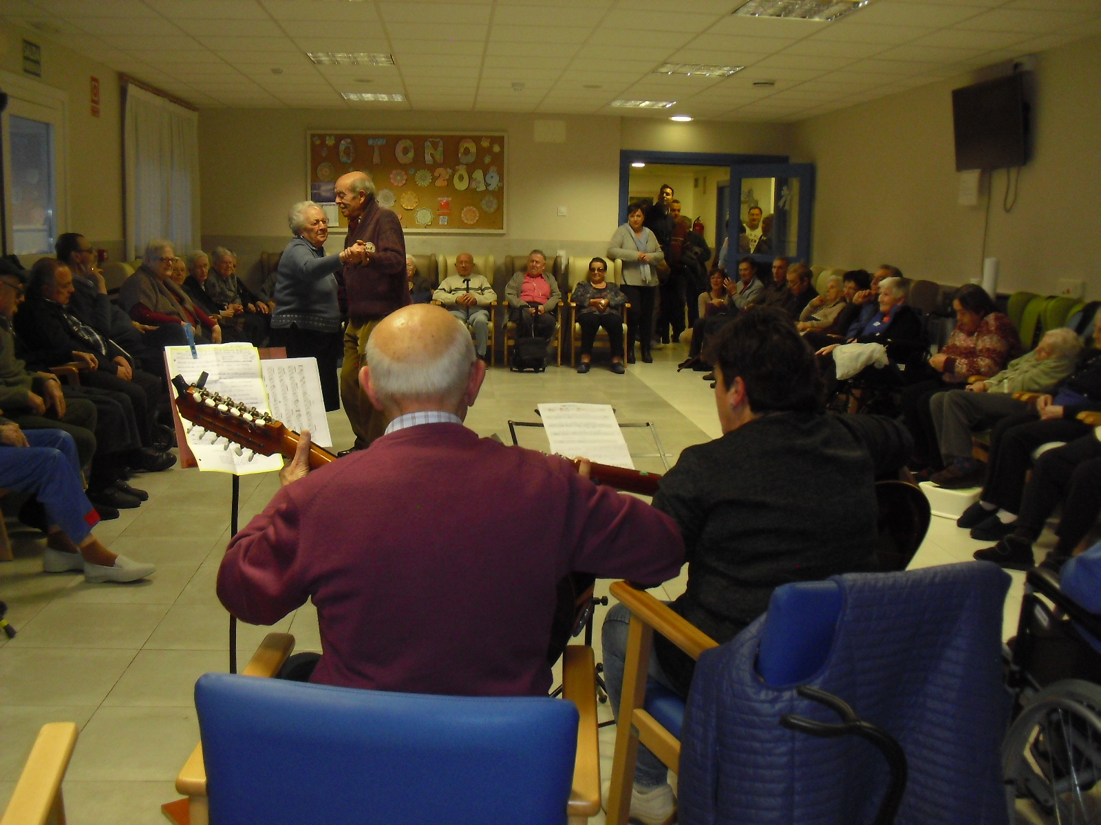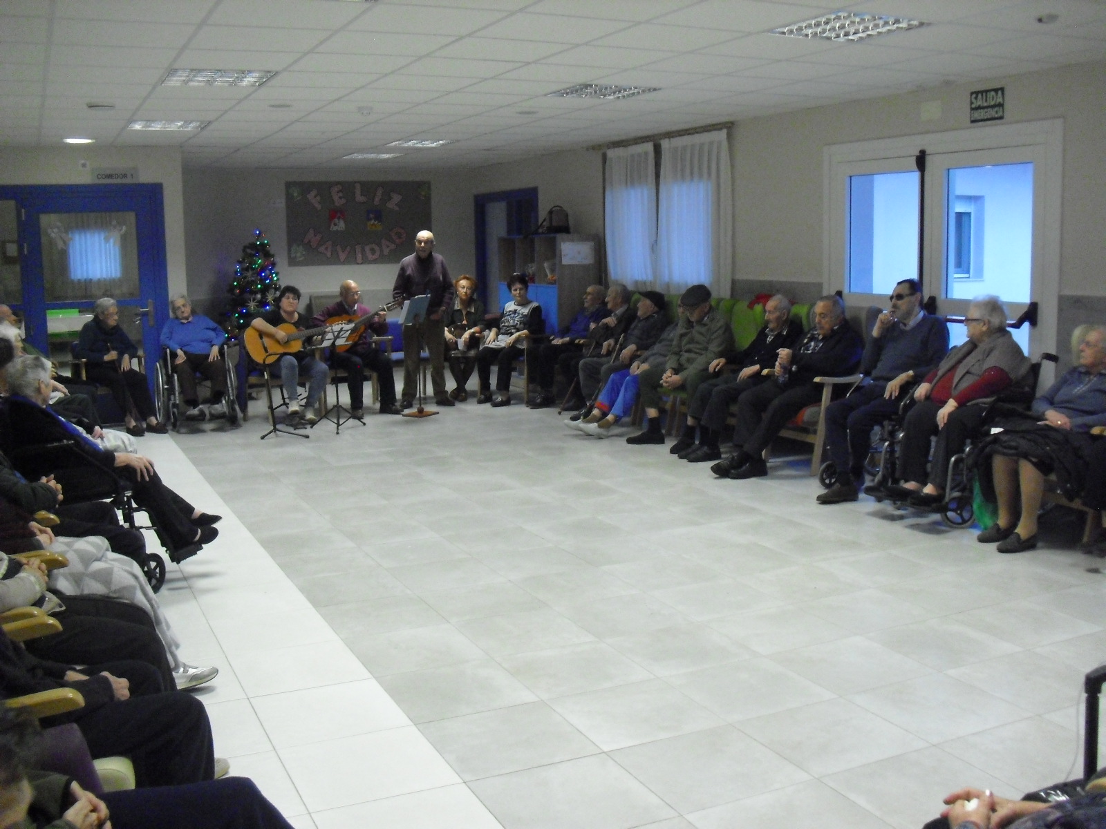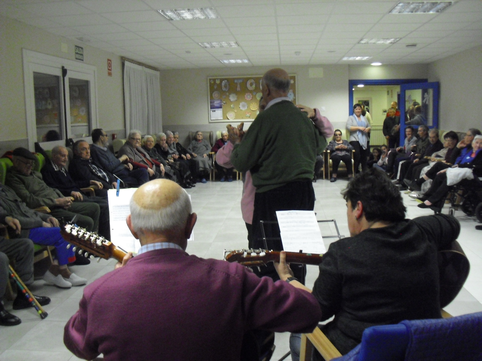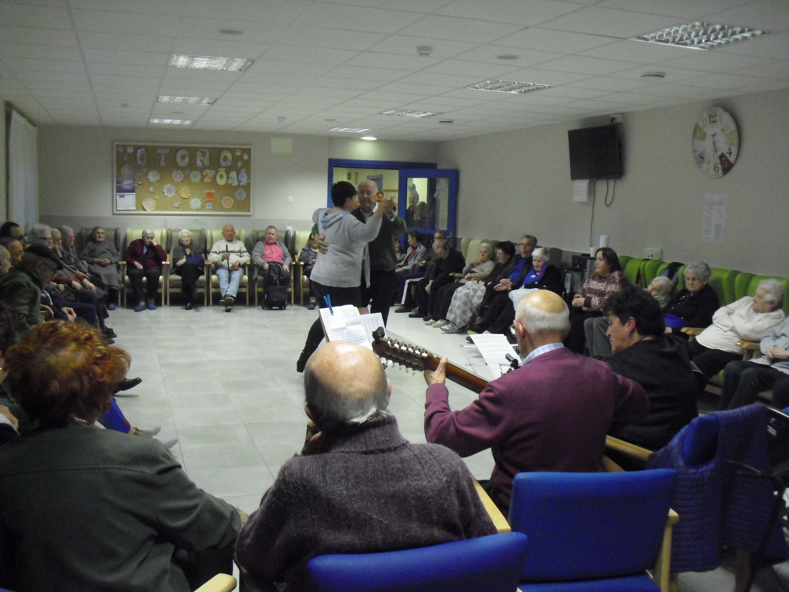 Lo primero disculparme por la tardanza a la hora de publicar, pero Movistar para poder hacer esta publicación me ha tenido dos horas y media!!!!!!!!!!!!!!Este año han hecho unas estrellas con  las pinzas de madera, las que estaban pintando en uno de los talleres y les han quedado preciosas. Además el árbol de Navidad queda muy elegante , os invitamos a que hagáis estas estrellas tan originales. Gracias a Charo, una de mis trabajadoras, quiso regalar a todos los abuelos una velada que les hizo superfelices, ya que trajo a los Amigos de Mainar a deleitar con su actuación a todos. Los componentes son José Gómez, tocó el laúd, Mª Carmen al mando de la guitarra y la voz de Victorino Felipe. Ellos tocaron piezas de baile de los años 50-60: pasodobles, boleros, tangos, jotas y algunos villancicos. Disfrutaron muchísimo e incluso bailaron. Gracias Charo y gracias a los Amigos de Mainar por su generosidad hacia nuestros mayores.