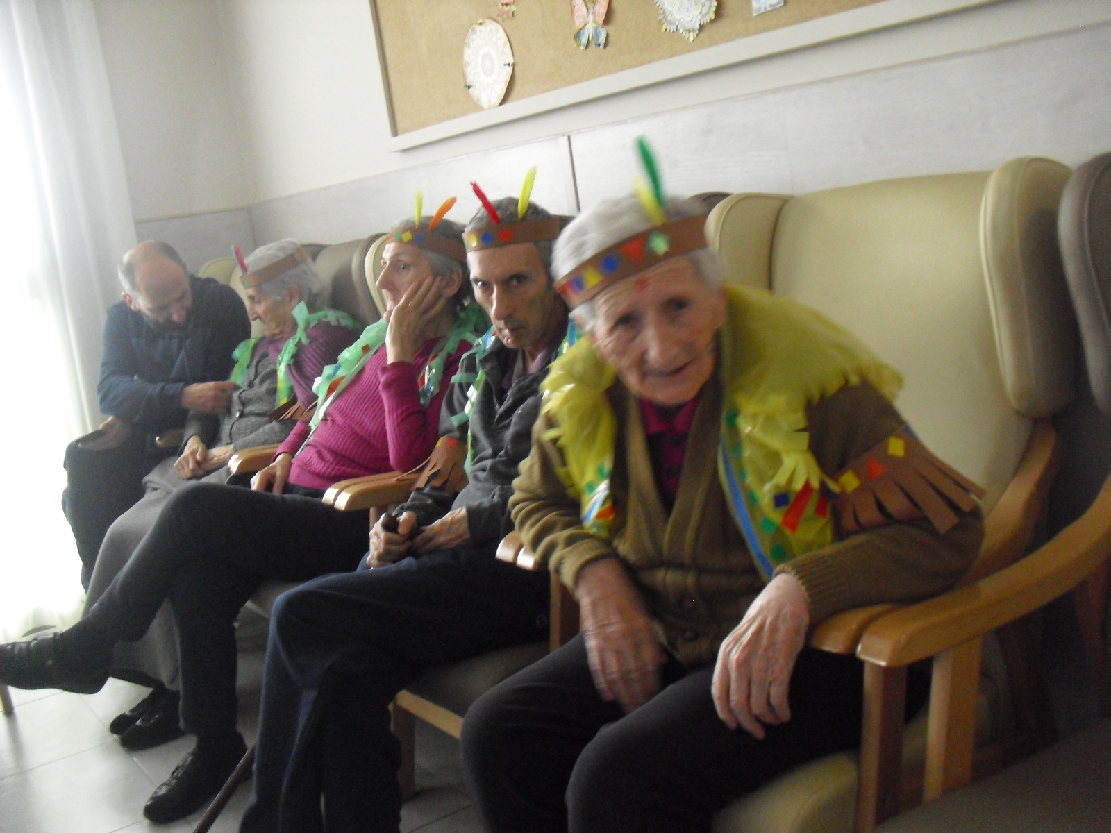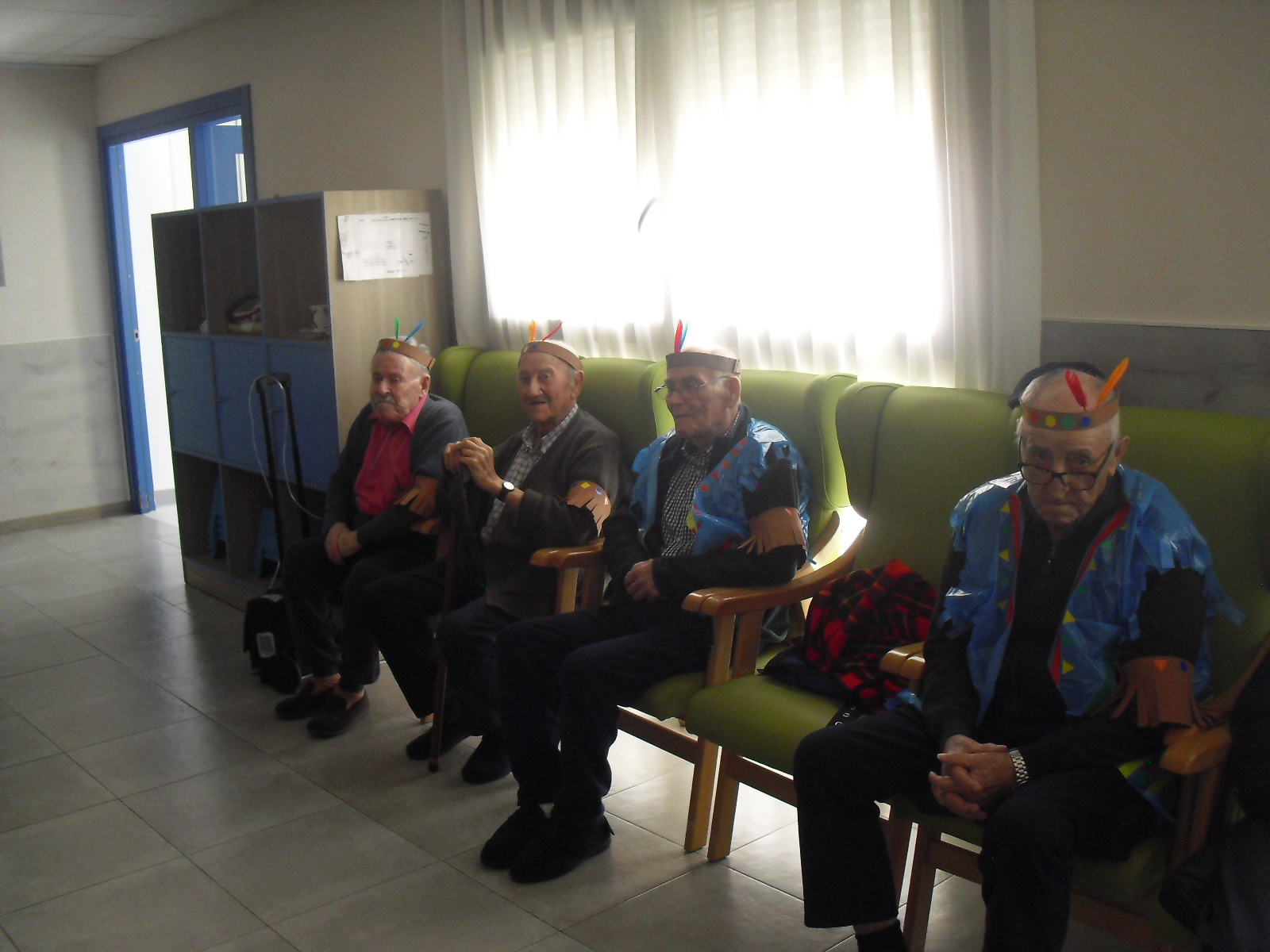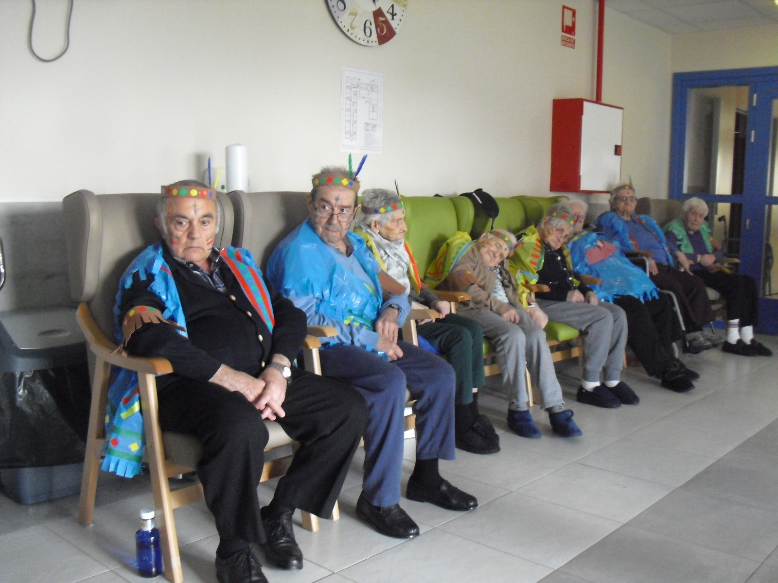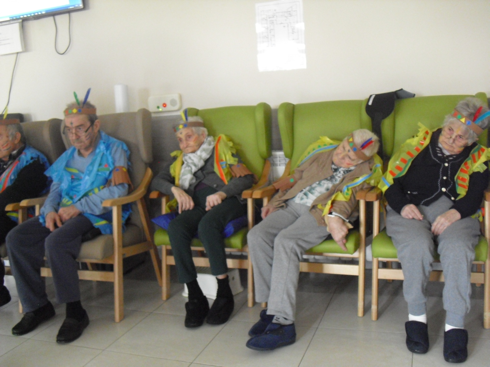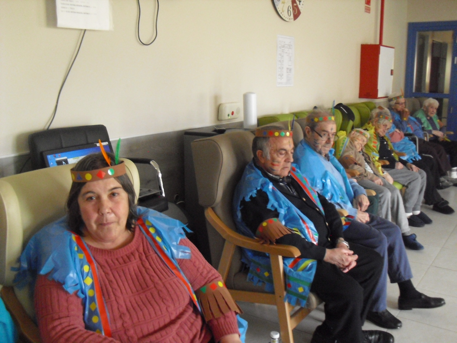 Os mandamos ánimo a todos y todas!!. Tenía pendiente poneros las fotos de la fiesta de disfraces de indios que hicimos justo antes del estado de alarma. Salen todos los usuarios del centro de día y vinieron algunos familiares. No sabemos cuándo se podrán repetir momentos así, pero cuando lleguen los saborearemos aún mejor. Hubo baile y lo que más les gusta a todos: merienda con refrescos!!!!!! y así lo hicimos. En cuanto pase esto vamos a organizar una fiesta en el jardín con puestos de comida y de exposición de las manualidades para que puedan venir los familiares...eso sí con mascarillas y gel para desinfectar!!!!!!!!!! Este sábado decidí llamar a todos los familiares para tranquilizarles, transmitirles que estamos bien y darles mi apoyo pero casi fue peor pues al recibir una llamada de la residencia más de uno se asustó. Seguiré enviándoles wasap y mensajes a los móviles para no asustarles...que bastantes preocupaciones tenemos ya todos.