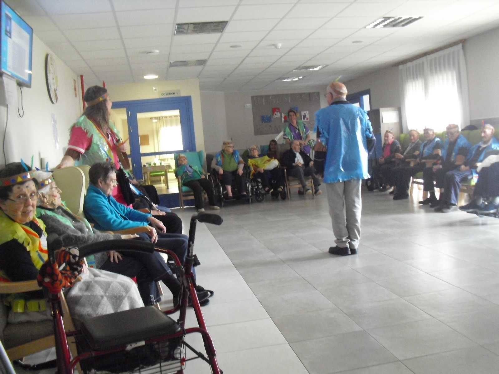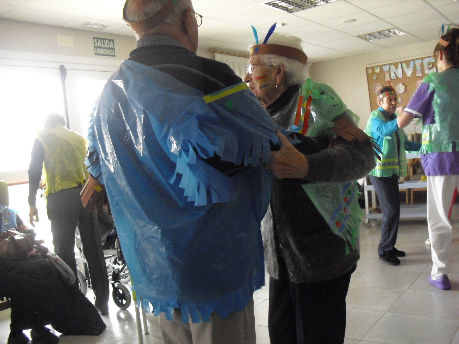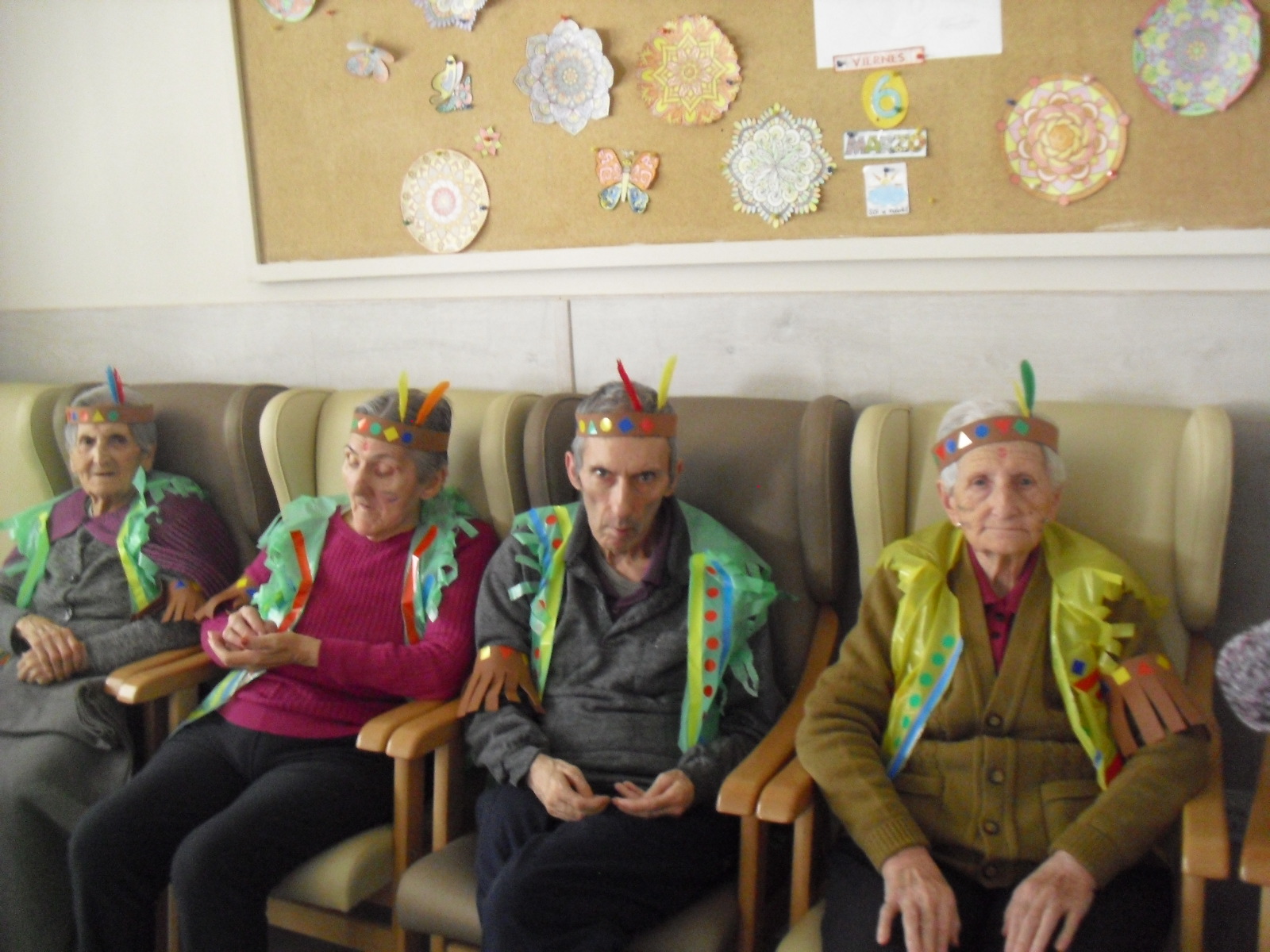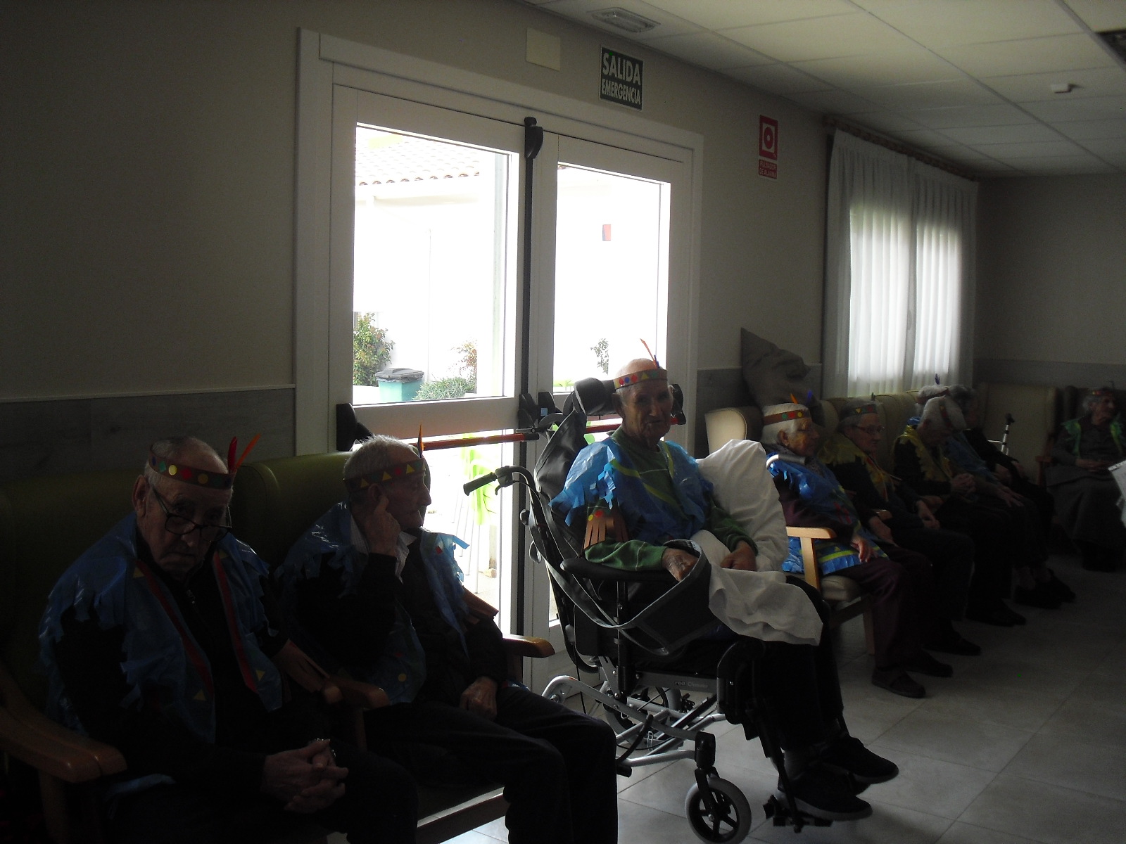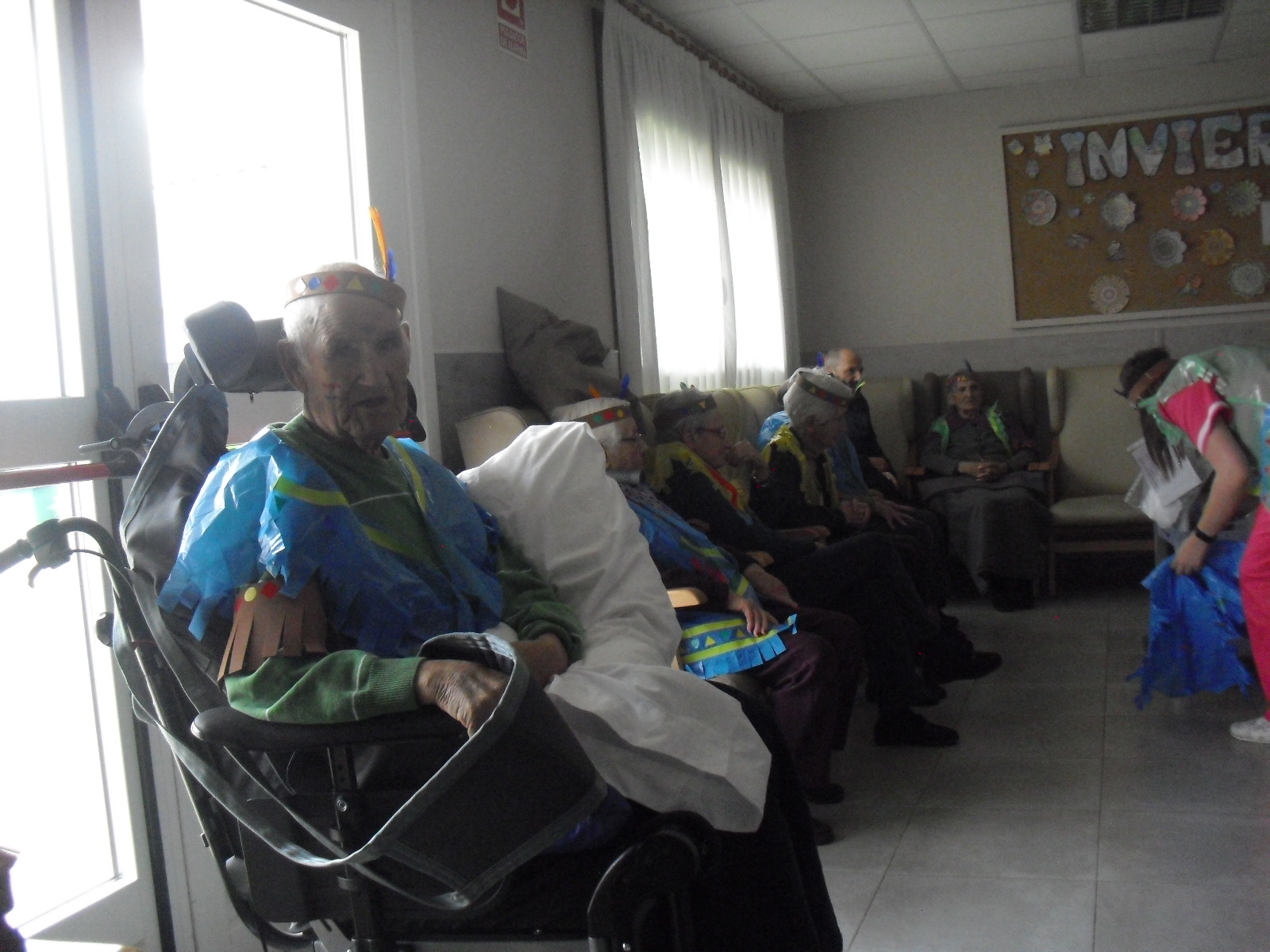 Os mandamos ánimo a todos y todas!!. Tenía pendiente poneros las fotos de la fiesta de disfraces de indios que hicimos justo antes del estado de alarma. Salen todos los usuarios del centro de día y vinieron algunos familiares. No sabemos cuándo se podrán repetir momentos así, pero cuando lleguen los saborearemos aún mejor. Hubo baile y lo que más les gusta a todos: merienda con refrescos!!!!!! y así lo hicimos. En cuanto pase esto vamos a organizar una fiesta en el jardín con puestos de comida y de exposición de las manualidades para que puedan venir los familiares...eso sí con mascarillas y gel para desinfectar!!!!!!!!!! Este sábado decidí llamar a todos los familiares para tranquilizarles, transmitirles que estamos bien y darles mi apoyo pero casi fue peor pues al recibir una llamada de la residencia más de uno se asustó. Seguiré enviándoles wasap y mensajes a los móviles para no asustarles...que bastantes preocupaciones tenemos ya todos.