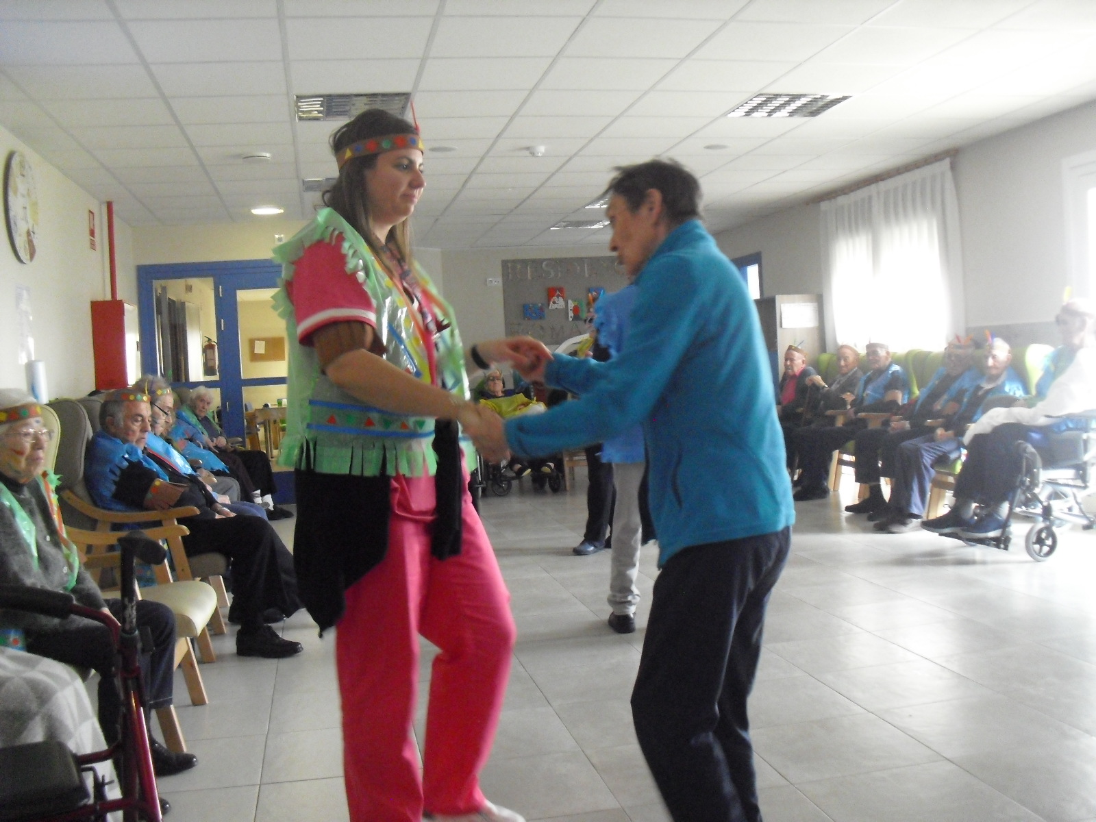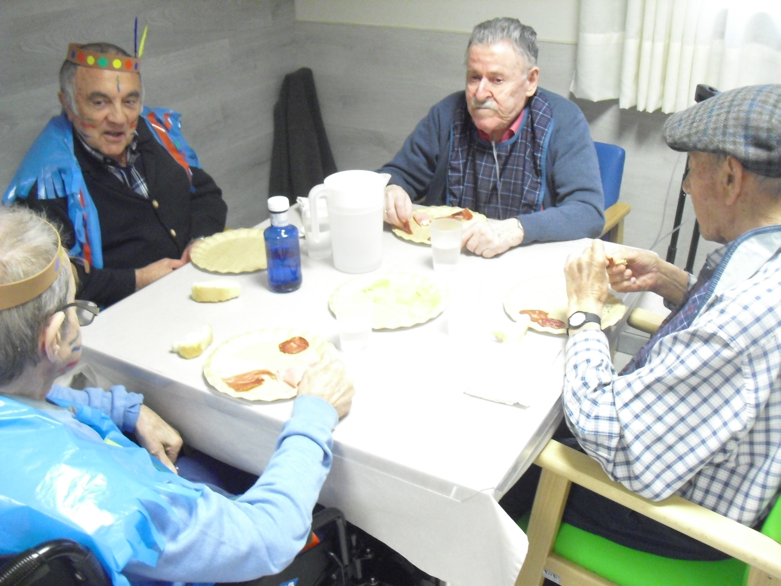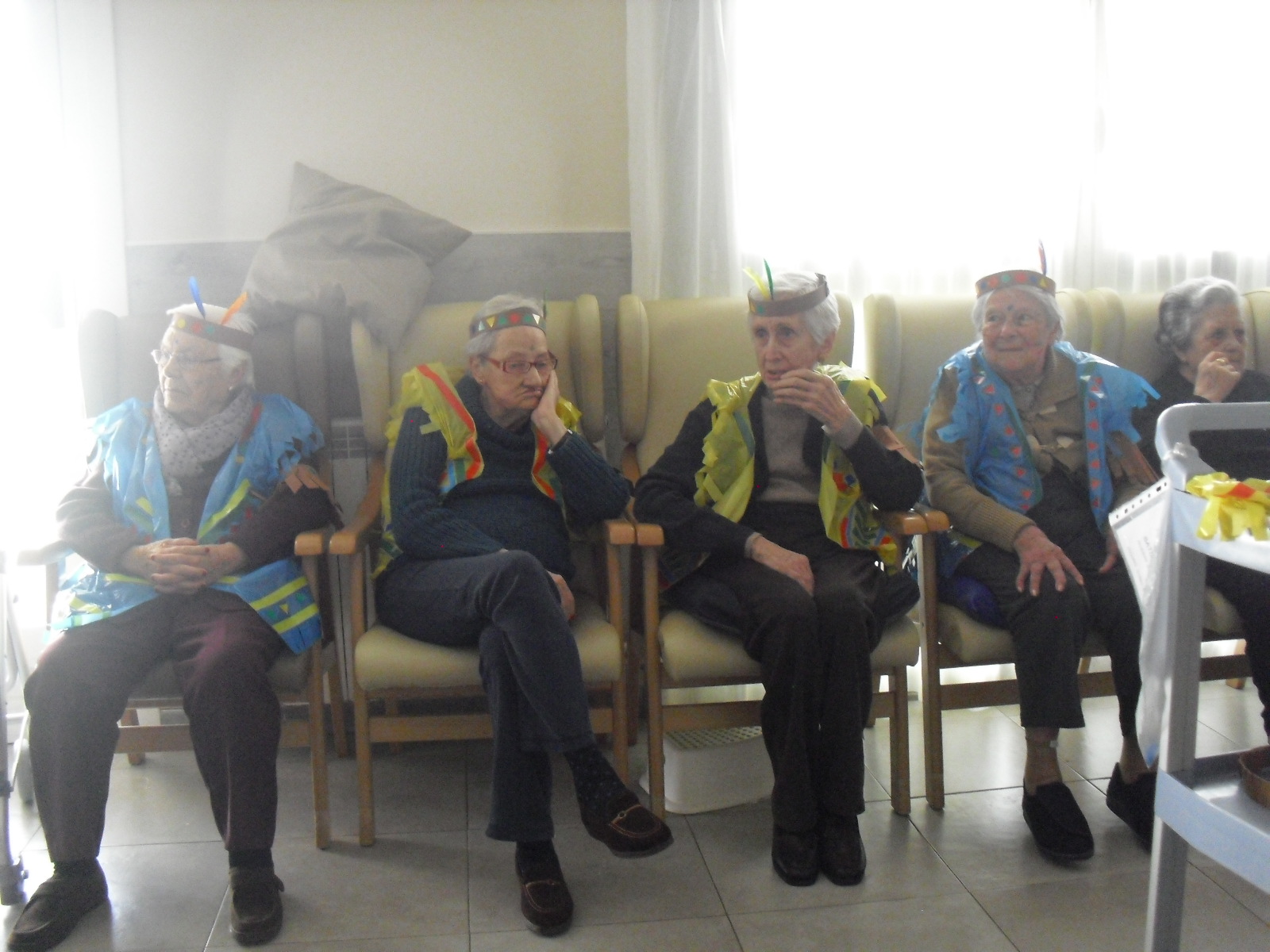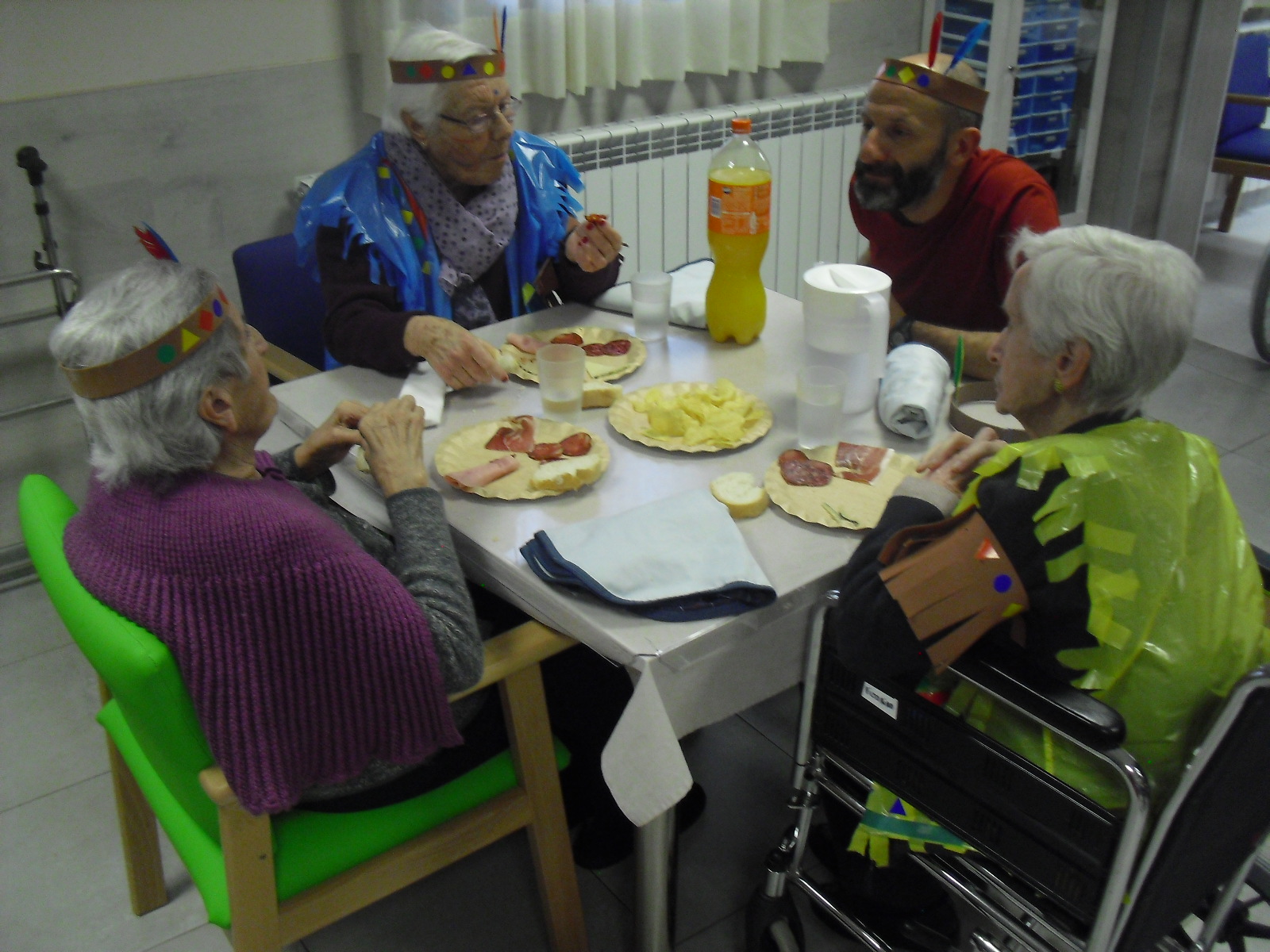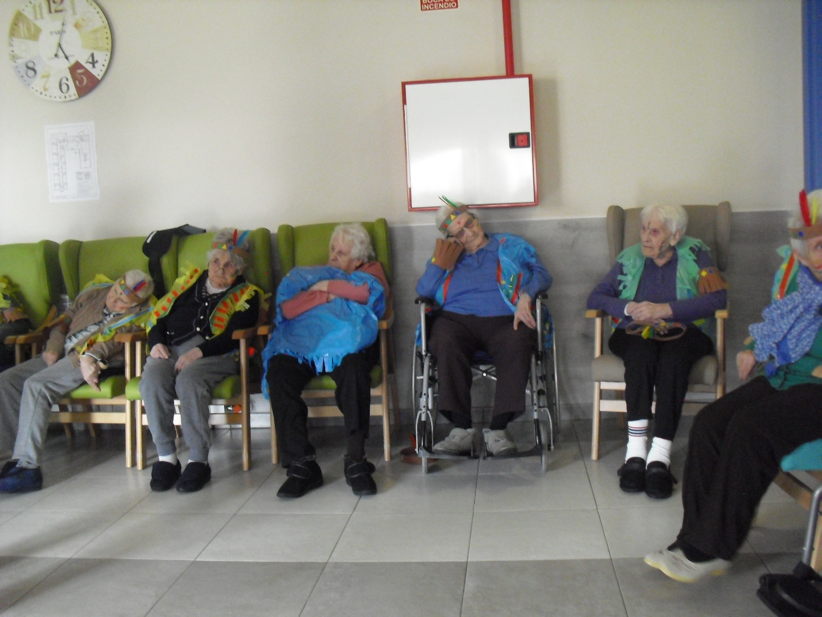 Os mandamos ánimo a todos y todas!!. Tenía pendiente poneros las fotos de la fiesta de disfraces de indios que hicimos justo antes del estado de alarma. Salen todos los usuarios del centro de día y vinieron algunos familiares. No sabemos cuándo se podrán repetir momentos así, pero cuando lleguen los saborearemos aún mejor. Hubo baile y lo que más les gusta a todos: merienda con refrescos!!!!!! y así lo hicimos. En cuanto pase esto vamos a organizar una fiesta en el jardín con puestos de comida y de exposición de las manualidades para que puedan venir los familiares...eso sí con mascarillas y gel para desinfectar!!!!!!!!!! Este sábado decidí llamar a todos los familiares para tranquilizarles, transmitirles que estamos bien y darles mi apoyo pero casi fue peor pues al recibir una llamada de la residencia más de uno se asustó. Seguiré enviándoles wasap y mensajes a los móviles para no asustarles...que bastantes preocupaciones tenemos ya todos.