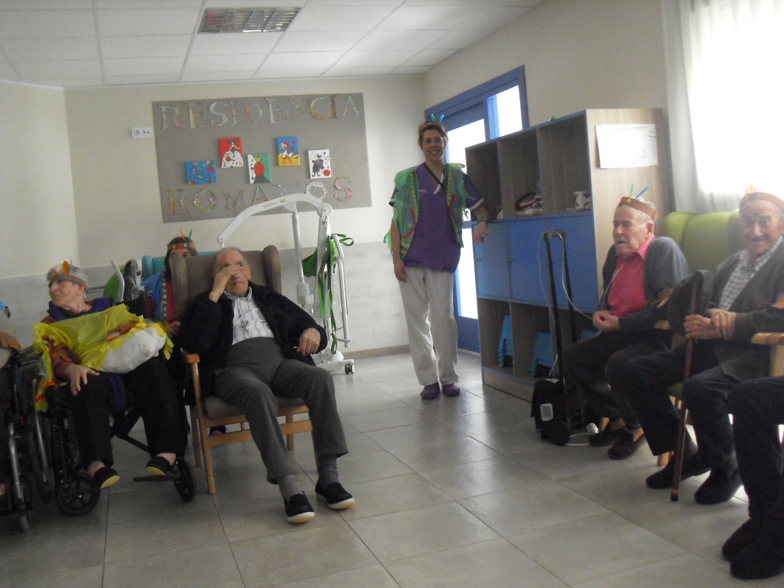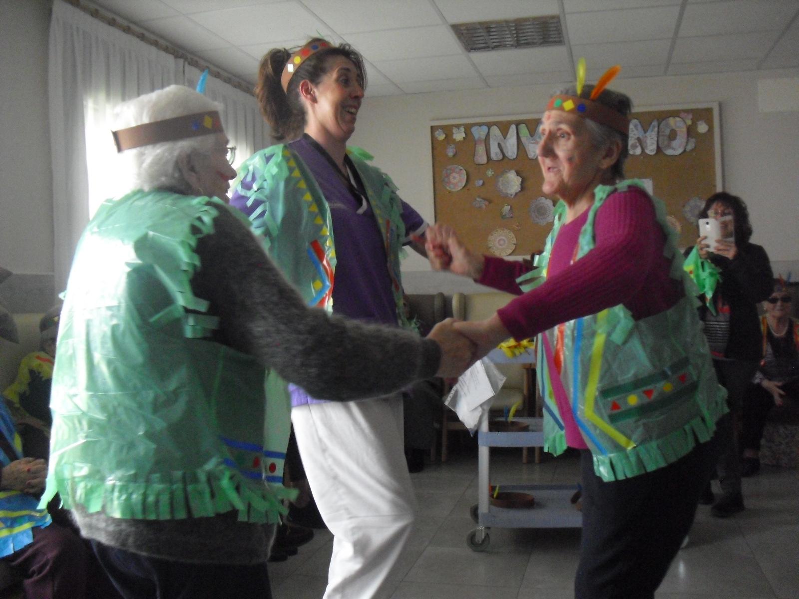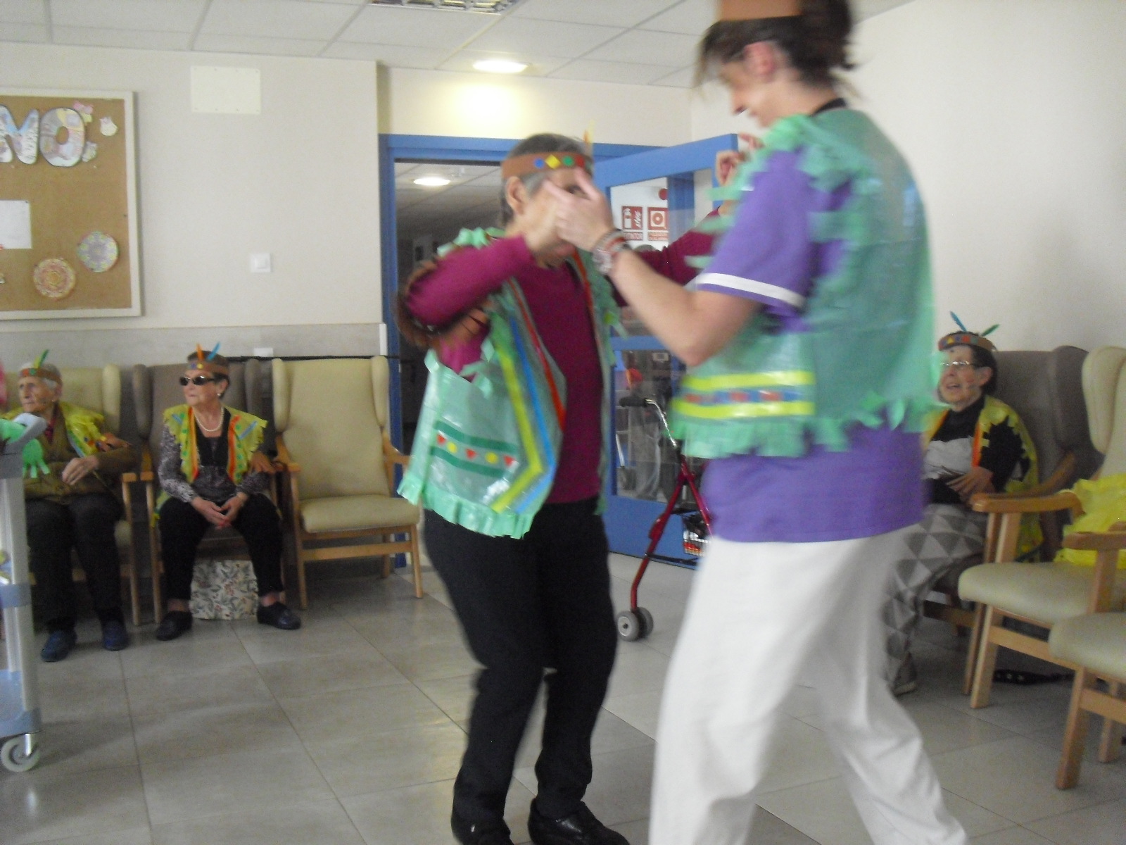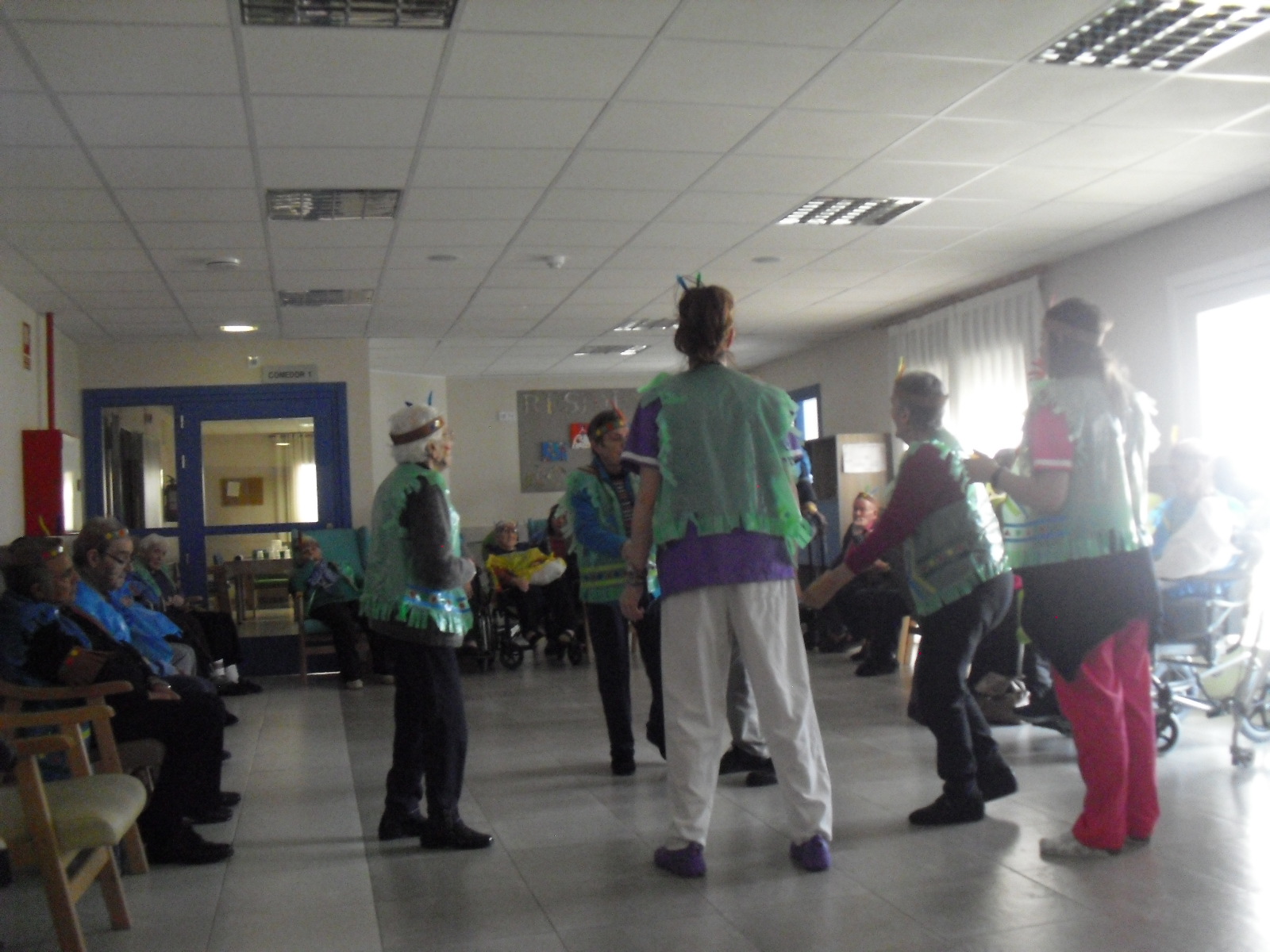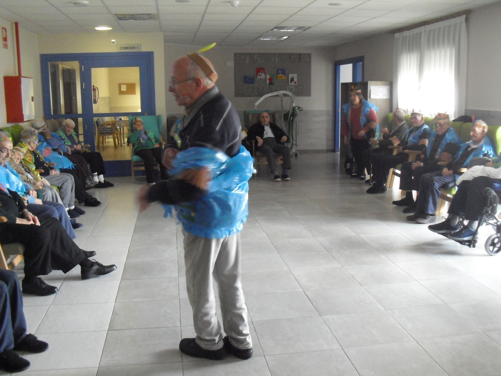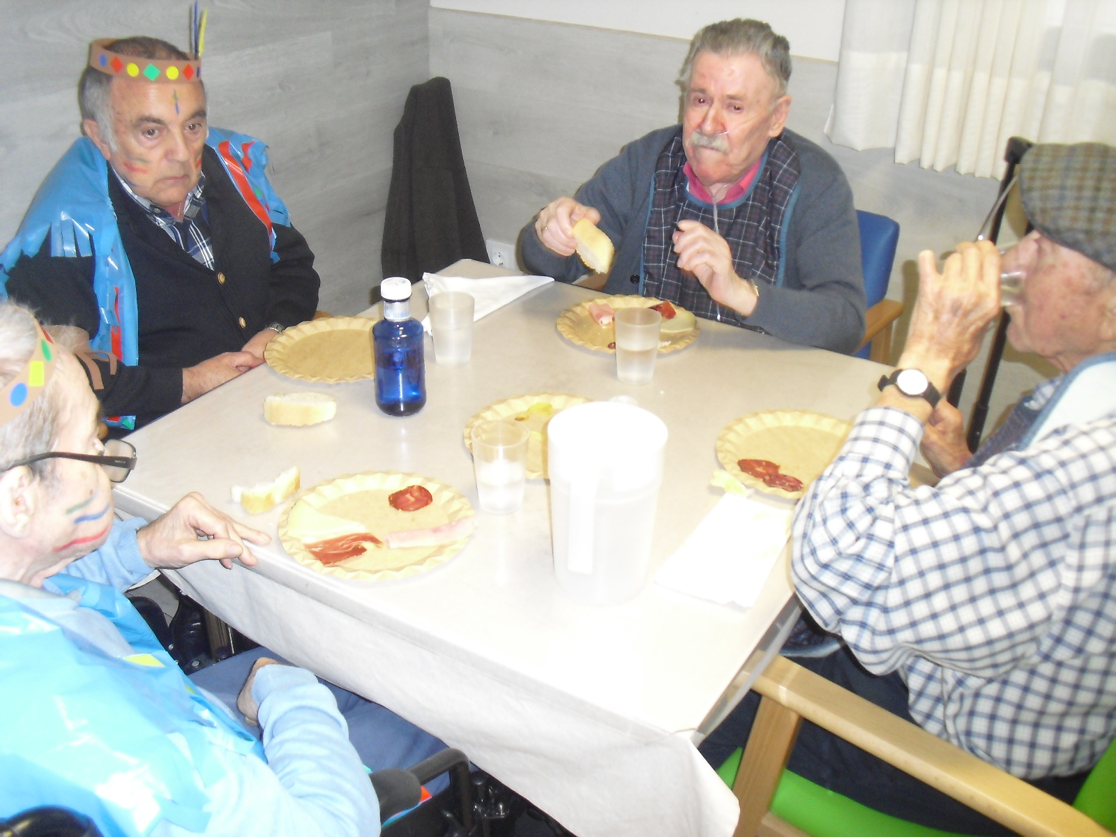 Os mandamos ánimo a todos y todas!!. Tenía pendiente poneros las fotos de la fiesta de disfraces de indios que hicimos justo antes del estado de alarma. Salen todos los usuarios del centro de día y vinieron algunos familiares. No sabemos cuándo se podrán repetir momentos así, pero cuando lleguen los saborearemos aún mejor. Hubo baile y lo que más les gusta a todos: merienda con refrescos!!!!!! y así lo hicimos. En cuanto pase esto vamos a organizar una fiesta en el jardín con puestos de comida y de exposición de las manualidades para que puedan venir los familiares...eso sí con mascarillas y gel para desinfectar!!!!!!!!!! Este sábado decidí llamar a todos los familiares para tranquilizarles, transmitirles que estamos bien y darles mi apoyo pero casi fue peor pues al recibir una llamada de la residencia más de uno se asustó. Seguiré enviándoles wasap y mensajes a los móviles para no asustarles...que bastantes preocupaciones tenemos ya todos.