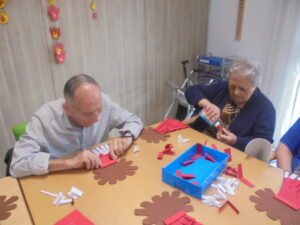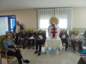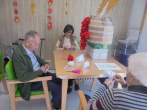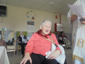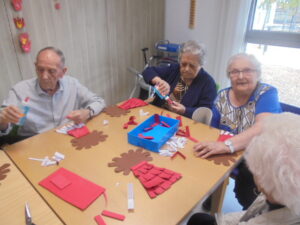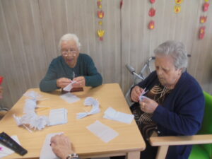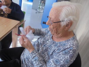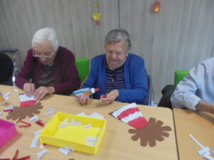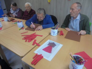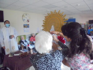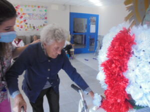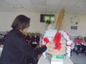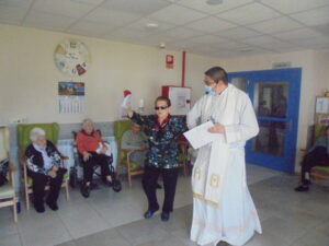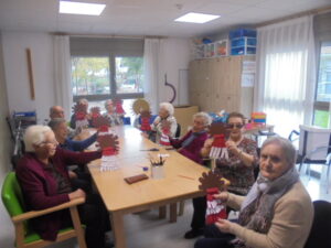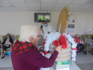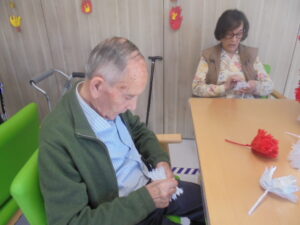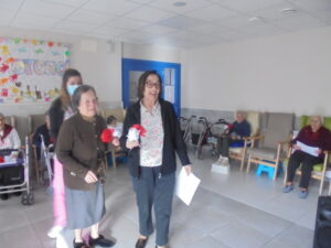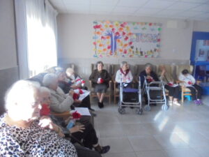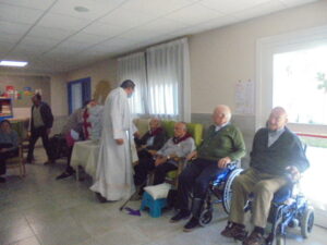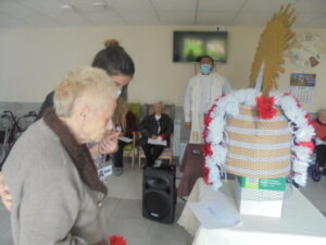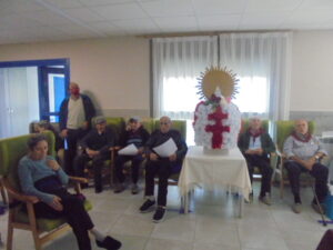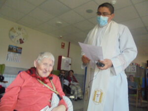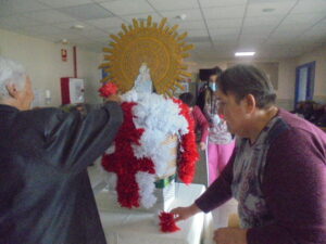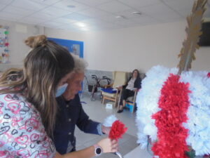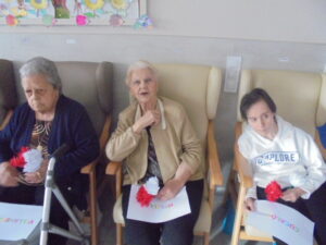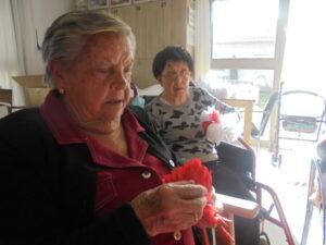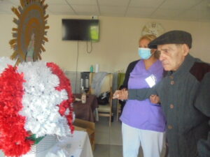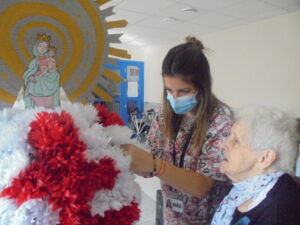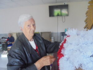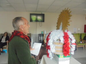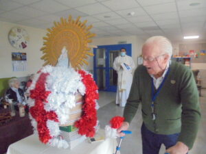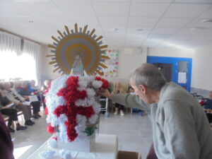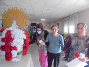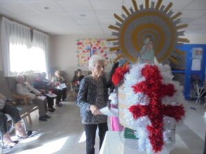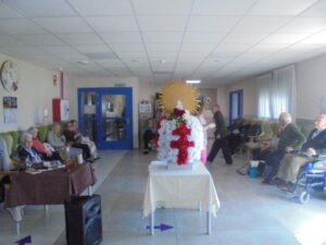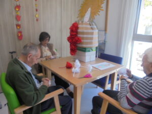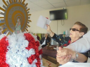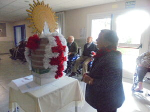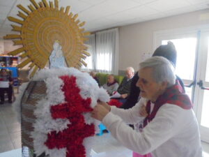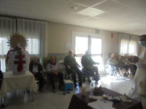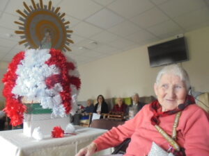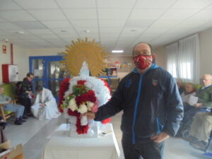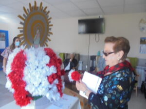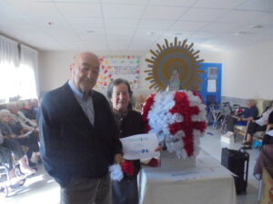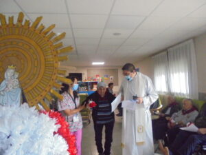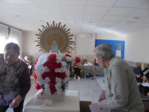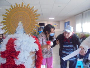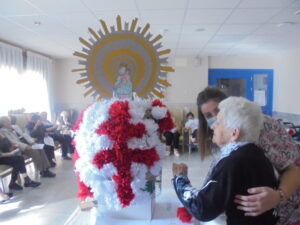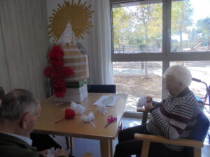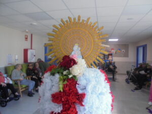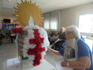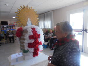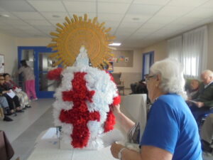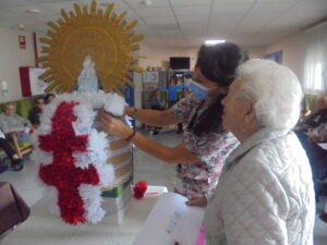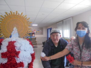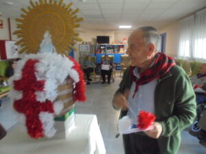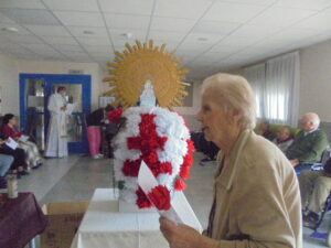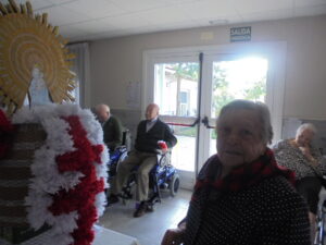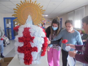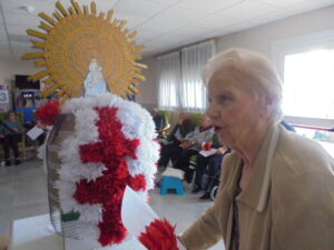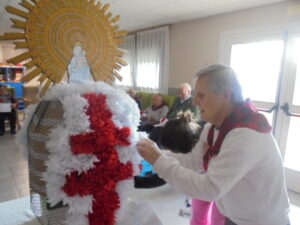 La excursión de Villafeliche la dejamos para la próxima vez ya que siendo Pilares tenemos la misa y la ofrenda y hay que publicarlo sí o sí!!!!! Lo primero de todo agradecer a nuestro cura Federico su interés por celebrar la misa en la residencia y hacer ese día tan especial para todos nuestros usuarios, además trae su equipo de música y se implica muchísimo en nuestra ofrenda. Yo no pude estar esa mañana pero Maribel, María y Federico se encargaron de que fuese un momento para recordar. Con Maria hicieron otro taller y fabricaron Virgencias del Pilar con papel de fieltro muy originales. La comida también fue especial: ternasco asado, ensalada variada con esparragos y profiteroles con chocolate. Le tocó a Pilar deleitar a los abuelos con este menú. Este año renovaron todas las flores de la ofrenda y decidieron hacer el manto blanco y la cruz roja. Maribel eligió las flores que iban a elaborar con papel de seda. Todas las que han podido ayudar las han ido haciendo y el próximo año queremos renovar la Virgen del Pilar. Disfrutas de las fotos y muchas gracias Federico!!!!!!!!!!!!