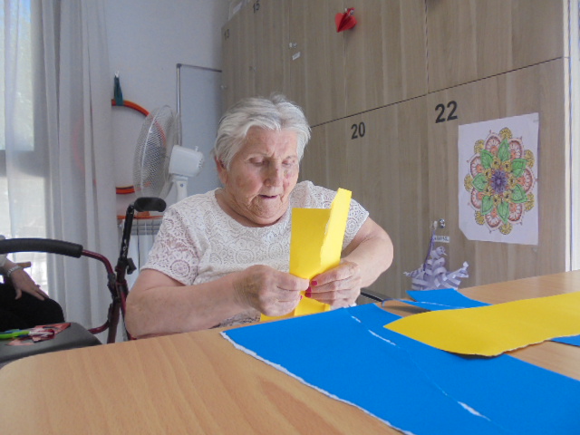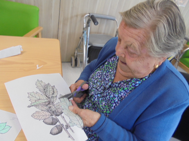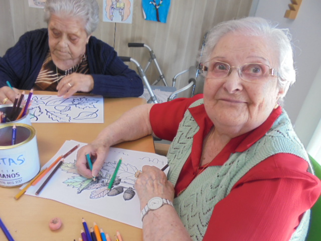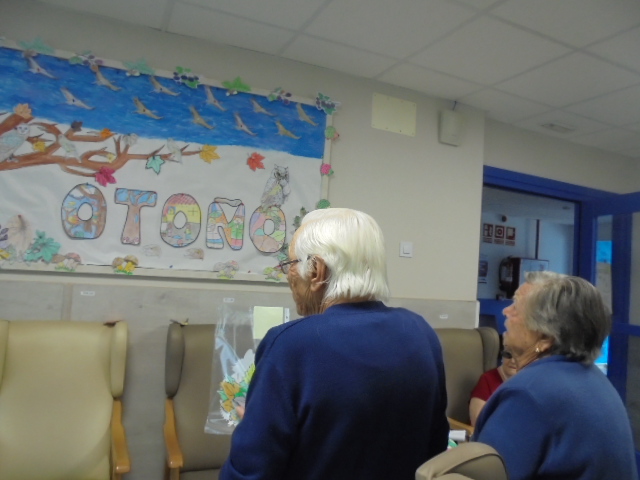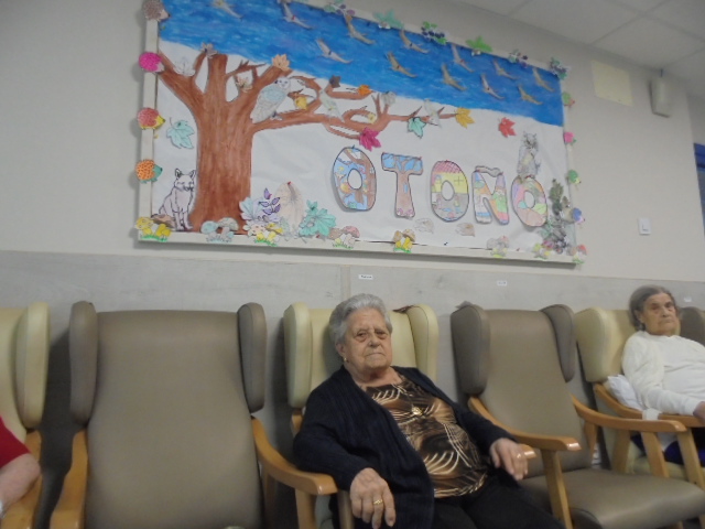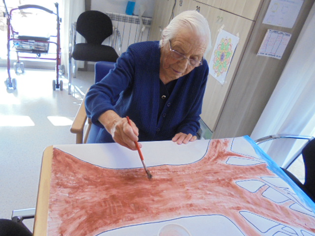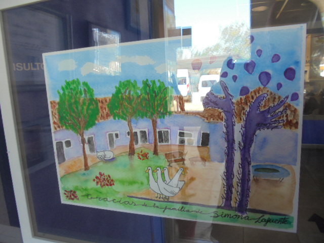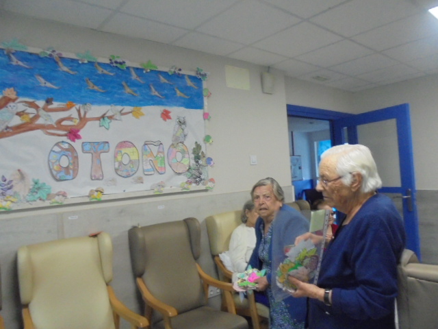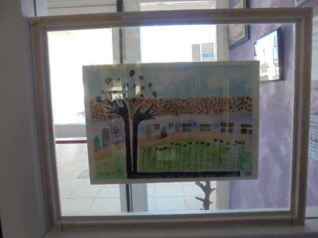 • el regalo de la familia de Simona, un cuadro pintado a mano por ambas caras, que salen nuestras ocas y el logotipo. El nombre de cada trabajadora aparece  en los tallos de las flores y en el tronco del árbol...es precioso y lo hemos puesto en la cristalera de la entrada. Y para hacer las fotos no se aprecia bien lo bonito que es. Gracias, gracias a la nieta de Simona por pintarlo y a su hija y yerno por traerlo hasta nosotras, y sobre todo gracias por habernos dejado cuidar a Simona.