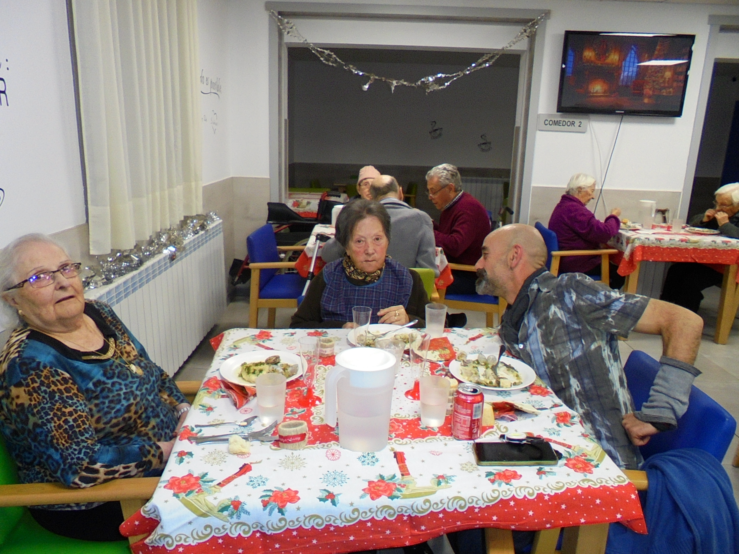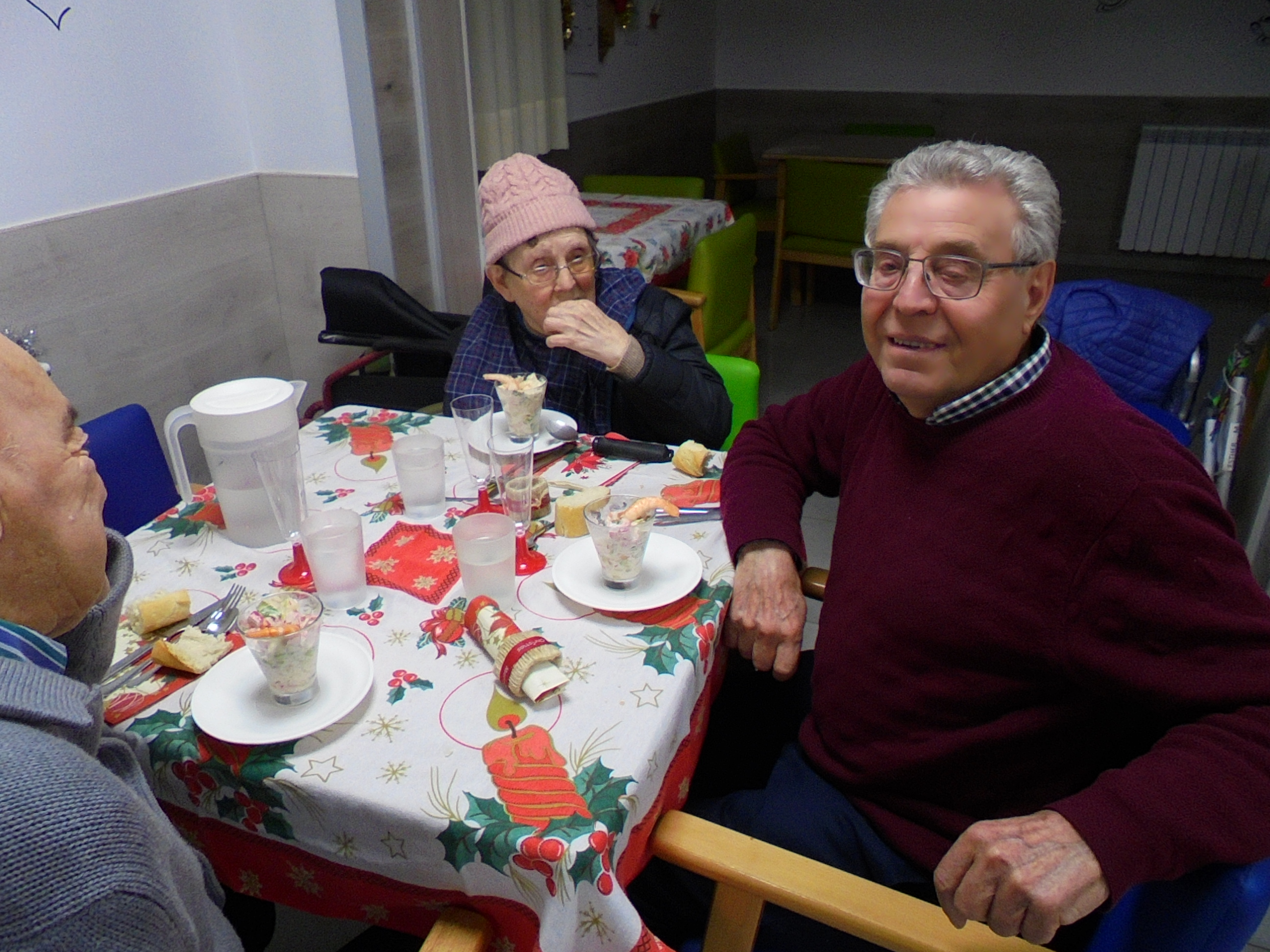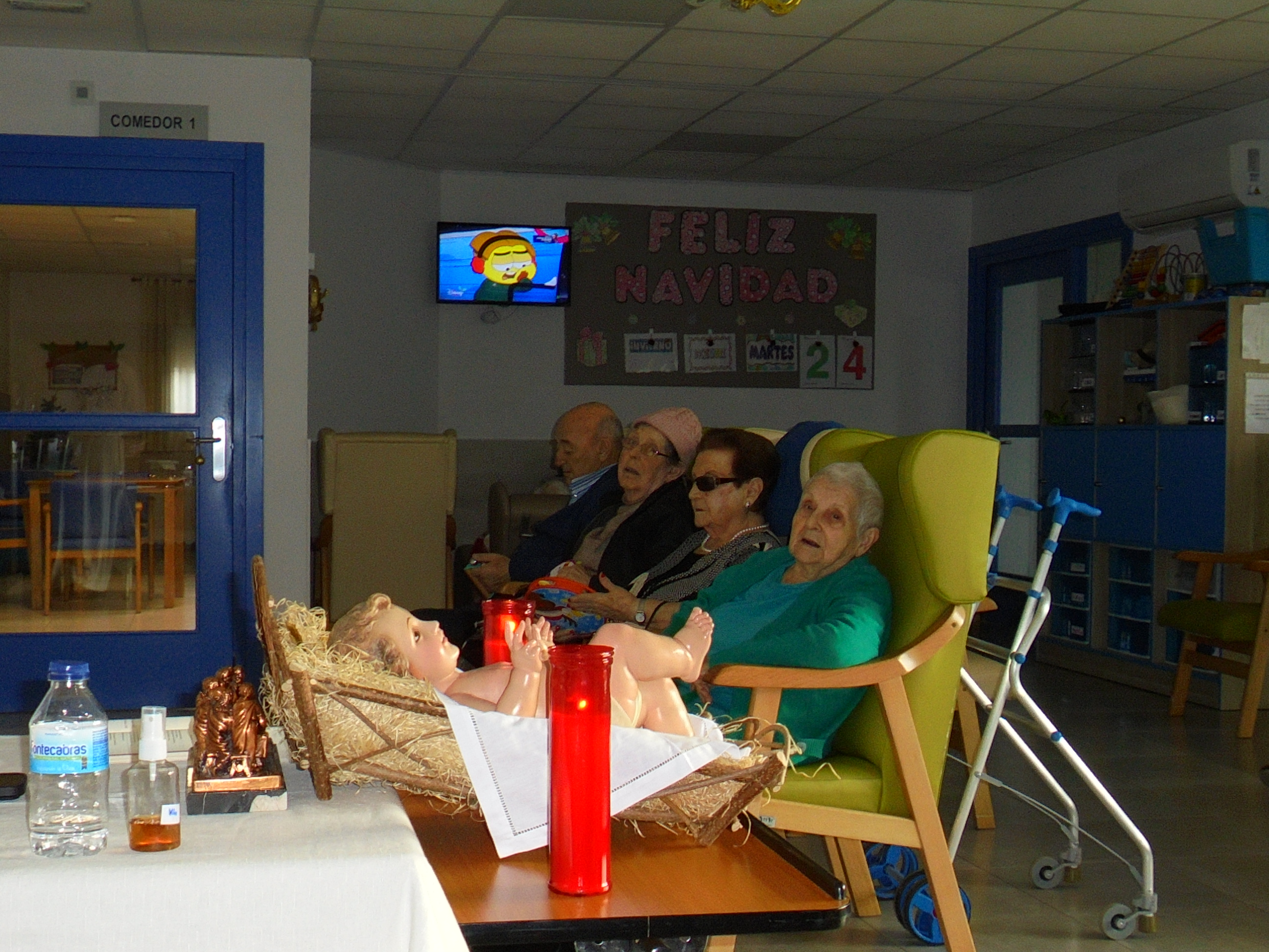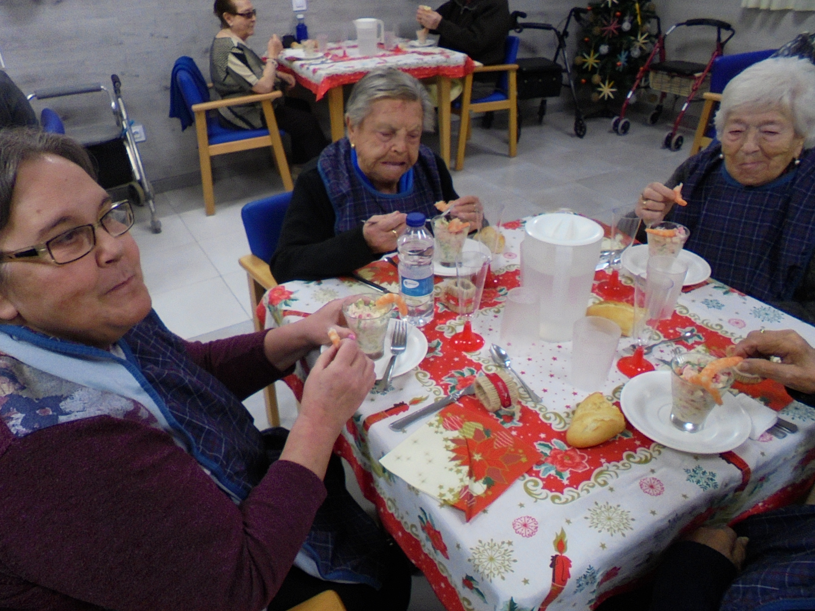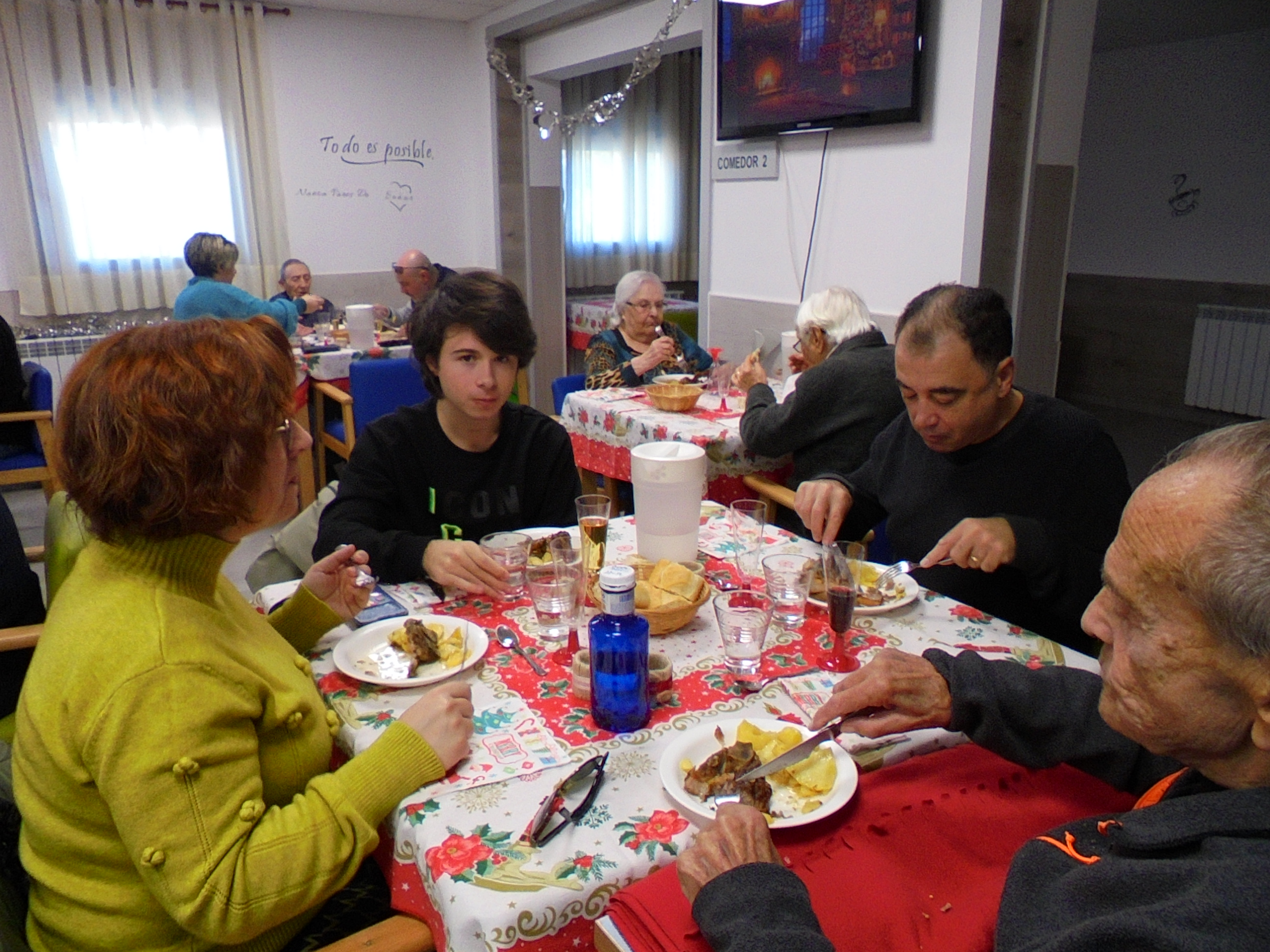 Todos emocionados con la misa de Navidad que nuestro cura Federico nos ofreció en estos días, pudieron besar al Niño Jesús y pasar una mañana muy agradable. Muchas gracias Federico por tu disponibilidad!!! Hemos tenido para la cena de Nochebuena: cóctel de langostinos, merluza en salsa verde, macedonia de frutas al ron y turrones y sidra. Para Navidad:  canapés variados y langostinos, ternasco asado con patatas panaderas, tiramisú, turrones y sidra. Los menús los hablamos con ellos antes de elegirlos y lo que más les apetecía era el ternasco como buenos maños!!!
