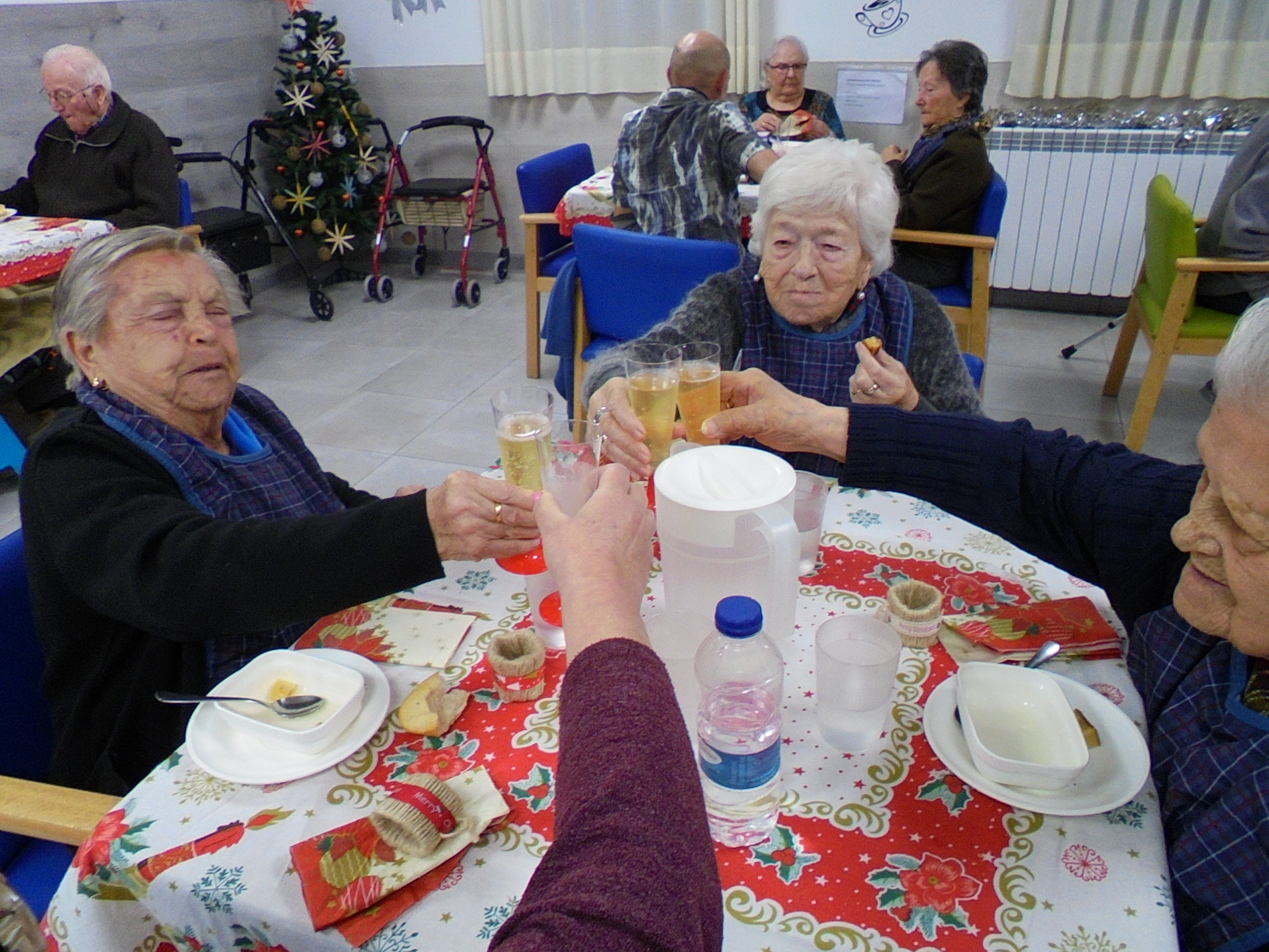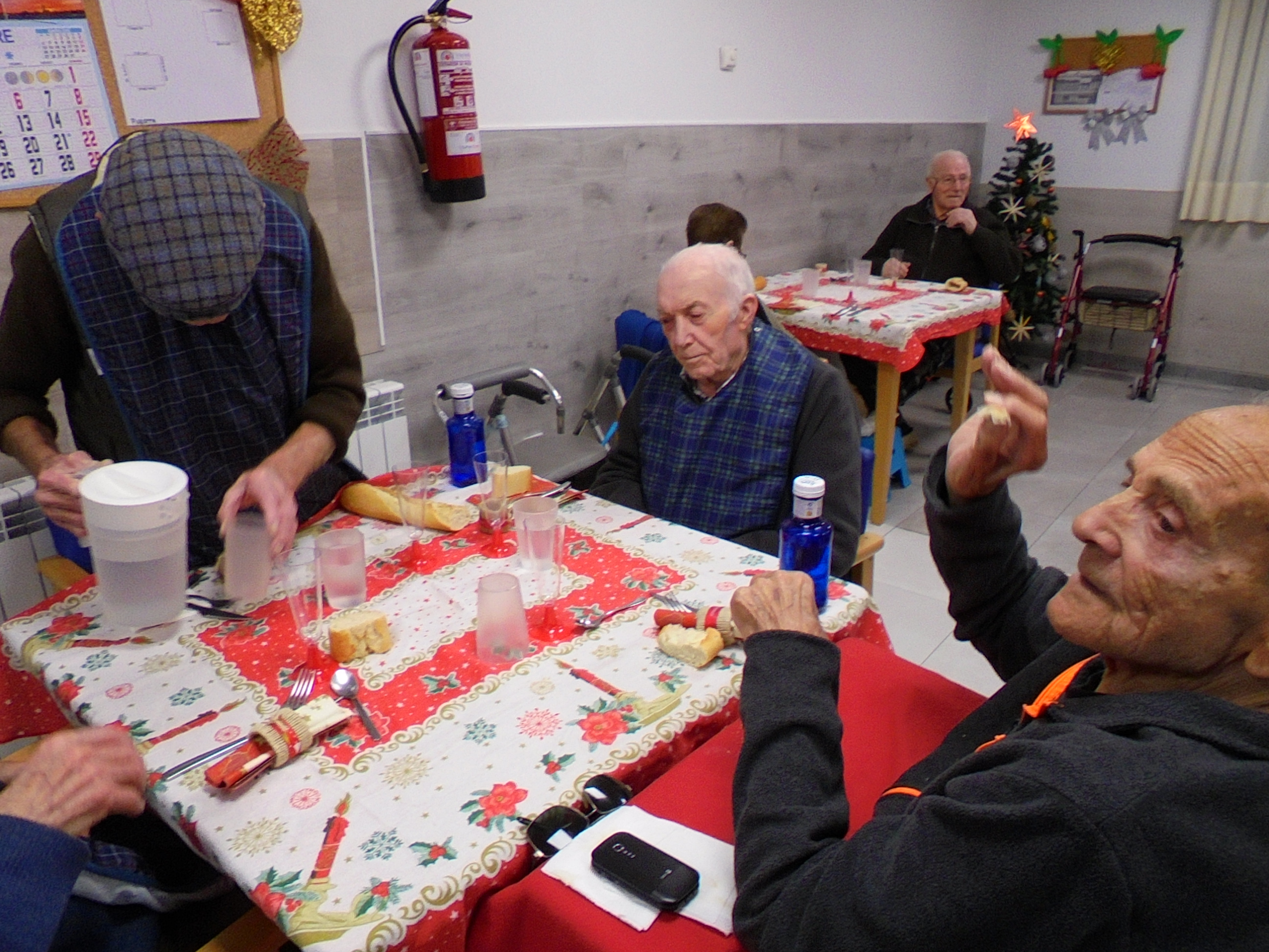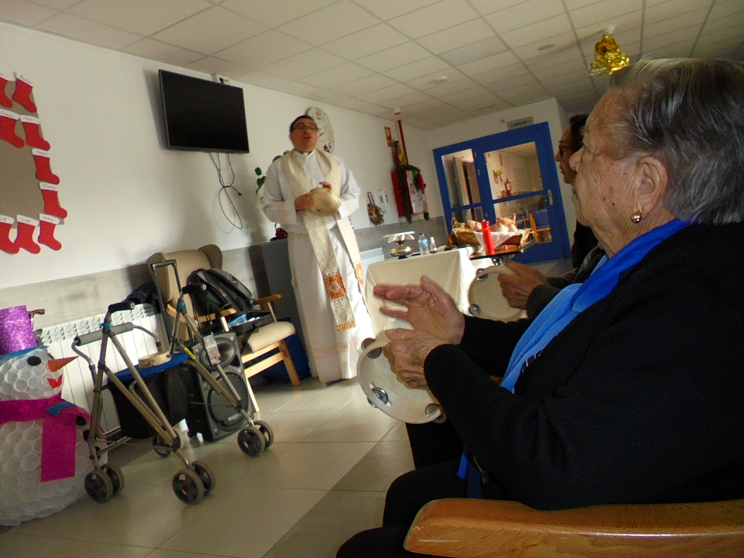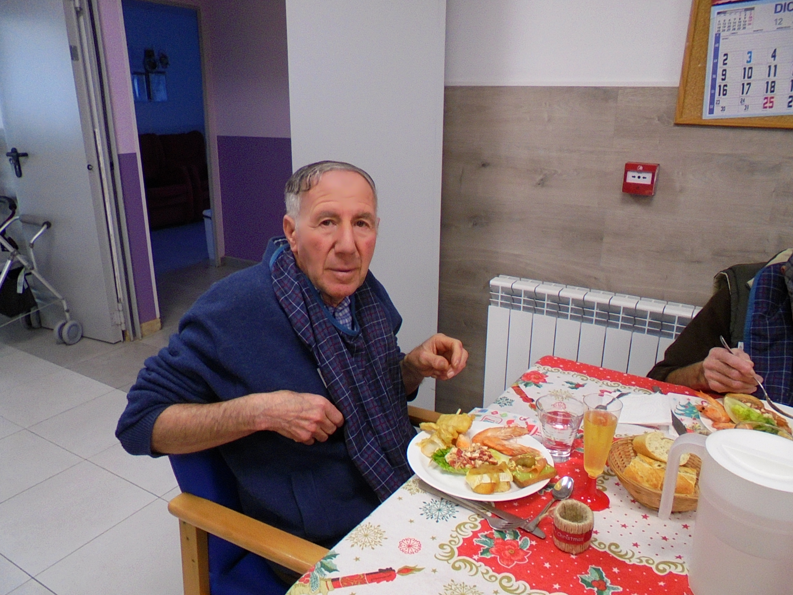 Todos emocionados con la misa de Navidad que nuestro cura Federico nos ofreció en estos días, pudieron besar al Niño Jesús y pasar una mañana muy agradable. Muchas gracias Federico por tu disponibilidad!!! Hemos tenido para la cena de Nochebuena: cóctel de langostinos, merluza en salsa verde, macedonia de frutas al ron y turrones y sidra. Para Navidad:  canapés variados y langostinos, ternasco asado con patatas panaderas, tiramisú, turrones y sidra. Los menús los hablamos con ellos antes de elegirlos y lo que más les apetecía era el ternasco como buenos maños!!!