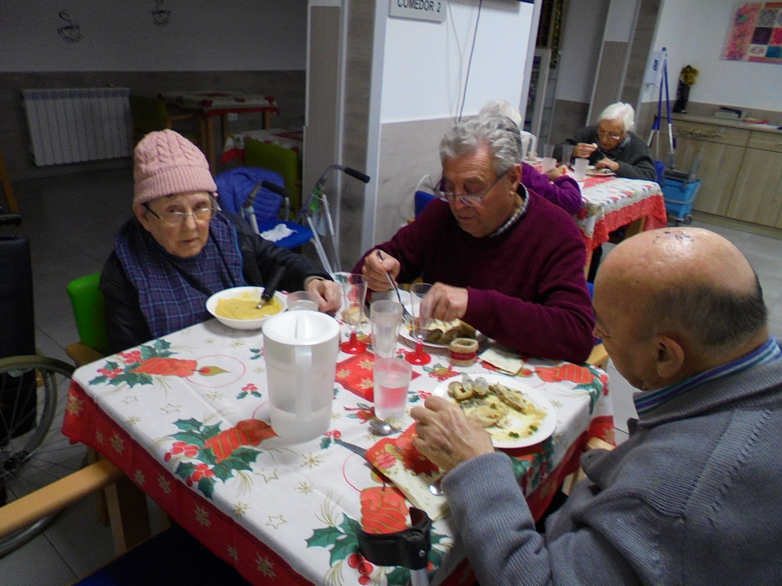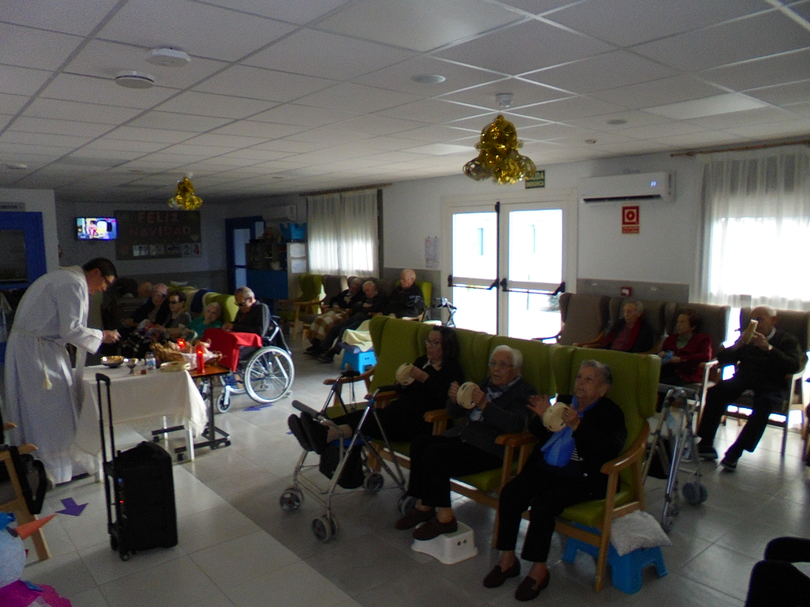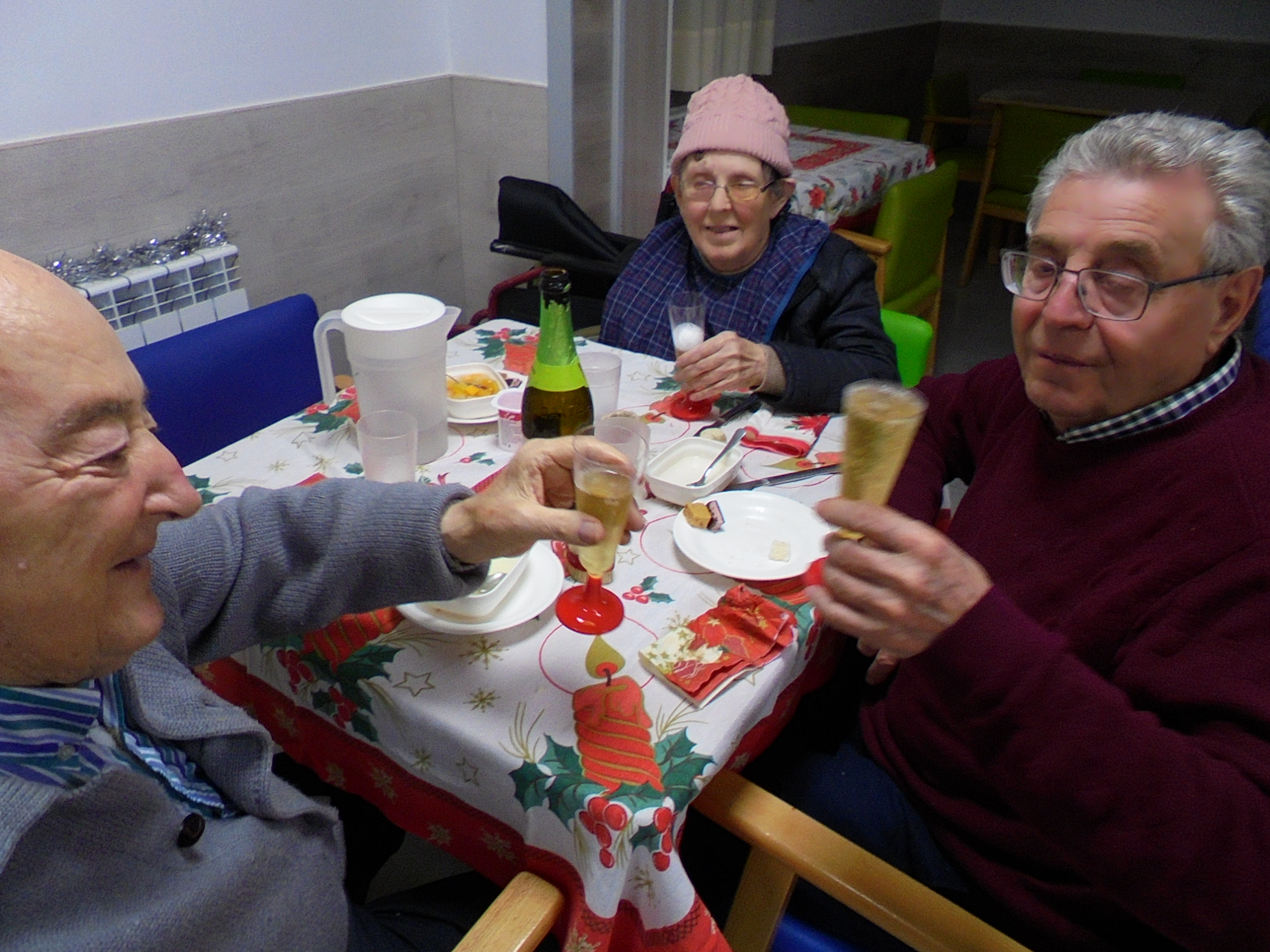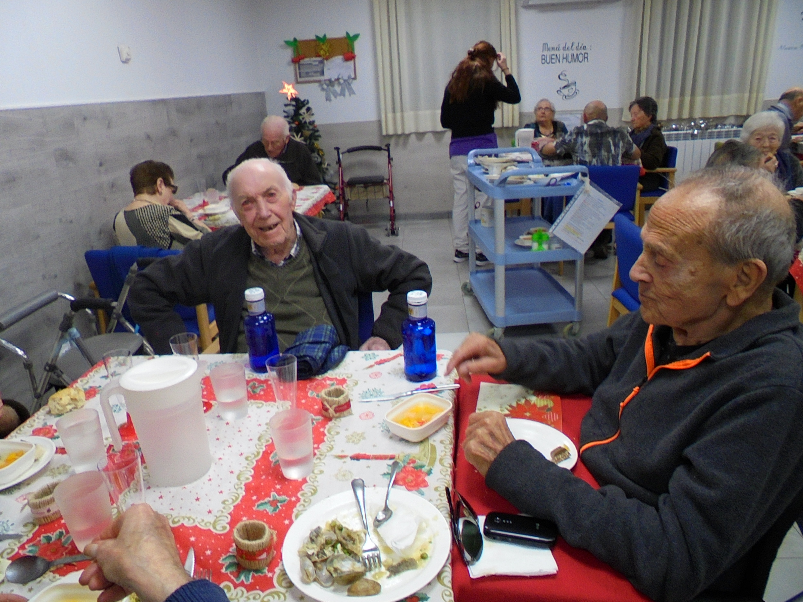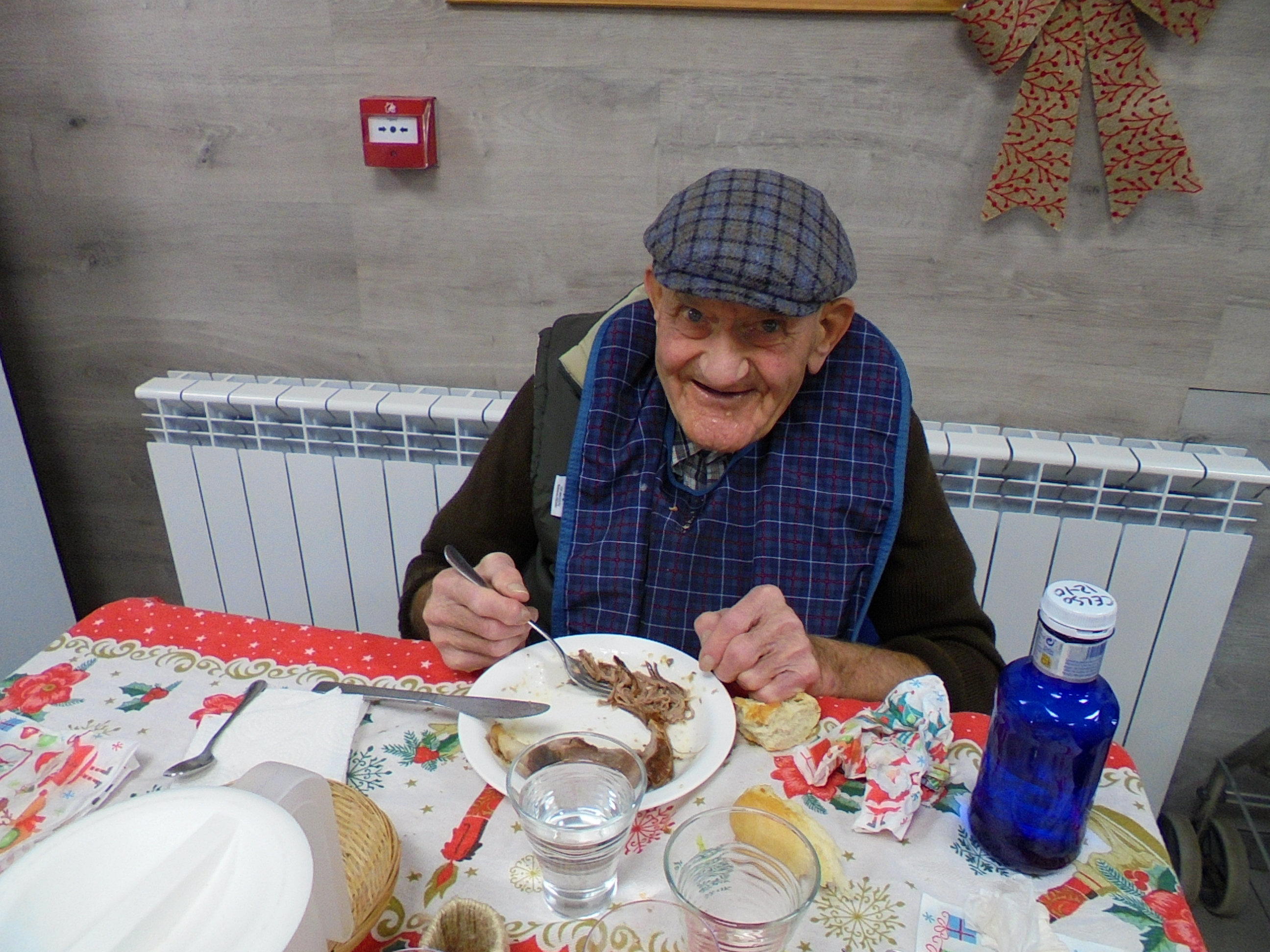 Todos emocionados con la misa de Navidad que nuestro cura Federico nos ofreció en estos días, pudieron besar al Niño Jesús y pasar una mañana muy agradable. Muchas gracias Federico por tu disponibilidad!!! Hemos tenido para la cena de Nochebuena: cóctel de langostinos, merluza en salsa verde, macedonia de frutas al ron y turrones y sidra. Para Navidad:  canapés variados y langostinos, ternasco asado con patatas panaderas, tiramisú, turrones y sidra. Los menús los hablamos con ellos antes de elegirlos y lo que más les apetecía era el ternasco como buenos maños!!!