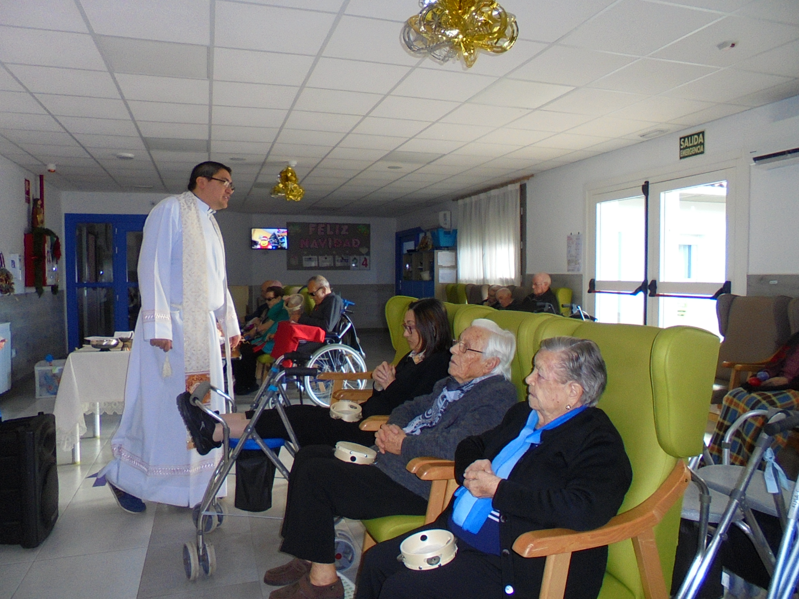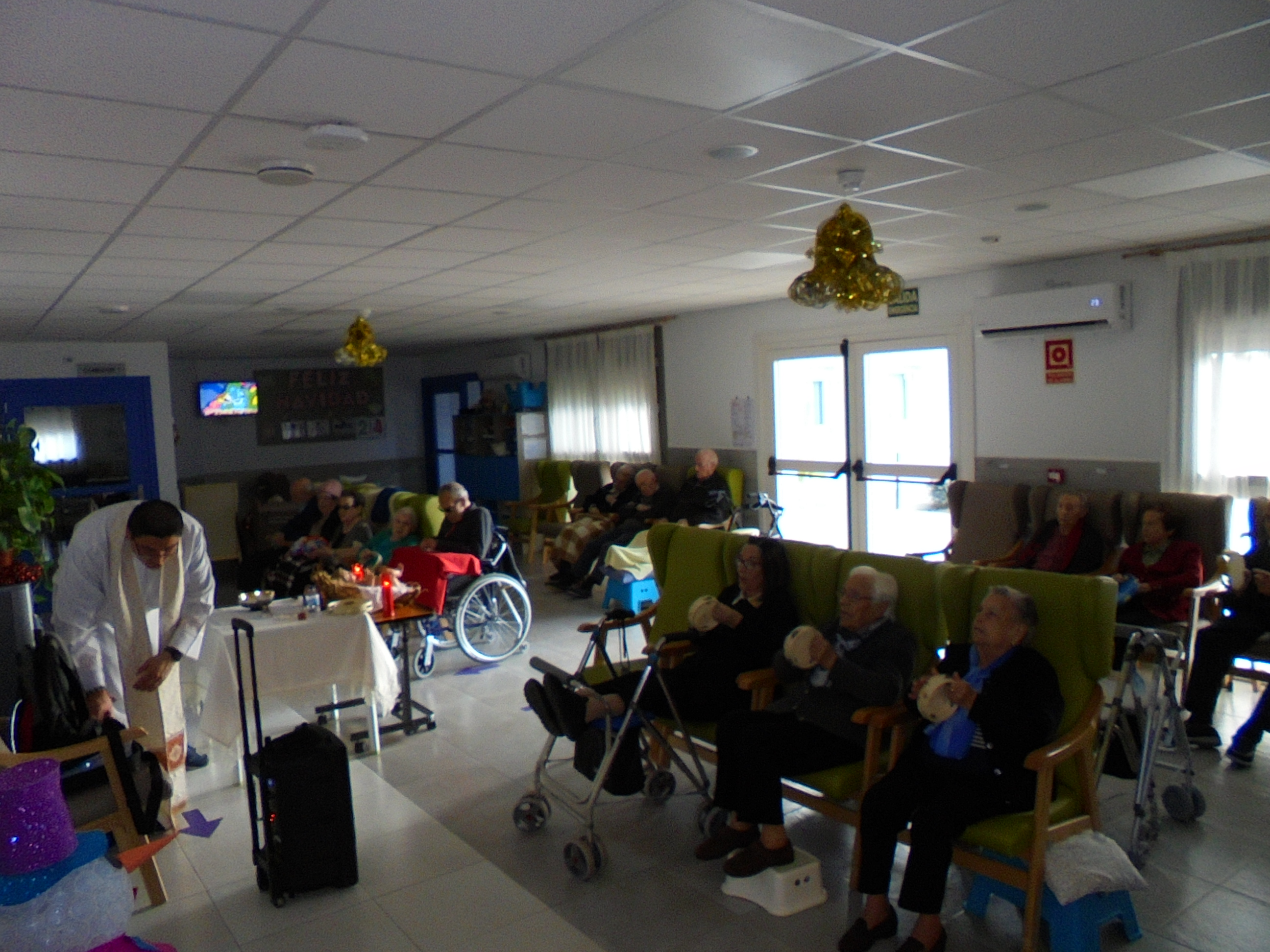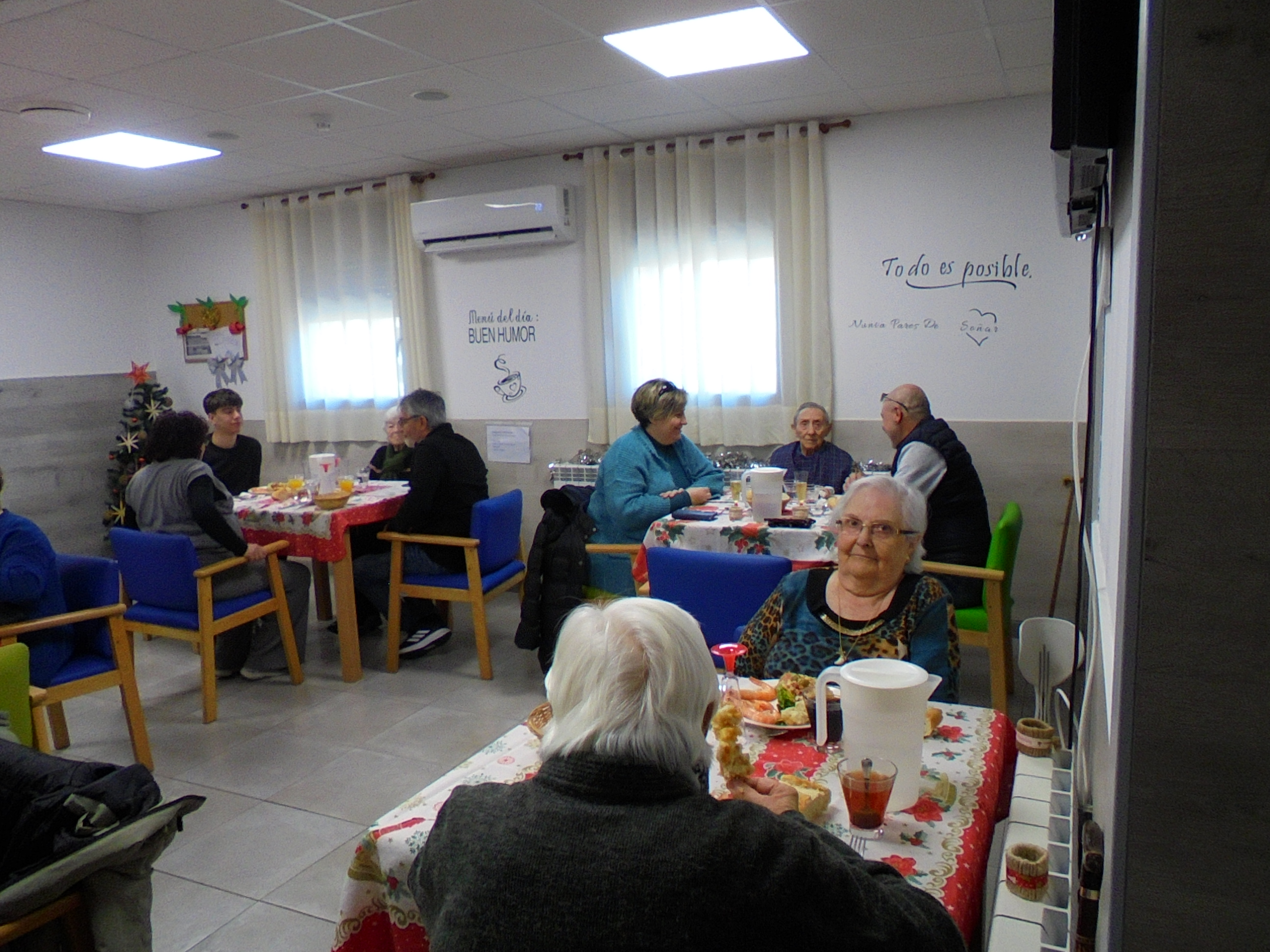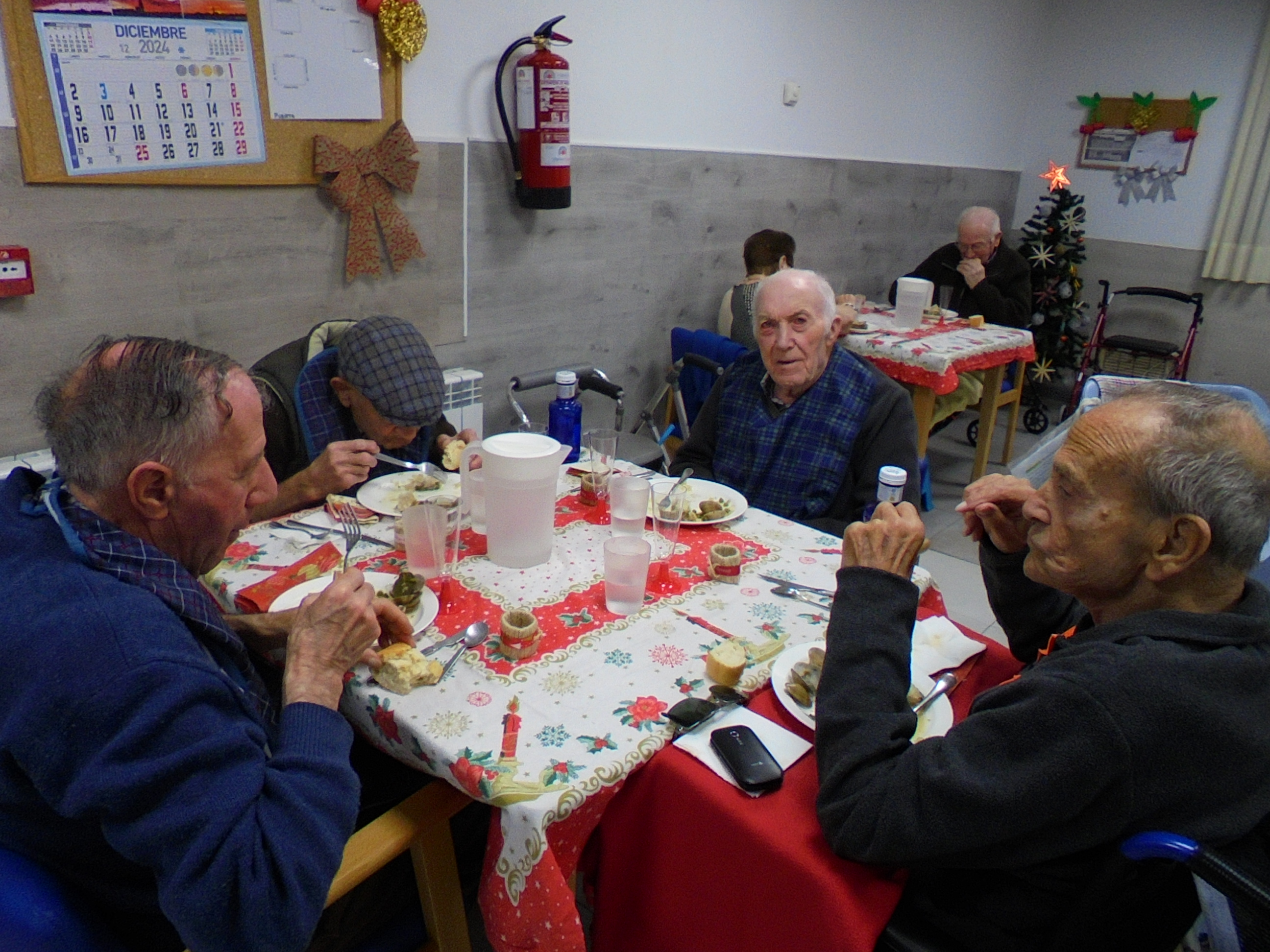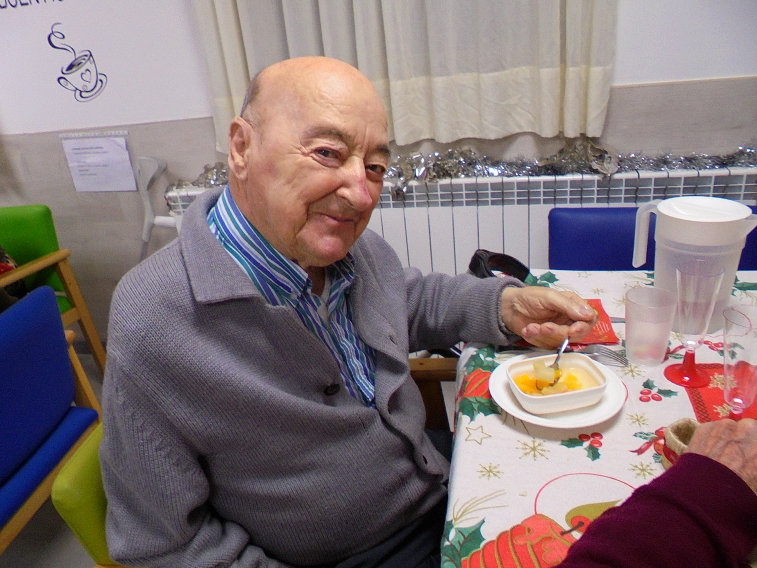 Todos emocionados con la misa de Navidad que nuestro cura Federico nos ofreció en estos días, pudieron besar al Niño Jesús y pasar una mañana muy agradable. Muchas gracias Federico por tu disponibilidad!!! Hemos tenido para la cena de Nochebuena: cóctel de langostinos, merluza en salsa verde, macedonia de frutas al ron y turrones y sidra. Para Navidad:  canapés variados y langostinos, ternasco asado con patatas panaderas, tiramisú, turrones y sidra. Los menús los hablamos con ellos antes de elegirlos y lo que más les apetecía era el ternasco como buenos maños!!!