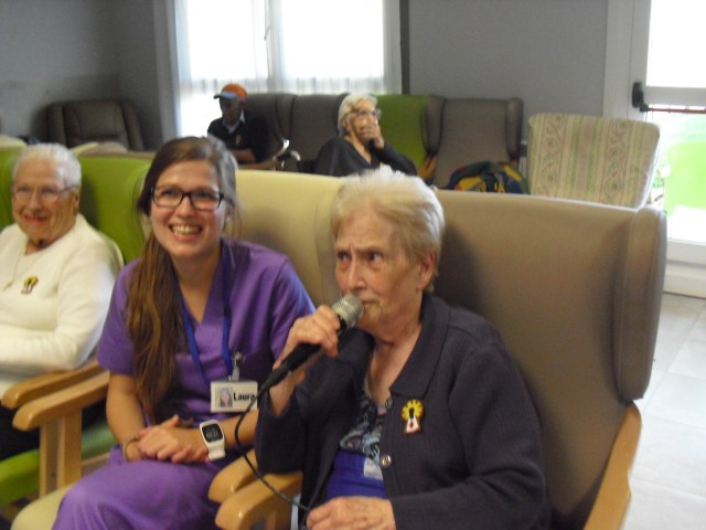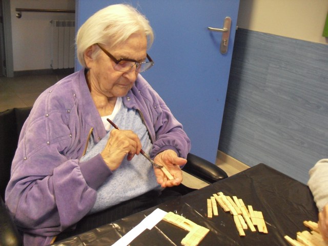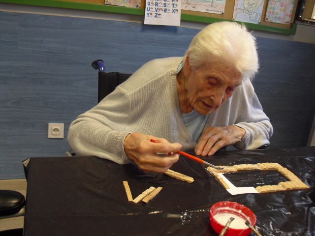 Nos despedimos de Carmen todo el equipo pues siempre fue muy especial, nunca quería estar entre los demás, siempre reclamaba atención exclusiva para ella. Todas nosotras nos la hemos llevado individualmente al despacho, alguna gerocultora hasta en su descanso, a la  enfermería… Nunca conseguimos consolarla del todo pues su gran deterioro cognitivo y la pérdida de su esposo hizo que no quisiera estar con nosotros. Ha tenido suerte de tener una gran familia que la visitaban muy a menudo, la querían muchísimo y ella estaba superfeliz con ellos. Nuestro más sincero pésame y ójala hubiésemos conseguido hacerla sonreír mucho más pues se lo merecía… pero se nos resistió. He rescatado tres momentos en los que estaba feliz, pues con la música se la estimulaba positivamente: en Navidades tocando la pandereta, un día cantando con el  Karaoke y el día de la excursión a Muel que la acompañó uno de sus hijos. El viernes hicimos la excursión a la piscina pero como Carmen no pudo venir al estar ingresada las vamos a poner la próxima semana por respeto. Y vamos a poner unas fotos del taller de los marcos de fotos que han hecho con Laura, la terapéuta ocupacional.